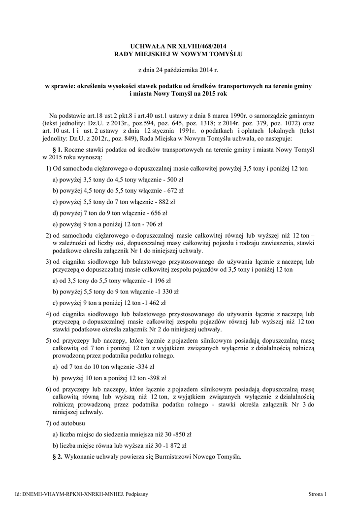 UCHWAŁA NR XLVIII/468/2014 RADY MIEJSKIEJ W NOWYM TOMYŚLU z dnia 24 października 2014 r. w sprawie: określenia wysokości stawek podatku od środków transportowych na terenie gminy i miasta Nowy Tomyśl na 2015 rok Na podstawie art.18 ust.2 pkt.8 i art.40 ust.1 ustawy z dnia 8 marca 1990r. o samorządzie gminnym (tekst jednolity: Dz.U. z 2013r., poz.594, poz. 645, poz. 1318; z 2014r. poz. 379, poz. 1072) oraz art. 10 ust. 1 i ust. 2 ustawy z dnia 12 stycznia 1991r. o podatkach i opłatach lokalnych (tekst jednolity: Dz.U. z 2012r., poz. 849), Rada Miejska w Nowym Tomyślu uchwala, co następuje: § 1. Roczne stawki podatku od środków transportowych na terenie gminy i miasta Nowy Tomyśl w 2015 roku wynoszą: 1) Od samochodu ciężarowego o dopuszczalnej masie całkowitej powyżej 3,5 tony i poniżej 12 ton a) powyżej 3,5 tony do 4,5 tony włącznie - 500 zł b) powyżej 4,5 tony do 5,5 tony włącznie - 672 zł c) powyżej 5,5 tony do 7 ton włącznie - 882 zł d) powyżej 7 ton do 9 ton włącznie - 656 zł e) powyżej 9 ton a poniżej 12 ton - 706 zł 2) od samochodu ciężarowego o dopuszczalnej masie całkowitej równej lub wyższej niż 12 ton – w zależności od liczby osi, dopuszczalnej masy całkowitej pojazdu i rodzaju zawieszenia, stawki podatkowe określa załącznik Nr 1 do niniejszej uchwały. 3) od ciągnika siodłowego lub balastowego przystosowanego do używania łącznie z naczepą lub przyczepą o dopuszczalnej masie całkowitej zespołu pojazdów od 3,5 tony i poniżej 12 ton a) od 3,5 tony do 5,5 tony włącznie -1 196 zł b) powyżej 5,5 tony do 9 ton włącznie -1 330 zł c) powyżej 9 ton a poniżej 12 ton -1 462 zł 4) od ciągnika siodłowego lub balastowego przystosowanego do używania łącznie z naczepą lub przyczepą o dopuszczalnej masie całkowitej zespołu pojazdów równej lub wyższej niż 12 ton stawki podatkowe określa załącznik Nr 2 do niniejszej uchwały. 5) od przyczepy lub naczepy, które łącznie z pojazdem silnikowym posiadają dopuszczalną masę całkowitą od 7 ton i poniżej 12 ton z wyjątkiem związanych wyłącznie z działalnością rolniczą prowadzoną przez podatnika podatku rolnego. a) od 7 ton do 10 ton włącznie -334 zł b) powyżej 10 ton a poniżej 12 ton -398 zł 6) od przyczepy lub naczepy, które łącznie z pojazdem silnikowym posiadają dopuszczalną masę całkowitą równą lub wyższą niż 12 ton, z wyjątkiem związanych wyłącznie z działalnością rolniczą prowadzoną przez podatnika podatku rolnego - stawki określa załącznik Nr 3 do niniejszej uchwały. 7) od autobusu a) liczba miejsc do siedzenia mniejsza niż 30 -850 zł b) liczba miejsc równa lub wyższa niż 30 -1 872 zł § 2. Wykonanie uchwały powierza się Burmistrzowi Nowego Tomyśla. Id: DNEMH-VHAYM-RPKNI-XNRKH-MNHEJ. Podpisany Strona 1 § 3. Uchwała wchodzi w życie po upływie 14 dni od dnia ogłoszenia w Dzienniku Urzędowym Województwa Wielkopolskiego i ma zastosowanie do wymiaru podatku od środków transportowych obowiązującego w roku 2015. Przewodniczący Rady Miejskiej mgr Tomasz Wlekły Id: DNEMH-VHAYM-RPKNI-XNRKH-MNHEJ. Podpisany Strona 2 Uzasadnienie do Uchwały Nr XLVIII / 468 / 2014 Rady Miejskiej w Nowym Tomyślu z dnia 24 października 2014 r. w sprawie: określenia wysokości stawek podatku od środków transportowych na terenie gminy i miasta Nowy Tomyśl na 2015 rok. Stawki określone w uchwale mieszczą się w granicach obwarowanych kwotami określonymi jako minimalne dla pojazdów o których mowa w art.8 ust.1 pkt.2), 4) i 6), zgodnie z obwieszczeniem Ministra Finansów z dnia 10 października 2014 r. w sprawie stawek podatku od środków transportowych obowiązujących w 2015r (M.P., poz. 895). Stawki te w odniesieniu do pojazdów podlegających opodatkowaniu tym podatkiem mieszczą się też w granicach kwot podanych w obwieszczeniu Ministra Finansów z 07 sierpnia 2014r w sprawie górnych granic stawek kwotowych podatków i opłat lokalnych w 2015r. (M.P., poz. 718). Mając na uwadze powyższe, podjęcie uchwały w zaproponowanym brzmieniu jest uzasadnione. Id: DNEMH-VHAYM-RPKNI-XNRKH-MNHEJ. Podpisany Strona 1 Załącznik Nr 1 do Uchwały Nr XLVIII/468 /2014 Rady Miejskiej w Nowym Tomyślu z dnia 24 października 2014r. Stawki podatku od środków transportowych dla samochodów ciężarowych o dopuszczalnej masie całkowitej równej lub wyższej niż 12 ton Liczba osi i dopuszczalna masa całkowita (w tonach) nie mniej niż Stawka podatku (w złotych) mniej niż 1 2 oś jezdna (osie jezdne) z zawieszeniem pneumatycznym lub zawieszeniem uznanym za równoważne 3 Inne systemy zawieszenia osi jezdnych 4 Dwie osie 12 13 14 15 13 14 15 1144 1154 1166 542 1166 1182 1198 1238 1198 1330 1380 1390 1392 992 1220 1354 1482 1560 1728 1544 Trzy osie 12 17 19 21 23 25 17 19 21 23 25 Cztery osie i więcej 12 25 27 29 31 25 27 29 31 Id: DNEMH-VHAYM-RPKNI-XNRKH-MNHEJ. Podpisany 2652 2652 2788 2954 1620 2788 2788 2908 2954 2400 Strona 2 Załącznik Nr 2 do Uchwały Nr XLVIII/468/2014 Rady Miejskiej w Nowym Tomyślu z dnia 24 października 2014r. Stawki podatku od środków transportowych dla ciągników siodłowych i balastowych przystosowanych do używania łącznie z naczepą lub przyczepą o dopuszczalnej masie całkowitej zespołu pojazdów równej lub wyższej niż 12 ton Liczba osi dopuszczalna masa całkowita zespołu pojazdów: ciągnik siodłowy + naczepa, ciągnik balastowy + przyczepa (w tonach) nie mniej niż mniej niż 1 2 12 18 25 31 18 25 31 12 40 40 Stawka podatku (w złotych) oś jezdna (osie jezdne) z Inne systemy zwieszenia osi zawieszeniem pneumatycznym lub jezdnych zwieszeniem uznanym za równoważne 3 4 dwie osie Id: DNEMH-VHAYM-RPKNI-XNRKH-MNHEJ. Podpisany 1328 1338 1346 1384 trzy osie i więcej 1594 1702 1506 1558 1624 1914 2230 2496 Strona 3 Załącznik Nr 3 do Uchwały Nr XLVIII/468/2014 Rady Miejskiej w Nowym Tomyślu z dnia 24 października 2014r. Stawki podatku od środków transportowych dla przyc