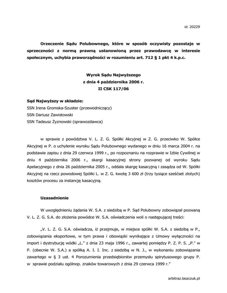 id: 20229 Orzeczenie Sądu Polubownego, które w sposób oczywisty pozostaje w sprzeczności z normą prawną ustanowioną przez prawodawcę w interesie społecznym, uchybia praworządności w rozumieniu art. 712 § 1 pkt 4 k.p.c. Wyrok Sądu Najwyższego z dnia 4 października 2006 r. II CSK 117/06 Sąd Najwyższy w składzie: SSN Irena Gromska-Szuster (przewodniczący) SSN Dariusz Zawistowski SSN Tadeusz Żyznowski (sprawozdawca) w sprawie z powództwa V. L. Z. G. Spółki Akcyjnej w Z. G. przeciwko W. Spółce Akcyjnej w P. o uchylenie wyroku Sądu Polubownego wydanego w dniu 16 marca 2004 r. na podstawie zapisu z dnia 29 czerwca 1999 r., po rozpoznaniu na rozprawie w Izbie Cywilnej w dniu 4 października 2006 r., skargi kasacyjnej strony pozwanej od wyroku Sądu Apelacyjnego z dnia 26 października 2005 r., oddala skargę kasacyjną i zasądza od W. Spółki Akcyjnej na rzecz powodowej Spółki L. w Z. G. kwotę 3 600 zł (trzy tysiące sześćset złotych) kosztów procesu za instancję kasacyjną. Uzasadnienie W uwzględnieniu żądania W. S.A. z siedzibą w P. Sąd Polubowny zobowiązał pozwaną V. L. Z. G. S.A. do złożenia powódce W. S.A. oświadczenia woli o następującej treści: „V. L. Z. G. S.A. oświadcza, iż przejmuje, w miejsce spółki W. S.A. z siedzibą w P., zobowiązania eksportowe, w tym prawa i obowiązki wynikające z Umowy wyłączności na import i dystrybucję wódki „L." z dnia 23 maja 1996 r., zawartej pomiędzy P. Z. P. S. „P." w P. (obecnie W. S.A.) a spółką A. I. I. Inc. z siedzibą w N. J., w wykonaniu zobowiązania zawartego w § 3 ust. 4 Porozumienia przedsiębiorstw przemysłu spirytusowego grupy P. w sprawie podziału ogólnop. znaków towarowych z dnia 29 czerwca 1999 r.” arbitraz.laszczuk.pl Podstawę rozstrzygnięcia Sądu Polubownego stanowiły następujące ustalenia: Powódka W. S.A, działająca wcześniej pod nazwą P. Z. P. S. „P." w P., zawarła w dniu 23 maja 1996 r. ze spółką A. I. I. Inc. umowę o wyłączność na import i dystrybucję W. L. na terytorium USA, na okres 10 lat, z możliwością przedłużenia jej na kolejne lata. Umowa ta była przez strony realizowana zgodnie z jej postanowieniami. Warunkiem wejścia w życie powyższej umowy było podpisanie przez A. H. S.A. i powódkę umowy przyrzeczenia dokonania przeniesienia praw do znaku towarowego W. „L." w Stanach Zjednoczonych ze spółki A. H. S.A. na powódkę. Powyższa umowa przyrzeczenia przeniesienia znaku W. L. została podpisana w dniu 28 czerwca 1996 r. Przeniesienie praw do znaku towarowego W. L. nastąpiło na mocy umów podpisanych pomiędzy A. H. S.A. oraz powódkę w 1999 roku. W dniu 29 czerwca 1999 r. doszło, pod nadzorem Ministra Skarbu Państwa, do zawarcia umowy wielostronnej - Porozumienia przedsiębiorstw przemysłu spirytusowego grupy P. w sprawie podziału ogólnop. znaków towarowych, które zostało podpisane przez 25 przedsiębiorstw. Porozumienie to określało zasady dokonania podziału praw z rejestracji kolejnych znaków towarowych oraz jego konsekwencje faktyczne i prawne. W następstwie zawarcia Porozumienia przedsiębiorstw przemysłu spirytusowego grupy P. w sprawie podziału ogólnop. znaków towarowych oraz zorganizowanego w wykonaniu tego Porozumienia przez Ministra Skarbu Państwa przetargu na poszczególne znaki towarowe, podmiotem uprawnionym do znaku towarowego W. L. została pozwana. Również w następstwie tego Porozumienia w dniu 28 sierpnia 1999 r. strony zawarły umowę licencyjną, na mocy której pozwana udzieliła powódce jednorocznej licencji na używanie znaku towarowego W. L. na terenie Polski przez okres przejściowy jednego roku tj. do momentu pełnego przejścia praw i zobowiązań z uzyskanych w wyniku przetargu znaków. Do czasu uzyskania przez pozwaną praw do znaku towarowego W. L. powódka była wyłącznym eksporterem W. L. na rynek amerykański, gdzie korzystała ze znaku słowno-graficznego W. L., który nabyła od spółki A. H. S.A., w wyniku zawarcia umowy przyrzeczenia z dnia 28 czerwca 1996 r. Po ostatecznym przeniesieniu przez A. H. S.A. praw do tego znaku towarowego na powódkę, powódka 8 sierpnia 2000 r. scedowała go ostatecznie na pozwaną. W ten sposób pozwana uzyskała wyłączne prawo do znaku towarowego W. L., zarówno na terenie Polski, jak i USA. Od tej chwili dostarcza nieprzerwanie W. L. do USA. Pozwana odmówiła przejęcia Umowy wyłączności na import i dystrybucję z czerwca 1996 roku, powołując się na fakt, iż umowa ta zawiera niekorzystne dla niej postanowienia, a w szczególności zapis, który przewiduje, w przypadku jej rozwiązania, zwrot wydatków poniesionych przez importera na marketing, promocję, reklamę, związanych z budową marki W. L. w USA za okres ostatnich 5 lat arbitraz.laszczuk.pl ważności tej Umowy. A. I. I. Inc. wyraziła zgodę na przejęcie przez pozwaną praw i obowiązków spółki W. S.A. wynikających z Umowy wyłączności na import i dystrybucję. A. I. I. Inc. wniosła do Sądu Arbitrażowego przy Krajowej Izbie Gospodarczej w Warszawie, pozew przeciwko W. S.A. o zapłatę kwoty 23.237.950,00 PLN tytułem zwrotu wydatków poniesionych na reklamę, promocję i marketing, związanych z budową pozycji marki W. L. na terenie USA w okresie od 23 maja 1996 r. do 30 lipca 2000 r. Umowa wyłączności na import i dystrybucję wódki L. była realizowana przez pozwaną po zawarciu Porozumienia przedsiębiorstw przemysłu spirytusowego grupy P. w sprawie podziału ogólnop. znaków towarowych. Sąd Polubowny uznał, iż spór pomiędzy stronami dotyczył kwestii prawnej i sprowadzał się do udzielenia odpowiedzi na pytanie czy w związku z przystąpieniem do Porozumienia przedsiębiorstw grupy P. w sprawie ogólnop. znaków towarowych pozwana jest zobowiązana do przejęcia zobowiązań eksportowych powódki, a w szczególności Umowy wyłączności na import i dystrybucję z dnia 23 maja 1996 r. W ocenie Sądu Polubownego powództwo z
