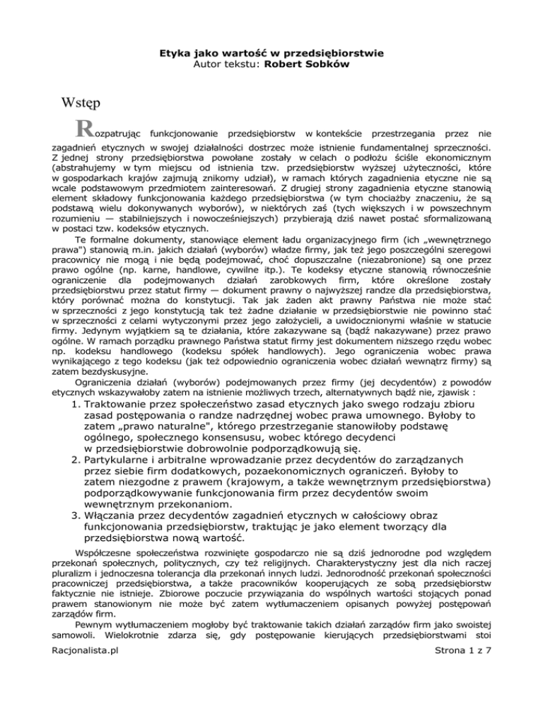 Etyka jako wartość w przedsiębiorstwie Autor tekstu: Robert Sobków Wstęp R ozpatrując funkcjonowanie przedsiębiorstw w kontekście przestrzegania przez nie zagadnień etycznych w swojej działalności dostrzec może istnienie fundamentalnej sprzeczności. Z jednej strony przedsiębiorstwa powołane zostały w celach o podłożu ściśle ekonomicznym (abstrahujemy w tym miejscu od istnienia tzw. przedsiębiorstw wyższej użyteczności, które w gospodarkach krajów zajmują znikomy udział), w ramach których zagadnienia etyczne nie są wcale podstawowym przedmiotem zainteresowań. Z drugiej strony zagadnienia etyczne stanowią element składowy funkcjonowania każdego przedsiębiorstwa (w tym chociażby znaczeniu, że są podstawą wielu dokonywanych wyborów), w niektórych zaś (tych większych i w powszechnym rozumieniu — stabilniejszych i nowocześniejszych) przybierają dziś nawet postać sformalizowaną w postaci tzw. kodeksów etycznych. Te formalne dokumenty, stanowiące element ładu organizacyjnego firm (ich „wewnętrznego prawa") stanowią m.in. jakich działań (wyborów) władze firmy, jak też jego poszczególni szeregowi pracownicy nie mogą i nie będą podejmować, choć dopuszczalne (niezabronione) są one przez prawo ogólne (np. karne, handlowe, cywilne itp.). Te kodeksy etyczne stanowią równocześnie ograniczenie dla podejmowanych działań zarobkowych firm, które określone zostały przedsiębiorstwu przez statut firmy — dokument prawny o najwyższej randze dla przedsiębiorstwa, który porównać można do konstytucji. Tak jak żaden akt prawny Państwa nie może stać w sprzeczności z jego konstytucją tak też żadne działanie w przedsiębiorstwie nie powinno stać w sprzeczności z celami wytyczonymi przez jego założycieli, a uwidocznionymi właśnie w statucie firmy. Jedynym wyjątkiem są te działania, które zakazywane są (bądź nakazywane) przez prawo ogólne. W ramach porządku prawnego Państwa statut firmy jest dokumentem niższego rzędu wobec np. kodeksu handlowego (kodeksu spółek handlowych). Jego ograniczenia wobec prawa wynikającego z tego kodeksu (jak też odpowiednio ograniczenia wobec działań wewnątrz firmy) są zatem bezdyskusyjne. Ograniczenia działań (wyborów) podejmowanych przez firmy (jej decydentów) z powodów etycznych wskazywałoby zatem na istnienie możliwych trzech, alternatywnych bądź nie, zjawisk : 1. Traktowanie przez społeczeństwo zasad etycznych jako swego rodzaju zbioru zasad postępowania o randze nadrzędnej wobec prawa umownego. Byłoby to zatem „prawo naturalne", którego przestrzeganie stanowiłoby podstawę ogólnego, społecznego konsensusu, wobec którego decydenci w przedsiębiorstwie dobrowolnie podporządkowują się. 2. Partykularne i arbitralne wprowadzanie przez decydentów do zarządzanych przez siebie firm dodatkowych, pozaekonomicznych ograniczeń. Byłoby to zatem niezgodne z prawem (krajowym, a także wewnętrznym przedsiębiorstwa) podporządkowywanie funkcjonowania firm przez decydentów swoim wewnętrznym przekonaniom. 3. Włączania przez decydentów zagadnień etycznych w całościowy obraz funkcjonowania przedsiębiorstw, traktując je jako element tworzący dla przedsiębiorstwa nową wartość. Współczesne społeczeństwa rozwinięte gospodarczo nie są dziś jednorodne pod względem przekonań społecznych, politycznych, czy też religijnych. Charakterystyczny jest dla nich raczej pluralizm i jednoczesna tolerancja dla przekonań innych ludzi. Jednorodność przekonań społeczności pracowniczej przedsiębiorstwa, a także pracowników kooperujących ze sobą przedsiębiorstw faktycznie nie istnieje. Zbiorowe poczucie przywiązania do wspólnych wartości stojących ponad prawem stanowionym nie może być zatem wytłumaczeniem opisanych powyżej postępowań zarządów firm. Pewnym wytłumaczeniem mogłoby być traktowanie takich działań zarządów firm jako swoistej samowoli. Wielokrotnie zdarza się, gdy postępowanie kierujących przedsiębiorstwami stoi Racjonalista.pl Strona 1 z 7 w sprzeczności z interesem firm. Może to być działanie nieświadome, bądź świadome, np. egoistyczne przedkładanie własnych, osobistych interesów decydentów ponad interes kierowanych przez siebie firm. Bodźcem do takiego działania może być też jednak altruistyczne poczucie właściwości podejmowanych decyzji nawet przy świadomości szkodliwości takiej decyzji dla interesu przedsiębiorstwa. To „ludzie tworzą przedsiębiorstwa" ze wszystkimi tego pozytywnymi jak i negatywnymi konsekwencjami. Takie jak powyżej przedstawienie wytłumaczenia działań „etycznych" zarządów firm ma jednak bardzo pesymistyczny wydźwięk. Postępowanie w sferze etyki, wprowadzanie zasad etycznych do przedsiębiorstw byłoby zatem samowolą decydentów, usprawiedliwianą co najwyżej szczytnością ich intencji. Gdyby jednak etyczne postępowanie zarządzających traktować jako tworzenie pewnej nowej, wewnętrznej wartości w firmie, to wszelkiego rodzaju działania i związane z nimi koszty i utrudnienia bieżącego funkcjonowania przedsiębiorstw stałyby się uzasadnione. Tak samo jak uzasadnione wydają się wydatki na reklamę, zakup nowych środków trwałych, czy wdrażanie nowego oprogramowania komputerowego. Wymiar czasowy działalności przedsiębiorstwa Przedsiębiorstwa w swojej działalności kierują się maksymalizacją efektu gospodarczego, który najczęściej rozumiany jest jako maksymalizacja zysku. Do tego zostały powołane decyzją swoich inwestorów. Oczekują oni przede wszystkim pomnożenia zainwestowanych przez siebie kapitałów, spółkom pozostawiając strategię osiągnięcia tego celu. Z dochodzenia doń okresowo też inwestorzy rozliczają kadrę zarządzającą firm (na posiedzeniach Rad Nadzorczych, czy na Walnych Zgromadzeniach Wspólników, czy w jeszcze prostszy sposób — kupując bądź sprzedając ich akcje na giełdzie). Zarządy sp