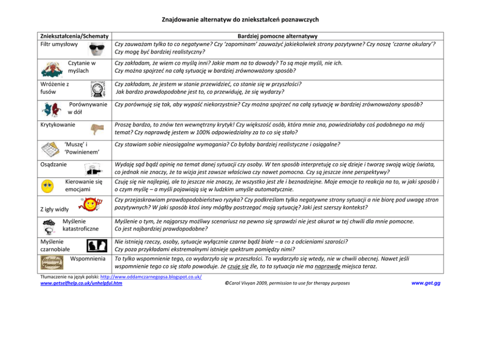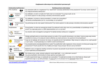 Znajdowanie alternatyw do zniekształceń poznawczych Zniekształcenia/Schematy Bardziej pomocne alternatywy Filtr umysłowy Czy zauważam tylko to co negatywne? Czy ‘zapominam’ zauważyć jakiekolwiek strony pozytywne? Czy noszę ‘czarne okulary’? Czy mogę być bardziej realistyczny? Czytanie w myślach Wróżenie z fusów Czy zakładam, że wiem co myślą inni? Jakie mam na to dowody? To są moje myśli, nie ich. Czy można spojrzeć na całą sytuację w bardziej zrównoważony sposób? Czy zakładam, że jestem w stanie przewidzieć, co stanie się w przyszłości? Jak bardzo prawdopodobne jest to, co przewiduję, że się wydarzy? Porównywanie w dół Krytykowanie ‘Muszę’ i ‘Powinienem’ Osądzanie Czy porównuję się tak, aby wypaść niekorzystnie? Czy można spojrzeć na całą sytuację w bardziej zrównoważony sposób? Proszę bardzo, to znów ten wewnętrzny krytyk! Czy większość osób, która mnie zna, powiedziałaby coś podobnego na mój temat? Czy naprawdę jestem w 100% odpowiedzialny za to co się stało? Czy stawiam sobie nieosiągalne wymagania? Co byłoby bardziej realistyczne i osiągalne? Wydaję sąd bądź opinię na temat danej sytuacji czy osoby. W ten sposób interpretuję co się dzieje i tworzę swoją wizję świata, co jednak nie znaczy, że ta wizja jest zawsze właściwa czy nawet pomocna. Czy są jeszcze inne perspektywy? Kierowanie się emocjami Czuję się nie najlepiej, ale to jeszcze nie znaczy, że wszystko jest złe i beznadziejne. Moje emocje to reakcja na to, w jaki sposób i o czym myślę – a myśli pojawiają się w ludzkim umyśle automatycznie. Czy przejaskrawiam prawdopodobieństwo ryzyka? Czy podkreślam tylko negatywne strony sytuacji a nie biorę pod uwagę stron pozytywnych? W jaki sposób ktoś inny mógłby postrzegać moją sytuację? Jaki jest szerszy kontekst? Z igły widły Myślenie katastroficzne Myślenie czarnobiałe Wspomnienia Myślenie o tym, że najgorszy możliwy scenariusz na pewno się sprawdzi nie jest akurat w tej chwili dla mnie pomocne. Co jest najbardziej prawdopodobne? Nie istnieją rzeczy, osoby, sytuacje wyłącznie czarne bądź białe – a co z odcieniami szarości? Czy poza przykładami ekstremalnymi istnieje spektrum pomiędzy nimi? To tylko wspomnienie tego, co wydarzyło się w przeszłości. To wydarzyło się wtedy, nie w chwili obecnej. Nawet jeśli wspomnienie tego co się stało powoduje. że czuję się źle, to ta sytuacja nie ma naprawdę miejsca teraz. Tłumaczenie na język polski: http://www.oddamczarnegopsa.blogspot.co.uk/ www.getselfhelp.co.uk/unhelpful.htm ©Carol Vivyan 2009, permission to use for therapy purposes www.get.gg
