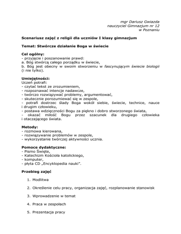mgr Dariusz Gwiazda nauczyciel Gimnazjum nr 12 w Poznaniu Scenariusz zajęć z religii dla uczniów I klasy gimnazjum Temat: Stwórcze działanie Boga w świecie Cel ogólny: - przyjęcie i poszanowanie prawd: a. Bóg stwórcą całego porządku w świecie, b. Bóg jest obecny w swoim stworzeniu w fascynującym świecie biologii (i nie tylko). Umiejętności: Uczeń potrafi: - czytać tekst ze zrozumieniem, - rozpoznawać intencje nadawcze, - twórczo rozwiązywać problemy, argumentować, - skutecznie porozumiewać się w zespole, - potrafi dostrzec ślady Boga wokół siebie, świecie, technice, nauce i drugim człowieku, - postawa wdzięczności Bogu za piękno i dobro stworzonego świata, - okazać miłość Bogu przez szacunek dla drugiego człowieka i otaczającego świata. Metody: - rozmowa kierowana, - rozwiązywanie problemów w zespole, - wykorzystanie twórczej aktywności ucznia. Pomoce dydaktyczne: - Pismo Święte, - Katechizm Kościoła katolickiego, - komputer, - płyta CD „Encyklopedia nauki”. Przebieg zajęć 1. Modlitwa 2. Określenie celu pracy, organizacja zajęć, rozplanowanie stanowisk 3. Wprowadzenie w temat 4. Praca w zespołach 5. Prezentacja pracy 6. Refleksja: - Czego nauczyłem się na dzisiejszej lekcji? - Co sprawiło mi trudności? - Co przyniosło zadowolenie? 7. Notatka 8. Modlitwa Zadania dla grup: Grupa I Przeczytaj uważnie perykopę z „Księgi Mądrości” (Mdr 13,5) i zastanów się dlaczego: Z wielkości i piękna stworzeń poznajemy przez podobieństwo ich Stwórcę. Wasze odpowiedzi potwierdźcie odpowiednimi wyszukanymi fragmentami ze świata biologii (i nie tylko). Czas pracy 20 minut Grupa II Odszukajcie w encyklopedii (Fascynujący świat biologii) ślady Boga. Jaki widzicie związek człowieka obcującego z naturą (przyrodą). Swoje odpowiedzi udokumentujcie nowinkami z encyklopedii świata biologii. Czas pracy 20 minut Grupa III Przeczytajcie uważnie tekst z Katechizmu kościoła Katolickiego nr 283, a następnie przedyskutujcie i wspólnie ustalcie, jakie przesłanie przekazalibyście współczesnemu człowiekowi. Spróbujcie znaleźć odpowiedź na następujące pytania: a. Co pomaga nam odkryć wielkość Stwórcy? b. Kto jest sprawcą dzieła stworzenia? c. Dlaczego Bóg obdarza ludzi rozumem i mądrością? d. Do czego skłaniają nas i do czego powinny służyć odkrycia naukowe? Odpowiedzi potwierdźcie ciekawymi nowinkami naukowymi ze świata fizyki i chemii (i nie tylko). Czas pracy 20 minut i odkryciami Grupa IV Odszukajcie w Piśmie Świętym perykopę z Księgi Mądrości (Mdr 11, 2126) i odpowiedzcie na następujące pytania: a. Jaki jest stosunek Boga do rzeczy stworzonych? b. Dlaczego Bóg kocza rzeczy stworzone? c. Dlaczego autor Księgi Mądrości nazywa Boga Miłośnikiem życia? Ciekawe spostrzeżenia uargumentujcie nowinkami z Wielkiej Multimedialnej Encyklopedii Nauki z wybranej przez siebie dziedziny nauki. Czas pracy 20 minut Powodzenia w pracy. Wasz katecheta