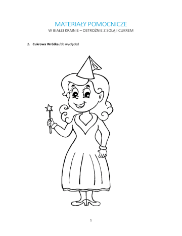 MATERIAŁY POMOCNICZE W BIAŁEJ KRAINIE – OSTROŻNIE Z SOLĄ I CUKREM 1. Cukrowa Wróżka (do wycięcia) 1 2. Zagadki Wydobywa się ją z ziemi, lecz kupuje w sklepie. Gdy jej dodasz do potrawy, to smakuje lepiej. W Wieliczce się wszędzie z nią spotkasz i w morzu też jest, rozpuszczona. Nie kwaśna, nie gorzka, nie słodka, no, jakże nazywa się ona? (sól) Bieluteńki niczym śnieżek, słodki niesłychanie, dodawany do herbaty tuż przed zamieszaniem. (cukier) 2 3 WYBIERAMY WITAMINY! NIE SŁODZIMY! NIE SOLIMY, 3. Puzzle z hasłem „Nie solimy, nie słodzimy! Wybieramy witaminy!” (do wycięcia). 4. Działania (do wycięcia). Wyniki działań należy ułożyć w kolejności rosnącej. 2+2= NIE 4x5= WY 2x4= SO 14+7= BIE 10-1= LI 5x5= RA 10+1= MY, 30-3= MY 15-2= NIE 30+1= WI 3x5= SŁO 36-3= TA 8+9= DZI 6x6= MI 20-2= MY! 5x8= MY! 4 5. Przykładowe etykiety Krem orzechowy o smaku czekoladowym Serek Wiejski ze szczypiorkiem Składniki: cukier, olej roślinny, orzechy laskowe (13%), kakao w proszku o obniżonej zawartości tłuszczu (7,4%), mleko odtłuszczone w proszku (6,6%), serwatka w proszku, emulgator: lecytyny (soja), wanilina. Składniki: ziarno twarogowe, śmietanka pasteryzowana, wsad szczypiorkowy (szczypior 3,8%, skrobia modyfikowana kukurydziana E1422, syrop glukozowo-fruktozowy, aromat), sól. Napój marchewkowo-arbuzowy Składniki: woda, soki z zagęszczonych soków i przecier (20%) z: jabłek (12,5%), arbuza (5%), marchwi (2%) i limetek (0,5%), syrop glukozowofruktozowy, regulator kwasowości – kwas cytrynowy, aromaty. Sok marchewkowo-jabłkowo-bananowy Składniki: sok jabłkowy (55%), banany (25%), marchew (15%), woda, witamina C. Napój marchewkowo-owocowy Składniki: woda, przeciery i sok z zagęszczonego soku (38%) z: marchwi (24%), bananów (8%), jabłek i kiwi (1%), cukier trzcinowy, regulator kwasowości – kwas cytrynowy, barwniki – kompleksy miedziowe chlorofilin i kurkumina, aromat. Ketchup Składniki: woda, koncentrat pomidorowy 30% (40%), cukier, warzywa, ocet spirytusowy, substancja zagęszczająca: skrobia modyfikowana, sól, przyprawy, regulator kwasowości: kwas cytrynowy, konserwant: benzoesan sodu. Serek wiejski Płatki owsiane Składniki: twaróg ziarnisty, śmietanka, sól. Składniki: 100% płatki owsiane Baton musli z polewą jogurtową Składniki: polewa jogurtowa 32,5% (cukier, tłuszcz roślinny, serwatka w proszku, tłuszcz kakaowy, proszek jogurtowy, emulgatory: lecytyna sojowa, E476; aromaty), syrop skrobiowy, płatki owsiane 12,9%, chrupki kukurydziano-ryżowe (kasza kukurydziana, maka ryżowa, cukier trzcinowy, sól morska), tłuszcz roślinny, koncentrat jabłkowy, płatki kukurydziane (kukurydza, cukier, sól, ekstrakt słodowy jęczmienny, emulgator: mono- i diglicerydy kwasów tłuszczowych), wiśnia suszona 2,3% (wiśnia, sok jabłkowy, olej roślinny), rodzynka, płatki kokosowe*, aromaty, ziarna słonecznika, regulator kwasowości: kwas cytrynowy, sól morska, emulgator: lecytyna sojowa. Płatki kukurydziane Składniki: mąka kukurydziana (92%), ekstrakt słodowy jęczmienny, cukier, sól, emulgator: mono- i diglicerydy kwasów tłuszczowych, barwniki: annato, karmel amoniakalny; regulator kwasowości: fosforan sodu. 5 Suszone jabłka Jogurt naturalny Składniki: suszone jabłka Składniki: mleko pasteryzowane, białka mleka, żywe kultury bakterii jogurtowych Chipsy pomidorowe Składniki: pomidor (100%) Naturalna woda mineralna Wysokozmineralizowana, zawiera wodorowęglany, wapń i magnez. Jogurt z truskawkami i poziomkami Składniki: jogurt (mleko, cukier, mleko zagęszczone odtłuszczone, żywe kultury bakterii), wsad owocowy (truskawki, cukier, syrop glukozowo-fruktozowy, sok truskawkowy z koncentratu, poziomki, koncentrat soku z buraków czerwonych, aromat). Napój niegazowany o smaku cytrynowym Składniki: naturalna woda źródlana, cukier, regulatory kwasowości: kwas cytrynowy, naturalny aromat cytrynowy i limonkowy, substancje konserwujące: benzoesan sodu. Chipsy o smaku serka ze szczypiorkiem Składniki: ziemniaki, olej roślinny, preparat aromatyzujący o smaku serka ze szczypiorkiem [aromaty (obecny słód jęczmienny), laktoza (z mleka), cukier, substancja wzmacniająca smak i zapach (glutaminian sodu), regulator kwasowości (kwas cytrynowy, dioctan sodu, fosforan wapnia), białka mleka], sól. 6. Lista rodzajów soli i cukru oraz form w jakich mogą znajdować się w produktach CUKIER cukier puder cukier brązowy cukier trzcinowy glukoza fruktoza syrop glukozowo-fruktozowy syrop glukozowy syrop cukru skarmelizowanego miód SÓL sól morska sól himalajska sos magi sos sojowy przyprawy typu vegeta glutaminian sodu 6 7. Wzór drzewka decyzyjnego CELE ______________________________ ______________________________ ________________ ________________ ________________ ________________ ________________ ________________ SKUTKI ________________ ________________ ________________ ________________ ________________ ________________ _______________ _______________ MOŻLIWE ROZWIĄZANIA SYTUACJA WYMAGAJĄCA PODJĘCIA DECYZJI ____________________ ____________________ ____________________ ____________________ 7 8. Drzewko decyzyjne – przykładowo uzupełnione CELE ZDROWIE I DOBRE SAMOPOCZUCIE Zdrowe zęby Dobre samopoczucie Szczupła sylwetka Odkrywam nowe smaki Nie jem słodyczy i słonych przekąsek REZYGNUJĘ Z TYCH PRODUKTÓW Mogę jeść słodycze i słone przekąski Mogę dosalać potrawy SKUTKI Próchnica Cukrzyca Nadciśnienie Złe nawyki Zbędne kilogramy DALEJ JEM TE PRODUKTY MOŻLIWE ROZWIĄZANIA SYTUACJA WYMAGAJĄCA PODJĘCIA DECYZJI SPOŻYWAM PRODUKTY O DUŻEJ ZAWARTOŚCI CUKRU I SOLI 8