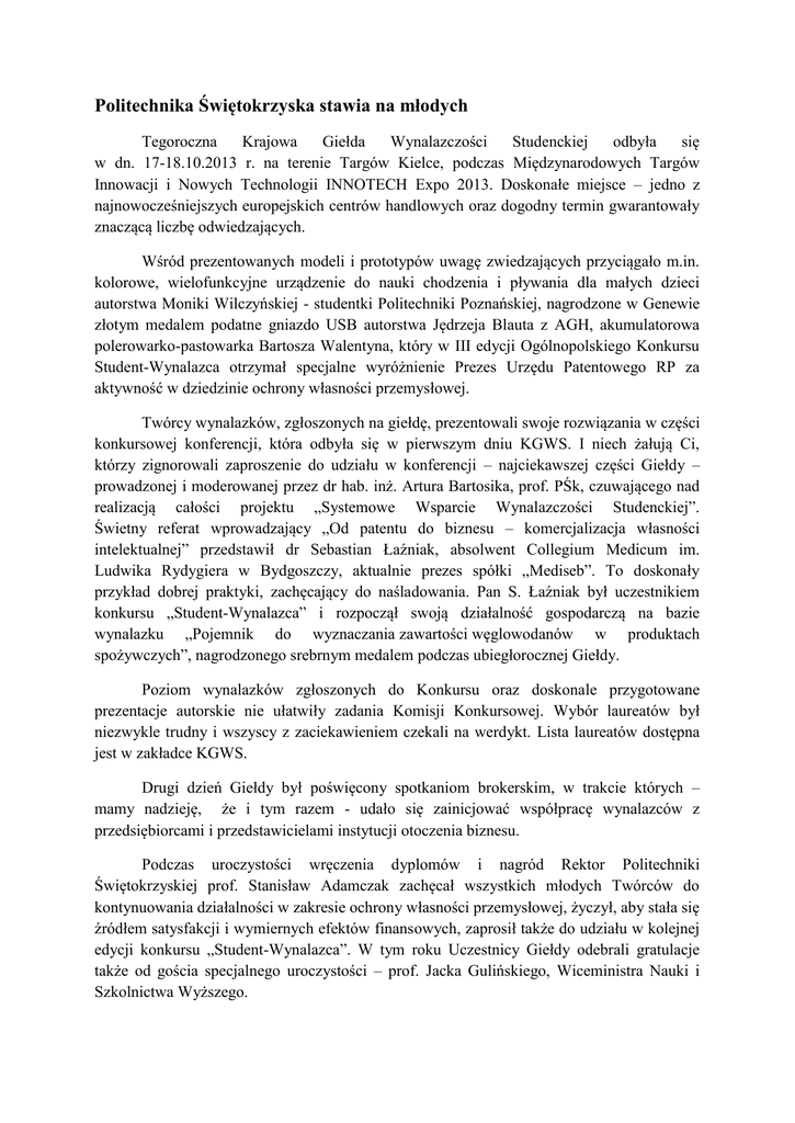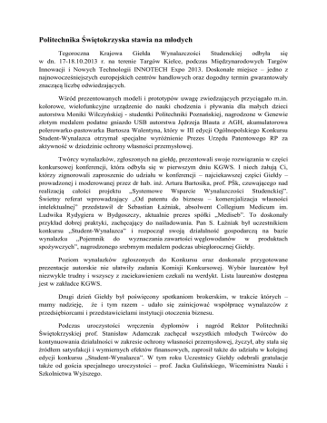 Politechnika Świętokrzyska stawia na młodych Tegoroczna Krajowa Giełda Wynalazczości Studenckiej odbyła się w dn. 17-18.10.2013 r. na terenie Targów Kielce, podczas Międzynarodowych Targów Innowacji i Nowych Technologii INNOTECH Expo 2013. Doskonałe miejsce – jedno z najnowocześniejszych europejskich centrów handlowych oraz dogodny termin gwarantowały znaczącą liczbę odwiedzających. Wśród prezentowanych modeli i prototypów uwagę zwiedzających przyciągało m.in. kolorowe, wielofunkcyjne urządzenie do nauki chodzenia i pływania dla małych dzieci autorstwa Moniki Wilczyńskiej - studentki Politechniki Poznańskiej, nagrodzone w Genewie złotym medalem podatne gniazdo USB autorstwa Jędrzeja Blauta z AGH, akumulatorowa polerowarko-pastowarka Bartosza Walentyna, który w III edycji Ogólnopolskiego Konkursu Student-Wynalazca otrzymał specjalne wyróżnienie Prezes Urzędu Patentowego RP za aktywność w dziedzinie ochrony własności przemysłowej. Twórcy wynalazków, zgłoszonych na giełdę, prezentowali swoje rozwiązania w części konkursowej konferencji, która odbyła się w pierwszym dniu KGWS. I niech żałują Ci, którzy zignorowali zaproszenie do udziału w konferencji – najciekawszej części Giełdy – prowadzonej i moderowanej przez dr hab. inż. Artura Bartosika, prof. PŚk, czuwającego nad realizacją całości projektu „Systemowe Wsparcie Wynalazczości Studenckiej”. Świetny referat wprowadzający „Od patentu do biznesu – komercjalizacja własności intelektualnej” przedstawił dr Sebastian Łaźniak, absolwent Collegium Medicum im. Ludwika Rydygiera w Bydgoszczy, aktualnie prezes spółki „Mediseb”. To doskonały przykład dobrej praktyki, zachęcający do naśladowania. Pan S. Łaźniak był uczestnikiem konkursu „Student-Wynalazca” i rozpoczął swoją działalność gospodarczą na bazie wynalazku „Pojemnik do wyznaczania zawartości węglowodanów w produktach spożywczych”, nagrodzonego srebrnym medalem podczas ubiegłorocznej Giełdy. Poziom wynalazków zgłoszonych do Konkursu oraz doskonale przygotowane prezentacje autorskie nie ułatwiły zadania Komisji Konkursowej. Wybór laureatów był niezwykle trudny i wszyscy z zaciekawieniem czekali na werdykt. Lista laureatów dostępna jest w zakładce KGWS. Drugi dzień Giełdy był poświęcony spotkaniom brokerskim, w trakcie których – mamy nadzieję, że i tym razem - udało się zainicjować współpracę wynalazców z przedsiębiorcami i przedstawicielami instytucji otoczenia biznesu. Podczas uroczystości wręczenia dyplomów i nagród Rektor Politechniki Świętokrzyskiej prof. Stanisław Adamczak zachęcał wszystkich młodych Twórców do kontynuowania działalności w zakresie ochrony własności przemysłowej, życzył, aby stała się źródłem satysfakcji i wymiernych efektów finansowych, zaprosił także do udziału w kolejnej edycji konkursu „Student-Wynalazca”. W tym roku Uczestnicy Giełdy odebrali gratulacje także od gościa specjalnego uroczystości – prof. Jacka Gulińskiego, Wiceministra Nauki i Szkolnictwa Wyższego. Chociaż tegoroczna Krajowa Giełda Wynalazczości Studenckiej była ostatnim etapem realizacji projektu „Systemowe Wsparcie Wynalazczości Studenckiej” – program NCBiR „Kreator innowacyjności – wsparcie innowacyjnej przedsiębiorczości akademickiej”, Ogólnopolski Konkurs Student-Wynalazca nadal pozostaje przedsięwzięciem cyklicznym. Formularz zgłoszeniowy do konkursu jest dostępny na stronie www.patenty.tu.kielce.pl/konkurs-student/. Mamy nadzieję na spotkania zarówno z nowymi wynalazcami, jak również „starymi znajomymi”- tymi inteligentnymi, zaangażowanymi, a przede wszystkim niezwykle sympatycznymi młodymi ludźmi podczas następnych edycji Konkursu. Grażyna Stefańska Opinie uczestników Krajowej Giełdy Wynalazczości Studenckiej Krajowa Giełda Wynalazczości Studenckiej oraz cały projekt "Systemowe wsparcie wynalazczości studenckiej" to inicjatywa unikatowa w skali kraju. Jako młody naukowiec-wynalazca jestem bardzo szczęśliwy, że dane mi było uczestniczyć w tym wspaniałym przedsięwzięciu. Udział w Giełdzie stanowił dla mnie bardzo cenną okazję do wymiany myśli z przedstawicielami biznesu, przemysłu, a także z osobami mającymi doświadczenie w dziedzinie transferu technologii. Dzięki Giełdzie mogłem również poznać punkt widzenia inwestorów i przedsiębiorców. Doskonałym pomysłem organizatorów było zaproszenia pana Sebastiana Łaźniaka, studenta-wynalazcę, który już wprowadził swój wynalazek na rynek i który dzielił się swoją wiedzą z mniej doświadczonymi kolegami. Wreszcie, Giełda stanowiła pole do nawiązywania kontaktów z innymi pełnymi werwy i zapału młodymi wynalazcami. Poszerzenie horyzontów i odbyte podczas Giełdy rozmowy zrodziły we mnie szereg nowych pomysłów związanych z wykorzystaniem potencjału mojego wynalazku oraz z komercjalizacją wyników badań w ogóle. Jestem przekonany, że sieć kontaktów powstała podczas Giełdy przyczyni się do ożywienia innowacyjności zarówno w aspekcie ogólnokrajowym, jak i w wymiarze osobistym dla każdego młodego wynalazcy. Od strony organizacyjnej przedsięwzięcie realizowane jest wzorowo, a zespół projektu stanowią ludzie profesjonalni oraz życzliwi. Uważam, że dla rozwoju innowacyjności w Polsce niezwykle ważne jest, aby Projekt oraz Giełda były kontynuowane w kolejnych latach. Jędrzej Skrobot, Zachodniopomorski Uniwersytet Technologiczny w Szczecinie Giełda była doskonałą okazją na spotkanie ludzi zainteresowanych rozwijaniem innowacyjnych rozwiązań. Najcenniejszym doświadczeniem giełdy było nawiązanie kontaktu z ludźmi rozwiązującymi podobne problemy związane z możliwościami komercjalizacji. Można śmiało powiedzieć, że Giełda Wynalazczości Studenckiej jest jednym z niewielu miejsc w Polsce skupiających wokół siebie tak różnorodn