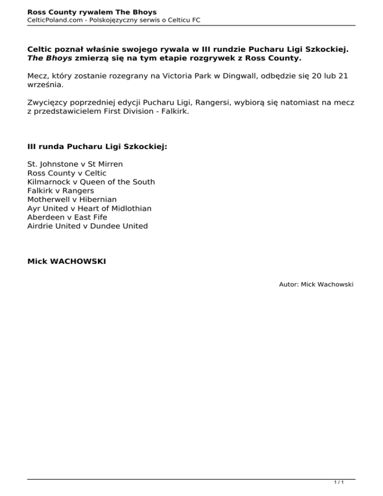 Ross County rywalem The Bhoys CelticPoland.com - Polskojęzyczny serwis o Celticu FC Celtic poznał właśnie swojego rywala w III rundzie Pucharu Ligi Szkockiej. The Bhoys zmierzą się na tym etapie rozgrywek z Ross County. Mecz, który zostanie rozegrany na Victoria Park w Dingwall, odbędzie się 20 lub 21 września. Zwycięzcy poprzedniej edycji Pucharu Ligi, Rangersi, wybiorą się natomiast na mecz z przedstawicielem First Division - Falkirk. III runda Pucharu Ligi Szkockiej: St. Johnstone v St Mirren Ross County v Celtic Kilmarnock v Queen of the South Falkirk v Rangers Motherwell v Hibernian Ayr United v Heart of Midlothian Aberdeen v East Fife Airdrie United v Dundee United Mick WACHOWSKI Autor: Mick Wachowski 1/1 Powered by TCPDF (www.tcpdf.org)