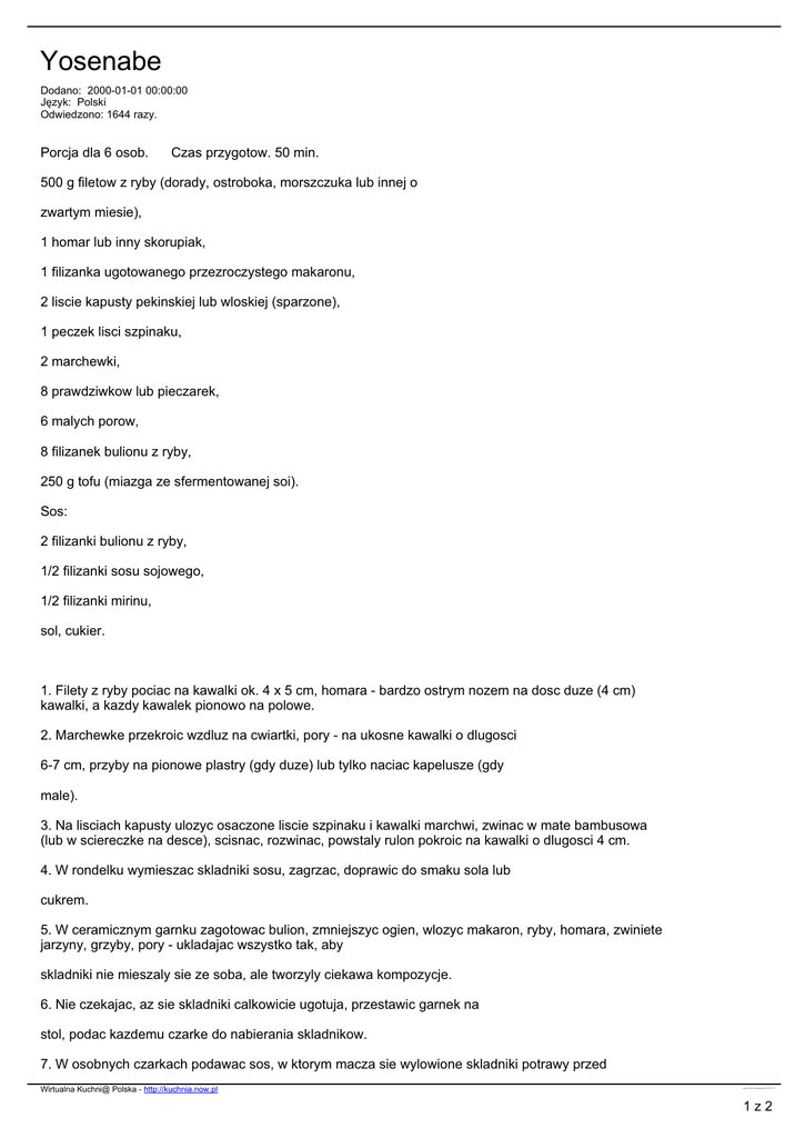 Yosenabe Dodano: 2000-01-01 00:00:00 Język: Polski Odwiedzono: 1644 razy. Porcja dla 6 osob. Czas przygotow. 50 min. 500 g filetow z ryby (dorady, ostroboka, morszczuka lub innej o zwartym miesie), 1 homar lub inny skorupiak, 1 filizanka ugotowanego przezroczystego makaronu, 2 liscie kapusty pekinskiej lub wloskiej (sparzone), 1 peczek lisci szpinaku, 2 marchewki, 8 prawdziwkow lub pieczarek, 6 malych porow, 8 filizanek bulionu z ryby, 250 g tofu (miazga ze sfermentowanej soi). Sos: 2 filizanki bulionu z ryby, 1/2 filizanki sosu sojowego, 1/2 filizanki mirinu, sol, cukier. 1. Filety z ryby pociac na kawalki ok. 4 x 5 cm, homara - bardzo ostrym nozem na dosc duze (4 cm) kawalki, a kazdy kawalek pionowo na polowe. 2. Marchewke przekroic wzdluz na cwiartki, pory - na ukosne kawalki o dlugosci 6-7 cm, przyby na pionowe plastry (gdy duze) lub tylko naciac kapelusze (gdy male). 3. Na lisciach kapusty ulozyc osaczone liscie szpinaku i kawalki marchwi, zwinac w mate bambusowa (lub w sciereczke na desce), scisnac, rozwinac, powstaly rulon pokroic na kawalki o dlugosci 4 cm. 4. W rondelku wymieszac skladniki sosu, zagrzac, doprawic do smaku sola lub cukrem. 5. W ceramicznym garnku zagotowac bulion, zmniejszyc ogien, wlozyc makaron, ryby, homara, zwiniete jarzyny, grzyby, pory - ukladajac wszystko tak, aby skladniki nie mieszaly sie ze soba, ale tworzyly ciekawa kompozycje. 6. Nie czekajac, az sie skladniki calkowicie ugotuja, przestawic garnek na stol, podac kazdemu czarke do nabierania skladnikow. 7. W osobnych czarkach podawac sos, w ktorym macza sie wylowione skladniki potrawy przed Wirtualna Kuchni@ Polska - http://kuchnia.now.pl przepis nr 5757, plik wygenerowano 2017.03.07 11:10 1z2 wlozeniem do ust. Źródło: Encyklopedia sztuki kulinarnej, tom 8 "Kuchnia japońska", strona 48. From: [email protected] (Radku's De Apaczu's) Wirtualna Kuchni@ Polska - http://kuchnia.now.pl przepis nr 5757, plik wygenerowano 2017.03.07 11:10 2z2