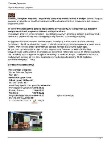 Zimowa Gospoda Wpisał Restauracja Gospoda Zawiało, śniegiem zasypało i wydaje się jakby cały świat zatonął w białym puchu. Pogoda zupełnie wymknęła się spod kontroli (szczególnie drogowcom) i nie przypomina już typowej, angielskiej zimy. W takie dni szczególnie gorąco zapraszamy do Gospody, w której choć już zagościł świąteczny klimat, na pewno nikomu nie będzie zimno. Po naszym grzanym winie z miodem i goździkami, piwnym grzańcu z sokiem malinowym lub herbacie z prądem każdy mróz i śnieg wyda się Państwu dużo mniej uciążliwy. Przygotowaliśmy także nowe, zimowe menu. Znajdą się w nim znane i lubiane potrawy (schabowy, placek po zbójnicku, bigos...) ale także nietradycyjne dania polecane przez szefa kuchni. Warto więc zajrzeć i popróbować czegoś nowego (jak zwykle pysznego). W tym roku, podobnie jak w poprzednim, zapraszamy Państwa na Wieczór Wigilijny, przypominając jednocześnie o konieczności dokonania rezerwacji stolika. W ofercie wigilijnej nie zabraknie wybornego barszczyku czerwonego z uszkami, karpia , makiełek oraz innych, tradycyjnych potraw. W tym dniu Gospoda czynna będzie do godziny 19.00 (ostatnie zamówienie o godz. 17.00). Serdecznie zapraszamy! Restauracja Gospoda Upper Princess Square NE1 8ER Newcastle upon Tyne (obok nowej biblioteki) tel. 01912 610 197 www.thegospoda.com godziny otwarcia: Poniedziałek-Czwartek 12.00-21.00 Piątek, Sobota 12.00-23.00 Niedziela 12.00-20.00 Wigilia Bożego Narodzenia 12.00-19.00 25/12/2010 ZAMKNIĘTE 31/12/2010-6/01/2011 ZAMKNIĘTE (tylko rezerwacje) 1/5 Zimowa Gospoda Wpisał Restauracja Gospoda 2/5 Zimowa Gospoda Wpisał Restauracja Gospoda 3/5 Zimowa Gospoda Wpisał Restauracja Gospoda 4/5 Zimowa Gospoda Wpisał Restauracja Gospoda 5/5