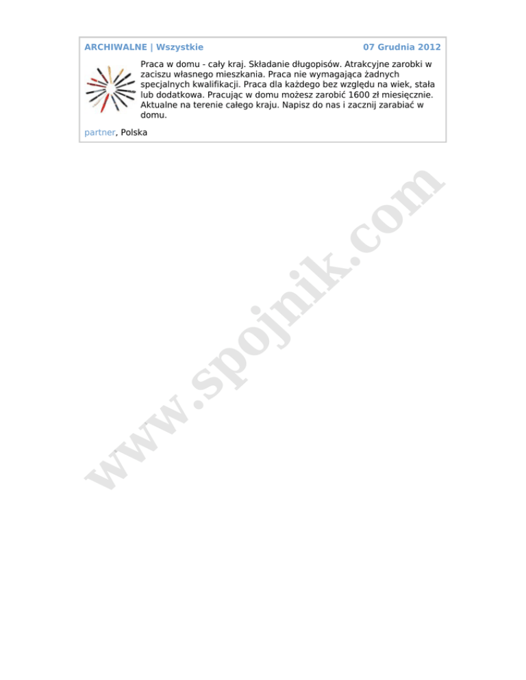 ARCHIWALNE | Wszystkie 07 Grudnia 2012 Praca w domu - cały kraj. Składanie długopisów. Atrakcyjne zarobki w zaciszu własnego mieszkania. Praca nie wymagająca żadnych specjalnych kwalifikacji. Praca dla każdego bez względu na wiek, stała lub dodatkowa. Pracując w domu możesz zarobić 1600 zł miesięcznie. Aktualne na terenie całego kraju. Napisz do nas i zacznij zarabiać w domu. w w w .s po jn ik .c o m partner, Polska