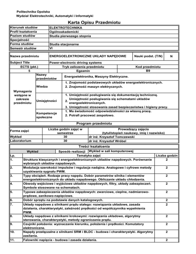 Politechnika Opolska Wydział Elektrotechniki, Automatyki i Informatyki Karta Opisu Przedmiotu Kierunek studiów Profil kształcenia Poziom studiów Specjalność Forma studiów Semestr studiów ELEKTROTECHNIKA Ogólnoakademicki Studia pierwszego stopnia Nazwa przedmiotu ENERGOELEKTRONICZNE UKŁADY NAPĘDOWE Studia stacjonarne VI Nauki podst. (T/N) N Subject Title Power-electronic driving systems ECTS (pkt.) Tryb zaliczenia przedmiotu Kod przedmiotu B9 5 Egzamin Nazwy Energoelektronika, Maszyny Elektryczne. przedmiotów 1. Znajomość podstawowych układów energoelektronicznych. Wiedza 2. Znajomość maszyn elektrycznych. Wymagania wstępne w zakresie przedmiotu Umiejętności Kompetencje społeczne 1. Umiejętność posługiwania się dokumentacją techniczną. Umiejętność posługiwania się schematami układów 2. energoelektronicznych. 3. Umiejętność stosowania zasad bezpieczeństwa i higieny pracy. 1. Ma świadomość odpowiedzialności za własną pracę. 2. Potrafi pracować zespołowo. Program przedmiotu Forma zajęć Wykład Laboratorium Liczba godzin zajęć w semestrze 30 30 Prowadzący zajęcia (tytuł/stopień naukowy, imię i nazwisko) dr inż. Krzysztof Tomczewski dr inż. Krzysztof Wróbel Treści kształcenia Sposób realizacji Wykład w sali komputerowej Tematyka zajęć Struktura klasycznych i energoelektronicznych układów napędowych. Porównanie wybranych układów napędowych. Modulacja szerokości impulsów i regulacja nadążna. Analogowe i cyfrowe metody uzyskiwania sygnału PWM. Typy obciążeń. Rodzaje pracy napędu. Dobór parametrów silnika i elementów energoelektronicznych do układu napędowego. Obliczanie układu chłodzenia. Obwody wejściowe i wyjściowe układów napędowych, filtry, układy zabezpieczeń. Symbole stosowane na schematach. Typowe zabezpieczenia układów napędowych: zwarciowe, cieplne, nadmiarowoprądowe, zanikowo-napięciowe. Dobór sprzętu na podstawie danych katalogowych. Wykład Lp. 1. 2. 3. 4. 5. 6. 7. 8. 9. 10. 11. Układy napędowe z silnikami prądu stałego: rozwiązania układowe, zasada działania, charakterystyki, zależność prędkości od współczynnika wypełnienia PWM. Układy napędowe z silnikami krokowymi: rozwiązania układowe, algorytmy sterowania, charakterystyki, metody ograniczania prądu. Czujniki położenia: wyznaczanie kierunku, położenia i prędkości. Komutatory elektroniczne. Napędy przełączalne z silnikami SRM i BLDC - budowa i charakterystyki. Algorytmy zasilania. Falowniki napięcia - budowa i zasada działania. Liczba godzin 2 2 2 2 2 2 2 2 2 2 2 12. Falowniki prądu - budowa i algorytmy sterowania. 2 13. Sterowanie wektorowe silnika indukcyjnego - zasada i sposób realizacji. 2 14. Sprzężenia zwrotne: sposób realizacji i wpływ na charakterystyki napędu. Praca 2 współbieżna napędów. 15. Rozwiazania praktyczne: napęd pompy wodnej, napęd wentylatora, metody 2 regulacji wydajności. Liczba godzin zajęć w semestrze 30 Sposoby sprawdzenia zamierzonych Egzamin ustny. efektów kształcenia Laboratorium Sposób realizacji Realizacja ćwiczeń laboratoryjnych w grupach Tematyka zajęć Lp. Liczba godzin 1. Zajęcia wprowadzające. Omówienie regulaminu i zasad BHP. 2 2. Energoelektroniczna kaskada podsynchroniczna. 2 3. Badanie napędu z falownikiem Hitachi J300. 2 4. Napęd z tyrystorowym układem rozruchowym. 2 5. Falownikowy napęd pompy wodnej. 2 6. Napęd falownikowy wentylatora. 2 7. Sterowanie napędami centrali wentylacyjnej. 2 8. Kolokwium. 2 9. Przekaźnik programowalny LOGO! - zapoznanie z programowaniem przekaźnika, 3 układy start-stop, wybór kierunku pracy silnika. 10. Przekaźnik programowalny LOGO! - programowanie z zastosowaniem elementów 2 zliczających - sterowanie sekwencyjne napędami taśmociągów. 11. Przekaźnik programowalny LOGO! - programowanie z zastosowaniem elementów 3 czasowych, sterowanie silnikiem krokowym - algorytmy sterowania. 12. Przekaźnik programowalny LOGO! - sterowanie prędkością silnika na podstawie 2 sygnałów analogowych. 13. Kolokwium i termin odróbczy. 2 14. Zaliczenie. 2 Liczba godzin zajęć w semestrze 30 Sposoby sprawdzenia zamierzonych Ocena realizacji ćwiczeń laboratoryjnych, sprawdzenie wiadomości w formie pisemnej i ustnej. efektów kształcenia 1. Zna zagadnienia dotyczące elektromechanicznego przetwarzania energii. (W, L) 2. Zna charakterystyki i zasady doboru napędów elektrycznych. (W, L) Wiedza 3. Ma wiedzę z zakresu algorytmów sterowania stosowanych w energoelektronicznych układach napędowych. (W) Efekty kształcenia dla przedmiotu - po zakończonym cyklu kształcenia Umiejętności Kompetencje społeczne 1. Zna charakterystyki teoretyczne i potrafi eksperymentalnie wyznaczać charakterystyki napędów. (W, L) 2. Potrafi korzystać z kart katalogowych i not aplikacyjnych elementów układów napędowych. (W, L) 3. Potrafi dobrać napęd do zadanych charakterystyk obciążenia. (W) 4. Potrafi stosować zasady bezpieczeństwa i higieny pracy. ( L) 1. Rozumie potrzebę ciągłego dokształcania się z zakresu nowych rozwiązań układów napędowych. (W, L) 2. Ma świadomość odpowiedzialności za własną pracę i jej wpływu na realizację zadania przez zespół. (L) Metody dydaktyczne: Wykład z prezentacjami multimedialnymi. Praktyczna realizacja ćwiczeń laboratoryjnych. Forma i warunki zaliczenia przedmiotu: Zaliczenie wykładu na podstawie oceny stopnia opanowania materiału w formie pisemnej i ustnej oraz ocena wykonanych ćwiczeń laboratoryjnych. Literatura podstawowa: [1] BISZTYGA K.: Sterowanie i regulacja silników elektrycznych. WNT, Warszawa 1989. [2] NOWAK M., BARLIK R.: Poradnik inżyniera energoelektronika. WNT, Warszawa 2008. [3] WRÓBEL T.: Silniki skokowe. WNT, 1993. [4] WACH P.: Dynamics and Control of Electrical Drives. Springer 2011. [5] MOHAN N., UNDELAND T. M., ROBBINS W. P.: Power Electronics. Conwerters, Applications, and Design. John Wiley $ Sons, Inc. 1995. Literatura uz