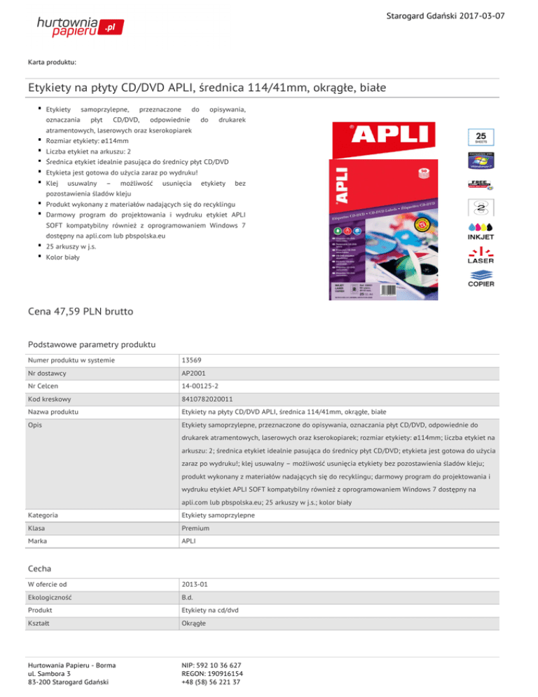 Starogard Gdański 2017-03-07 Karta produktu: Etykiety na płyty CD/DVD APLI, średnica 114/41mm, okrągłe, białe Etykiety oznaczania samoprzylepne, płyt przeznaczone CD/DVD, do odpowiednie opisywania, do drukarek atramentowych, laserowych oraz kserokopiarek Rozmiar etykiety: ø114mm Liczba etykiet na arkuszu: 2 Średnica etykiet idealnie pasująca do średnicy płyt CD/DVD Etykieta jest gotowa do użycia zaraz po wydruku! Klej usuwalny – możliwość usunięcia etykiety bez pozostawienia śladów kleju Produkt wykonany z materiałów nadających się do recyklingu Darmowy program do projektowania i wydruku etykiet APLI SOFT kompatybilny również z oprogramowaniem Windows 7 dostępny na apli.com lub pbspolska.eu 25 arkuszy w j.s. Kolor biały Cena 47,59 PLN brutto Podstawowe parametry produktu Numer produktu w systemie 13569 Nr dostawcy AP2001 Nr Celcen 14-00125-2 Kod kreskowy 8410782020011 Nazwa produktu Etykiety na płyty CD/DVD APLI, średnica 114/41mm, okrągłe, białe Opis Etykiety samoprzylepne, przeznaczone do opisywania, oznaczania płyt CD/DVD, odpowiednie do drukarek atramentowych, laserowych oraz kserokopiarek; rozmiar etykiety: ø114mm; liczba etykiet na arkuszu: 2; średnica etykiet idealnie pasująca do średnicy płyt CD/DVD; etykieta jest gotowa do użycia zaraz po wydruku!; klej usuwalny – możliwość usunięcia etykiety bez pozostawienia śladów kleju; produkt wykonany z materiałów nadających się do recyklingu; darmowy program do projektowania i wydruku etykiet APLI SOFT kompatybilny również z oprogramowaniem Windows 7 dostępny na apli.com lub pbspolska.eu; 25 arkuszy w j.s.; kolor biały Kategoria Etykiety samoprzylepne Klasa Premium Marka APLI Cecha W ofercie od 2013-01 Ekologiczność B.d. Produkt Etykiety na cd/dvd Kształt Okrągłe Hurtowania Papieru - Borma ul. Sambora 3 83-200 Starogard Gdański NIP: 592 10 36 627 REGON: 190916154 +48 (58) 56 221 37 Starogard Gdański 2017-03-07 Karta katalogowa produktu cd. Etykiety na płyty CD/DVD APLI, średnica 114/41mm, okrągłe, białe Typ Inkjet, laser, copier Materiał Papier Wymiary Wymiary (mm) Średnica: 114 Gramatura (g/m2) B.d. Wspólny słownik zamówień CPV 30192800-9 Etykiety samoprzylepne Certyfikaty Nowy produkt w ofercie Standard Hit Standard Ilość Ilość arkuszy 25 Ilość etykiet na arkuszu 2 Kolor Kolor Biały Pozostałe zdjęcia produktu Serdecznie zapraszamy do współpracy Hurtowania Papieru - Borma zespół. Hurtowania Papieru - Borma ul. Sambora 3 83-200 Starogard Gdański NIP: 592 10 36 627 REGON: 190916154 +48 (58) 56 221 37