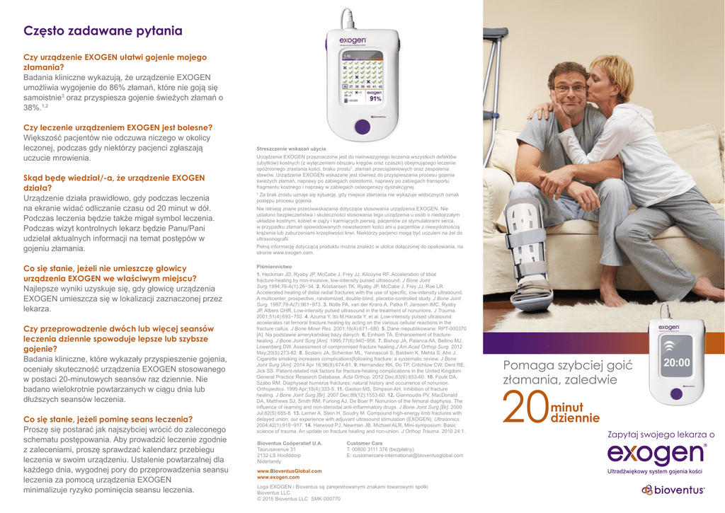 Często zadawane pytania Czy urządzenie EXOGEN ułatwi gojenie mojego złamania? Badania kliniczne wykazują, że urządzenie EXOGEN umożliwia wygojenie do 86% złamań, które nie goją się samoistnie3 oraz przyspiesza gojenie świeżych złamań o 38%.1,2 Czy leczenie urządzeniem EXOGEN jest bolesne? Większość pacjentów nie odczuwa niczego w okolicy leczonej, podczas gdy niektórzy pacjenci zgłaszają uczucie mrowienia. Skąd będę wiedział/-a, że urządzenie EXOGEN działa? Urządzenie działa prawidłowo, gdy podczas leczenia na ekranie widać odliczanie czasu od 20 minut w dół. Podczas leczenia będzie także migał symbol leczenia. Podczas wizyt kontrolnych lekarz będzie Panu/Pani udzielał aktualnych informacji na temat postępów w gojeniu złamania. Co się stanie, jeżeli nie umieszczę głowicy urządzenia EXOGEN we właściwym miejscu? Najlepsze wyniki uzyskuje się, gdy głowicę urządzenia EXOGEN umieszcza się w lokalizacji zaznaczonej przez lekarza. Czy przeprowadzenie dwóch lub więcej seansów leczenia dziennie spowoduje lepsze lub szybsze gojenie? Badania kliniczne, które wykazały przyspieszenie gojenia, oceniały skuteczność urządzenia EXOGEN stosowanego w postaci 20-minutowych seansów raz dziennie. Nie badano wielokrotnie powtarzanych w ciągu dnia lub dłuższych seansów leczenia. Co się stanie, jeżeli pominę seans leczenia? Proszę się postarać jak najszybciej wrócić do zaleconego schematu postępowania. Aby prowadzić leczenie zgodnie z zaleceniami, proszę sprawdzać kalendarz przebiegu leczenia w swoim urządzeniu. Ustalenie powtarzalnej dla każdego dnia, wygodnej pory do przeprowadzenia seansu leczenia za pomocą urządzenia EXOGEN minimalizuje ryzyko pominięcia seansu leczenia. Streszczenie wskazań użycia Urządzenie EXOGEN przeznaczone jest do nieinwazyjnego leczenia wszystkich defektów (ubytków) kostnych (z wyłączeniem obszaru kręgów oraz czaszki) obejmującego leczenie opóźnionego zrastania kości, braku zrostu†, złamań przeciążeniowych oraz zespolenia stawów. Urządzenie EXOGEN wskazane jest również do przyspieszania procesu gojenia świeżych złamań, naprawy po zabiegach osteotomii, naprawy po zabiegach transportu fragmentu kostnego i naprawy w zabiegach osteogenezy dystrakcyjnej. Za brak zrostu uznaje się sytuację, gdy miejsce złamania nie wykazuje widocznych oznak postępu procesu gojenia. † Nie istnieją znane przeciwwskazania dotyczące stosowania urządzenia EXOGEN. Nie ustalono bezpieczeństwa i skuteczności stosowania tego urządzenia u osób o niedojrzałym układzie kostnym, kobiet w ciąży i karmiących piersią, pacjentów ze stymulatorami serca, w przypadku złamań spowodowanych nowotworem kości ani u pacjentów z niewydolnością krążenia lub zaburzeniami krzepliwości krwi. Niektórzy pacjenci mogą być uczuleni na żel do ultrasonografii. Pełną informację dotyczącą produktu można znaleźć w ulotce dołączonej do opakowania, na stronie www.exogen.com. Piśmiennictwo 1. Heckman JD, Ryaby JP, McCabe J, Frey JJ, Kilcoyne RF. Acceleration of tibial fracture-healing by non-invasive, low-intensity pulsed ultrasound. J Bone Joint Surg.1994;76‑A(1):26−34. 2. Kristiansen TK, Ryaby JP, McCabe J, Frey JJ, Roe LR. Accelerated healing of distal radial fractures with the use of specific, low-intensity ultrasound. A multicenter, prospective, randomized, double-blind, placebo-controlled study. J Bone Joint Surg. 1997;79-A(7):961−973. 3. Nolte PA, van der Krans A, Patka P, Janssen IMC, Ryaby JP, Albers GHR. Low-intensity pulsed ultrasound in the treatment of nonunions. J Trauma. 2001;51(4):693−703. 4. Azuma Y, Ito M,Harada Y, et al. Low-intensity pulsed ultrasound accelerates rat femoral fracture healing by acting on the various cellular reactions in the fracture callus. J Bone Miner Res. 2001;16(4):671–680. 5. Dane niepublikowane: RPT-000370 [A]. Na podstawie amerykańskiej bazy danych. 6. Einhorn TA. Enhancement of fracturehealing. J Bone Joint Surg [Am]. 1995;77(6):940−956. 7. Bishop JA, Palanca AA, Bellino MJ, Lowenberg DW. Assessment of compromised fracture healing.J Am Acad Orthop Surg. 2012 May;20(5):273-82. 8. Scolaro JA, Schenker ML, Yannascoli S, Baldwin K, Mehta S, Ahn J. Cigarette smoking increases complications[following fracture: a systematic review. J Bone Joint Surg [Am]. 2014 Apr 16;96(8):674-81. 9. Hernandez RK, Do TP, Critchlow CW, Dent RE, Jick SS. Patient-related risk factors for fracture-healing complications in the United Kingdom General Practice Research Database. Acta Orthop. 2012.Dec;83(6):653-60. 10. Foulk DA, Szabo RM. Diaphyseal humerus fractures: natural history and occurrence of nonunion. Orthopedics. 1995 Apr;18(4):333-5. 11. Gaston MS, Simpson AH. Inhibition of fracture healing. J Bone Joint Surg [Br]. 2007 Dec;89(12):1553-60. 12. Giannoudis PV, MacDonald DA, Matthews SJ, Smith RM, Furlong AJ, De Boer P. Nonunion of the femoral diaphysis. The influence of reaming and non-steroidal anti-inflammatory drugs. J Bone Joint Surg [Br]. 2000 Jul;82(5):655-8. 13. Lerner A, Stein H, Soudry M. Compound high-energy limb fractures with delayed union: our experience with adjuvant ultrasound stimulation (EXOGEN). Ultrasonics. 2004;42(1):915−917. 14. Harwood PJ, Newman JB, Michael ALR, Mini-symposium: Basic science of trauma. An update on fracture healing and non-union. J Orthop Trauma. 2010 24:1. Bioventus Coöperatief U.A. Taurusavenue 31 2132 LS Hoofddorp Niderlandy Customer Care T: 00800 3111 376 (bezpłatny) E: [email protected] www.BioventusGlobal.com www.exogen.com Loga EXOGEN i Bioventus są zarejestrowanymi znakami towarowymi spółki Bioventus LLC. © 2015 Bioventus LLC SMK-000770 Pomaga szybciej goić złamania, zaledwie 20 minut dziennie Zapytaj swojego lekarza o Ryzyko niezagojenia może dotyczyć nawet 10% złamań6 o 38% Na proces gojenia mogą wpływać, między innymi, następujące czynniki: szybsze gojenie1,2 odsetek wyleczonych złama