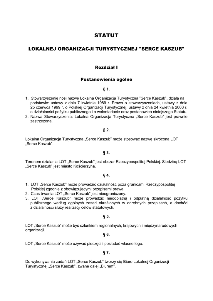 STATUT LOKALNEJ ORGANIZACJI TURYSTYCZNEJ "SERCE KASZUB" Rozdział I Postanowienia ogólne § 1. 1. Stowarzyszenie nosi nazwę Lokalna Organizacja Turystyczna ”Serce Kaszub”, działa na podstawie: ustawy z dnia 7 kwietnia 1989 r. Prawo o stowarzyszeniach, ustawy z dnia 25 czerwca 1999 r. o Polskiej Organizacji Turystycznej, ustawy z dnia 24 kwietnia 2003 r. o działalności pożytku publicznego i o wolontariacie oraz postanowień niniejszego Statutu. 2. Nazwa Stowarzyszenia: Lokalna Organizacja Turystyczna „Serce Kaszub” jest prawnie zastrzeżona. § 2. Lokalna Organizacja Turystyczna „Serce Kaszub” może stosować nazwę skróconą LOT „Serce Kaszub”. § 3. Terenem działania LOT „Serce Kaszub” jest obszar Rzeczypospolitej Polskiej. Siedzibą LOT „Serce Kaszub” jest miasto Kościerzyna. § 4. 1. LOT „Serce Kaszub” może prowadzić działalność poza granicami Rzeczypospolitej Polskiej zgodnie z obowiązującymi przepisami prawa. 2. Czas trwania LOT „Serce Kaszub” jest nieograniczony. 3. LOT „Serce Kaszub” może prowadzić nieodpłatną i odpłatną działalność pożytku publicznego według ogólnych zasad określonych w odrębnych przepisach, a dochód z działalności służy realizacji celów statutowych. § 5. LOT „Serce Kaszub” może być członkiem regionalnych, krajowych i międzynarodowych organizacji. § 6. LOT „Serce Kaszub” może używać pieczęci i posiadać własne logo. § 7. Do wykonywania zadań LOT „Serce Kaszub” tworzy się Biuro Lokalnej Organizacji Turystycznej „Serce Kaszub”, zwane dalej „Biurem”. Rozdział II Cele i zasady działania § 8. Celem LOT „Serce Kaszub” jest realizacja następujących zadań : 1) promocja terenu całego kraju, ze szczególnym uwzględnieniem Powiatu Kościerskiego, 2) zapewnienie funkcjonowania i rozwoju regionalnego systemu informacji turystycznej oraz włączenie go w krajowe zarządzanie systemem „it”, 3) inicjowanie i opiniowanie planów rozwoju turystyki oraz wspomaganie ich realizacji, 4) integracja środowiska turystycznego z terenu Powiatu Kościerskiego, 5) wspieranie rozwoju turystyki i kultury, 6) koordynacja działań w zakresie turystyki, a w szczególności podnoszenie jej jakości oraz planowanie i realizowanie imprez turystycznych, 7) propagowanie i podejmowanie działań na rzecz ekologii i ochrony środowiska, 8) tworzenie warunków do powstawania i promowania produktów oraz atrakcji turystycznych, 9) promocja i rozwój turystyki wiejskiej, 10) standaryzacja usług turystycznych , 11) podejmowanie innych zadań sprzyjających rozwojowi turystyki oraz jej infrastrukturą, 12) propagowanie działań edukacyjnych w zakresie kultury, turystyki i sportu. § 9. LOT „Serce Kaszub” realizuje swoje cele poprzez : 1) współpracę z organami administracji rządowej i samorządowej, Polską Regionalną Organizacją Turystyczną, regionalnymi i lokalnymi organizacjami turystycznymi oraz podmiotami gospodarczymi, a także organizacjami społecznymi działającymi na rzecz rozwoju turystyki i innymi podmiotami, 2) organizację szkoleń i konferencji, 3) prowadzenie badań w zakresie turystyki, gromadzenie danych i ich analiza, 4) prowadzenie informacji turystycznej Powiatu Kościerskiego, 5) prowadzenie działalności wystawienniczej i wydawniczej, 6) prowadzenie akcji promocyjnych w zakresie turystyki, 7) udział w imprezach promocyjnych i handlowych, w tym giełdach i targach krajowych i zagranicznych, 8) organizowanie objazdów studyjnych, 9) organizowanie konkursów, 10) opracowanie kalendarzy imprez turystycznych, kulturalnych, sportowych i gospodarczych, 11) prowadzenie innych działań sprzyjających realizacji statutowych celów LOT „Serce Kaszub”. 12) prowadzenie działalności oświatowej. Rozdział III Członkowie, ich prawa i obowiązki § 10. Członkowie Stowarzyszenia dzielą się na: 1) zwyczajnych, 2) wspierających, 3) honorowych. § 11. 1. Członkami zwyczajnymi są : a) członkowie założyciele, b) osoby fizyczne, c) osoby prawne, a także inne jednostki organizacyjne. 2. Członek zwyczajny, który jest osobą fizyczną działa osobiście. 3. Pozostali członkowie zwyczajni działają poprzez swoich przedstawicieli, z tym że jednego członka zwyczajnego reprezentuje tylko jeden przedstawiciel. 4. Cudzoziemcy, bez względu na miejsce zamieszkania, mogą być członkami LOT „Serce Kaszub” 5. Przyjęcie i skreślanie z listy członków zwyczajnych następuje w drodze uchwały Zarządu. § 12. 1. Przyjęcie w poczet członków zwyczajnych dokonuje Zarząd LOT „Serce Kaszub” na podstawie pisemnej deklaracji przystępującego, zawierającej imię i nazwisko (nazwę), datę urodzenia, miejsce zamieszkania (siedzibę) oraz oświadczenie o przystąpieniu do LOT „Serce Kaszub” i przestrzeganiu jej Statutu. 2. Członkostwo powstaje z dniem podjęcia przez Zarząd uchwały o przyjęciu. O podjęciu uchwały Zarząd zawiadamia zainteresowanego. § 13. 1. Członkowie zwyczajni posiadają bierne i czynne prawo wyborcze w wyborach do organów, a ponadto posiadają prawo: a) uczestniczenia głosem stanowiącym w Walnym Zebraniu Członków, b) zgłoszenia do władz wniosków i uwag dotyczących działalności, c) korzystania z merytorycznej, organizacyjnej i technicznej pomocy Biura, d) używania odznaki, e) współuczestniczenia w tworzeniu programu pracy LOT „Serce Kaszub” i jego realizowaniu. 2. Każdy członek zwyczajny dysponuje jednym głosem. § 14. Członkowie zwyczajni LOT „Serce Kaszub” zobowiązani są do: a) stosowania postanowień Statutu, regulaminów i uchwał władz LOT „Serce Kaszub”, b) wypełniania zadań wynikających z pełnionych funkcji, c) godnego reprezentowania LOT „Serce Kaszub” i dbania o jej dobre imię, d) terminowego opłacania składek członkowskich i wypełniania innych zobowiązań wynikających z uchwał organów. § 15. 1. Członkami wspierającymi są osoby fizyczne, osoby prawne i inne jedno