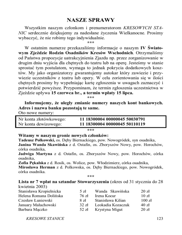 NASZE SPRAWY Wszystkim naszym członkom i prenumeratorom KRESOWYCH STANIC serdecznie dziękujemy za nadesłane życzenia Wielkanocne. Prosimy wybaczyć, że nie robimy tego indywidualnie. *** W ostatnim numerze przekazaliśmy informacje o naszym IV Światowym Zjeździe Rodzin Osadników Kresów Wschodnich. Otrzymaliśmy od Państwa propozycje uatrakcyjnienia Zjazdu np. przez zorganizowanie w drugim dniu wyjścia dla chętnych do teatru lub na operę. Jesteśmy w stanie sprostać tym postulatom, wymaga to jednak pokrycia dodatkowych kosztów. My jako organizatorzy gwarantujemy autokar który zawiezie i przywiezie uczestników z teatru lub opery. W celu zorientowania się w ilości chętnych prosimy by wypełniając kartę zgłoszenia w uwagach zaznaczyć i potwierdzić powyższe. Przypominam, że termin zgłoszenia uczestnictwa w Zjeździe upływa 15 czerwca br., a termin wpłaty 15 lipca. *** Informujemy, że uległy zmianie numery naszych kont bankowych. Adres i nazwa banku pozostają te same. Oto nowe numery: Nr konta złotówkowego: 11 18300004 00000045 50030791 Nr konta dewizowego: 11 18300004 00000045 50110119 *** Witamy w naszym gronie nowych członków: Tadeusz Polkowski, os. Dęby Biernackiego, pow. Nowogródek, syn osadnika, Janina Wanda Skawińska z d. Ostafin, os. Zboryszów Nowy, pow. Horochów, córka osadnika, Jadwiga Martyna z d. Ostafin, os. Zboryszów Nowy, pow. Horochów, córka osadnika, Zofia Pękalska z d. Rosik, os. Wolice, pow. Włodzimierz, córka osadnika, Mirosława Herman z d. Polkowska, os. Dęby Biernackiego, pow. Nowogródek, córka osadnika. *** Lista nr 7 wpłat na sztandar Stowarzyszenia (okres od 31 stycznia do 28 kwietnia 2003) Stanisława Kropielnicka Helena Romana Dolińska Czesław Łuniewski January Małachowski Barbara Mączko KRESOWE STANICE 5 zł 76 zł 8 zł 32 zł 52 zł Wanda Skawińska Irena Kocur Stanisława Kilian Leokadia Kozaczuk Krystyna Migut 20 zł 10 zł 100 zł 40 zł 20 zł 123 Anna Szafałowicz Mieczysław Sekieta Stanisława Czarkowska Irena Oborzyńska Zofia Zawisza Janina Jancz Józefa Kornecka Adam Drozd Feliks Lachman 12 zł 12 zł 30 zł 26 zł 30 zł 22 zł 28 zł 500 zł 10 zł Bronisława Drozd Kazimierz Szymański Władysław Nycz Irena Hensol Mirosława Herman Zofia Daniszewska Maria Łój ks. Jan Sosnowski 27 zł 18 zł 32 zł 12 zł 20 zł 52 zł 32 zł 22 zł Uchwałą III Zjazdu realizowaną przez Zarząd jest fundacja Sztandaru Stowarzyszenia. Pierwszą informację o zbiórce na ten cel zamieściliśmy w numerze 4/2001 (15) KRESOWYCH STANIC. Na naszym IV Zjeździe kończymy akcję Sztandar Stowarzyszenia. Dziękujemy wszystkim tym którzy przyczynili się do powstania naszego Sztandaru. Ofiarność w kraju i za granicą, a szczególnie w Kanadzie była wielka i spontaniczna. Każdy kto wpłacił na ten cel, otrzyma specjalne podziękowanie w którym zamieściliśmy rysunek i krótką historię powstawania naszego sztandaru. Do aktu erekcyjnego sztandaru zostanie dołączona pełna lista ofiarodawców. Tak jak pisaliśmy w numerze 4/2001 KRESOWYCH STANIC, osoby które wpłacą najwyższe kwoty, będą upamiętnione imiennymi gwoździami wbitymi w drzewiec. Tych gwoździ na dzień dzisiejszy zamówiliśmy 30 szt. Uroczyste wbijanie gwoździ odbędzie się podczas pierwszego dnia IV Zjazdu. *** Lista naszych darczyńców na działalność na działalność Stowarzyszenia (obejmuje okres od 31 stycznia do 28 kwietnia 2003): Barbara Ursyn Niemcewicz Stanisława Maliszewska Bronisława Pawełkiewicz Henryka Dobosz Szczepan Kurzymski Tadeusz Skoczylas Irena Mazurek Leokadia Kozaczuk Irena Oborzyńska Łucja Helena Łysy Józefa Świątkowska 50 zł 73 zł 52 zł 8 zł 52 zł 48 zł 15 zł 10 zł 22 zł 18 zł 52 zł Bolesław Stramski 48 zł Irena i Władysław Gordonowie 74 zł Helena Romana Dolińska 12 zł Irena Kocur 28 zł Franciszka Dobrzycka 62 zł Helena Skoczylas 26 zł January Małachowski 40 zł Stanisława Czarkowska 22 zł Konrad Harasimowicz 52 zł Zofia Zawisza 22 zł Helena Domagała 22 zł Ponadto ofiarowali: Stanisława Maliszewska – 100 zł na kościół w Klecku, Bronisława Drozd – 25 zł na kościoły i ks. Stanisław Małkowski – 100 zł dla ks. Gmitrzuka i kleryków w Rzymie. 124 KRESOWE STANICE Wszystkim darczyńcom bardzo serdecznie, dziękujemy *** Miło nam jest powiadomić, że członek naszego Stowarzyszenia inż. Kazimierz Szymański z Krakowa, działając na podstawie upoważnienia proboszcza i rady parafialnej w Klecku, potwierdzonego przez księdza kardynała Świątka, a także za zgodą księży proboszczów krakowskich kościołów w Nowej Hucie zebrał w dniach 4 stycznia i 23 lutego br. kwotę 13.800 zł i 105 USD co po wymianie złotówek w banku dało łączną kwotę 3.570 USD i 40 centów oraz 50 euro centów. Dziękujemy koledze Kazimierzowi Szymańskiemu za inicjatywę i wielodniowe trudy przy zbieraniu datków na budowę kościoła w Klecku. Kolega Szymański zapewnił nas, że nadal będzie w innych kościołach Krakowa zbierał datki na ten cel. Dziękujemy też serdecznie wszystkim parafianom kościołów w Nowej Hucie za złożone ofiary serca na budowę kościoła w Klecu. Należy nadmienić, że kol. Kazimierz Szymański w dniach zbiórki na każdej Mszy Św., za zgodą księży proboszczów, przemawiał do uczestników Eucharystii, informując o budowie kościoła na Białorusi w dawnym województwie nowogródzkim i potrzebie dalszej zbiórki na ten cel. W dniu 10 kwietnia br. podczas bytności ks. Erwina Wieczorka (proboszcza z Klecka) w Warszawie powyższa kwota tj. 3570 USD została mu przekazana. Przekazano też. kwotę 702 USD od naszego Stowarzyszenia (z darów imiennych naszych członków). Łącznie ks. Proboszcz Erwin Wieczorek otrzymał 4.202 USD. Budowa kościoła została rozpoczęta, zatwierdzony został projekt budowlany, ogrodzono plac robót, dokonano zasilania placu robót w energię elektryczna i rozpoczęto przygotowania do wykopów fundamentów.