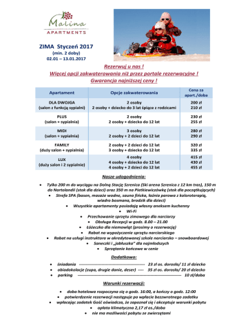 ZIMA Styczeń 2017 (min. 2 doby) 02.01 – 13.01.2017 Rezerwuj u nas ! Więcej opcji zakwaterowania niż przez portale rezerwacyjne ! Gwarancja najniższej ceny ! Apartament Opcje zakwaterowania Cena za apart./doba DLA DWOJGA (salon z funkcją sypialni) 2 osoby 2 osoby + dziecko do 3 lat śpiące z rodzicami 200 zł 210 zł PLUS (salon + sypialnia) 2 osoby 2 osoby + dziecko do 12 lat 230 zł 255 zł MIDI (salon + sypialnia) 3 osoby 2 osoby + 2 dzieci do 12 lat 280 zł 290 zł FAMILY (duży salon + sypialnia) 2 osoby + 2 dzieci do 12 lat 3 osoby + dziecko do 12 lat 320 zł 335 zł LUX (duży salon i 2 sypialnie) 4 osoby 4 osoby + dziecko do 12 lat 4 osoby + 2 dzieci do 12 lat 415 zł 430 zł 455 zł Nasze udogodnienia: Tylko 200 m do wyciągu na Dolną Stację Szrenica (Ski arena Szrenica z 12 km tras), 150 m do Nartolandii (stok dla dzieci) oraz 350 m na Pietkiewiczówkę (stok dla początkujących) Strefa SPA (basen, masaże wodne, sauna fińska, łaźnia parowa z koloroterapią, wiadro bosmana, brodzik dla dzieci) Wszystkie apartamenty posiadają własny aneksem kuchenny Wi-Fi Przechowanie sprzętu zimowego dla narciarzy Obsługa Recepcji w godz. 8.00 – 21.00 Łóżeczko dla niemowląt (prosimy o rezerwację) Rabat na wypożyczenie sprzętu narciarskiego Rabat na usługi instruktora w akredytowanej szkole narciarsko – snowboardowej Saneczki i „jabłuszka” dla najmłodszych Sprzątanie końcowe w cenie Dodatkowo: śniadania ----------------------------------------------- 23 zł os. dorosła/ 11 zł dziecko obiadokolacje (zupa, drugie danie, deser) ---- 35 zł os. dorosła/ 20 zł dziecko parking -------------------------------------------------------------------------- 10 zł/doba Warunki rezerwacji: doba hotelowa rozpoczyna się o godz. 16:00, a kończy o godz. 12:00 potwierdzenie rezerwacji następuje po wpłacie bezzwrotnego zadatku wpłacając zadatek Gość oświadcza, że zapoznał się i akceptuje warunki pobytu opłata klimatyczna 2,17 zł os./doba nie ma możliwości pobytu ze zwierzętami
