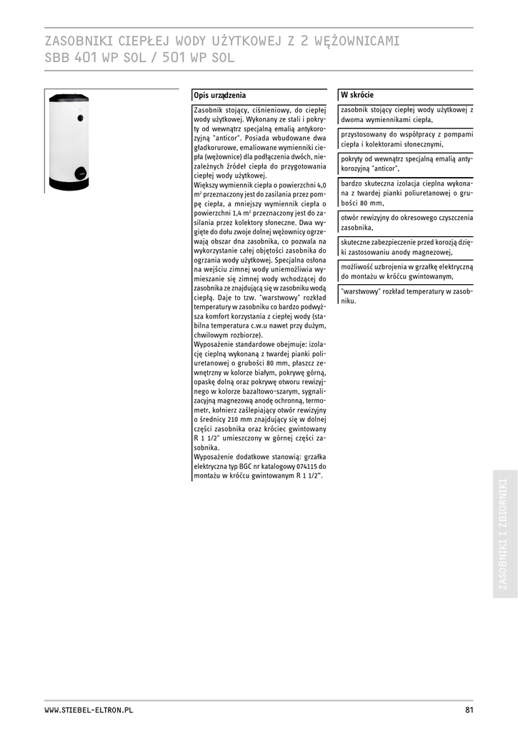 ZASOBNIKI CIEP£EJ WODY U¯YTKOWEJ Z 2 WʯOWNICAMI SBB 401 WP SOL / 501 WP SOL WWW.STIEBEL-ELTRON.PL Opis urz¹dzenia W skrócie Zasobnik stoj¹cy, ciœnieniowy, do ciep³ej wody u¿ytkowej. Wykonany ze stali i pokryty od wewn¹trz specjaln¹ emali¹ antykorozyjn¹ "anticor". Posiada wbudowane dwa g³adkorurowe, emaliowane wymienniki ciep³a (wê¿ownice) dla pod³¹czenia dwóch, niezale¿nych Ÿróde³ ciep³a do przygotowania ciep³ej wody u¿ytkowej. Wiêkszy wymiennik ciep³a o powierzchni 4,0 m2 przeznaczony jest do zasilania przez pompê ciep³a, a mniejszy wymiennik ciep³a o powierzchni 1,4 m2 przeznaczony jest do zasilania przez kolektory s³oneczne. Dwa wygiête do do³u zwoje dolnej wê¿ownicy ogrzewaj¹ obszar dna zasobnika, co pozwala na wykorzystanie ca³ej objêtoœci zasobnika do ogrzania wody u¿ytkowej. Specjalna os³ona na wejœciu zimnej wody uniemo¿liwia wymieszanie siê zimnej wody wchodz¹cej do zasobnika ze znajduj¹c¹ siê w zasobniku wod¹ ciep³¹. Daje to tzw. "warstwowy" rozk³ad temperatury w zasobniku co bardzo podwy¿sza komfort korzystania z ciep³ej wody (stabilna temperatura c.w.u nawet przy du¿ym, chwilowym rozbiorze). Wyposa¿enie standardowe obejmuje: izolacjê ciepln¹ wykonan¹ z twardej pianki poliuretanowej o gruboœci 80 mm, p³aszcz zewnêtrzny w kolorze bia³ym, pokrywê górn¹, opaskê doln¹ oraz pokrywê otworu rewizyjnego w kolorze bazaltowo-szarym, sygnalizacyjn¹ magnezow¹ anodê ochronn¹, termometr, ko³nierz zaœlepiaj¹cy otwór rewizyjny o œrednicy 210 mm znajduj¹cy siê w dolnej czêœci zasobnika oraz króciec gwintowany R 1 1/2" umieszczony w górnej czêœci zasobnika. Wyposa¿enie dodatkowe stanowi¹: grza³ka elektryczna typ BGC nr katalogowy 074115 do monta¿u w króæcu gwintowanym R 1 1/2”. zasobnik stoj¹cy ciep³ej wody u¿ytkowej z dwoma wymiennikami ciep³a, przystosowany do wspó³pracy z pompami ciep³a i kolektorami s³onecznymi, pokryty od wewn¹trz specjaln¹ emali¹ antykorozyjn¹ "anticor", bardzo skuteczna izolacja cieplna wykonana z twardej pianki poliuretanowej o gruboœci 80 mm, otwór rewizyjny do okresowego czyszczenia zasobnika, skuteczne zabezpieczenie przed korozj¹ dziêki zastosowaniu anody magnezowej, mo¿liwoœæ uzbrojenia w grza³kê elektryczn¹ do monta¿u w króæcu gwintowanym, ZASOBNIKI I ZBIORNIKI "warstwowy" rozk³ad temperatury w zasobniku. 81 ZASOBNIKI CIEP£EJ WODY U¯YTKOWEJ Z 2 WʯOWNICAMI SBB 401 WP SOL / 501 WP SOL Typ SBB 401 WP SOL SBB 501 WP SOL Nr katalogowy 221361 227534 400 500 Dane techniczne Pojemnoœæ dm3 Wysokoœæ mm 1875 1984 Wymiar pochylonego urz¹dzania mm 1950 2035 810 Œrednica wraz z izolacj¹ mm 750 Gruboœæ izolacji cieplnej mm 80 Maksymalna temperatura zbiornik/wê¿ownica Maksymalne ciœnienie zbiornik/wê¿ownica Ciê¿ar O C bar 95/110 10/10 kg 222 mm 210 kWh/24h 2,3 Powierzchnia wê¿ownicy m2 4,0 5,0 Pojemnoœæ wê¿ownicy dm3 23,9 29,8 hPa (mbar) 66 80 Powierzchnia wê¿ownicy m2 1,4 Pojemnoœæ wê¿ownicy dm3 11,7 Œrednica otworu ko³nierza Zu¿ycie energii na podtrzymanie temperatury wg. DIN 4753 przy twodyOC i tpowietrza = 20OC 275 2,6 Wê¿ownica górna Straty ciœnienie przy 1 m3/h Wê¿ownica dolna ZASOBNIKI I ZBIORNIKI Straty ciœnienie przy 1 m3/h Wymiary w mm 82 hPa (mbar) 24 (240)
