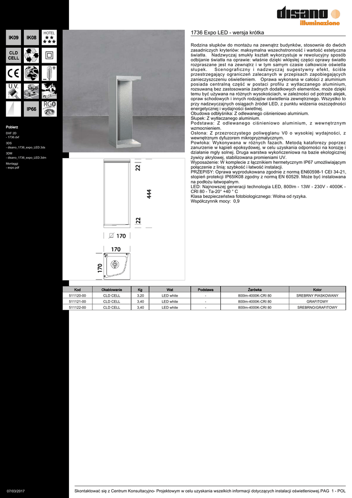 1736 Expo LED - wersja krótka Rodzina słupków do montażu na zewnątrz budynków, stosownie do dwóch zasadniczych kryteriów: maksymalna wszechstronność i wartość estetyczna światła. Nadzwyczaj smukły kształt wykorzystuje w rewolucyjny sposób odbijanie światła na oprawie: właśnie dzięki wklęsłej części oprawy światło rozpraszane jest na zewnątrz i w tym samym czasie całkowicie oświetla słupek. Scenograficzny i nadzwyczaj sugestywny efekt, ściśle przestrzegający ograniczeń zalecanych w przepisach zapobiegających zanieczyszczeniu oświetleniem. Oprawa wykonana w całości z aluminium posiada centralną część w postaci profilu z wytłaczanego aluminium, rozsuwaną bez zastosowania żadnych dodatkowych elementów, może dzięki temu być używana na różnych wysokościach, w zależności od potrzeb alejek, opraw schodowych i innych rodzajów oświetlenia zewnętrznego. Wszystko to przy nadzwyczajnych osiągach źródeł LED, z punktu widzenia oszczędności energetycznej i wydajności świetlnej. Obudowa odbłyśnika: Z odlewanego ciśnieniowo aluminium. Słupek: Z wytłaczanego aluminium. Podstawa: Z odlewanego ciśnieniowo aluminium, z wewnętrznym wzmocnieniem. Osłona: Z przezroczystego poliwęglanu V0 o wysokiej wydajności, z wewnętrznym dyfuzorem mikropryzmatycznym. Powłoka: Wykonywana w różnych fazach. Metodą kataforezy poprzez zanurzenie w kąpieli epoksydowej, w celu uzyskania odporności na korozję i działanie mgły solnej. Druga warstwa wykończeniowa na bazie ekologicznej żywicy akrylowej, stabilizowana promieniami UV. Wyposażenie: W komplecie z łącznikiem hermetycznym IP67 umożliwiającym połączenie z linią: szybkość i łatwość instalacji. PRZEPISY: Oprawa wyprodukowana zgodnie z normą EN60598-1 CEI 34-21, stopień protekcji IP65IK08 zgodny z normą EN 60529. Może być instalowana na podłożu łatwopalnym. LED: Najnowszej generacji technologia LED, 800lm - 13W - 230V - 4000K CRI 80 - Ta-20° +40 ° C Klasa bezpieczeństwa fotobiologicznego: Wolna od ryzyka. Współczynnik mocy: 0,9 Pobierz DXF 2D - 1736.dxf 3DS - disano_1736_expo_LED.3ds 3DM - disano_1736_expo_LED.3dm Montaggi - expo.pdf 07/03/2017 Kod Okablowanie Kg Wat Podstawa Źarówka Kolor 511120-00 CLD CELL 3,20 LED white - 800lm-4000K-CRI 80 SREBRNY PIASKOWANY 511121-00 CLD CELL 3,40 LED white - 800lm-4000K-CRI 80 GRAFITOWY 511122-00 CLD CELL 3,40 LED white - 800lm-4000K-CRI 80 SREBRNO/GRAFITOWY Skontaktować się z Centrum Konsultacyjno- Projektowym w celu uzyskania wszelkich informacji dotyczących instalacji oświetleniowej. PAG 1 - POL