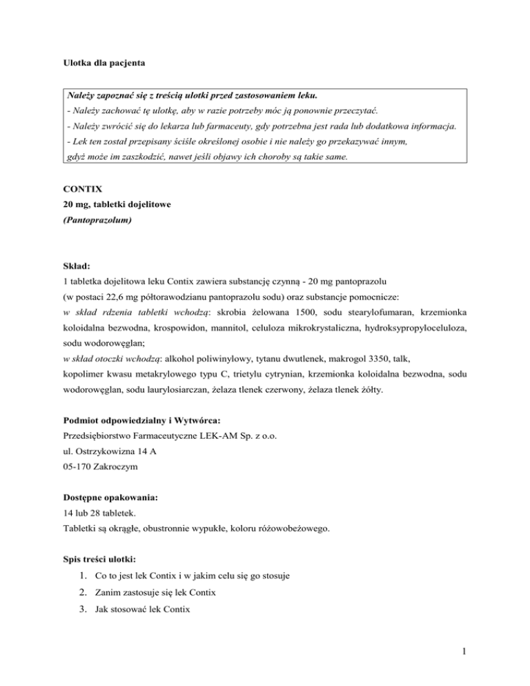 Ulotka dla pacjenta Należy zapoznać się z treścią ulotki przed zastosowaniem leku. - Należy zachować tę ulotkę, aby w razie potrzeby móc ją ponownie przeczytać. - Należy zwrócić się do lekarza lub farmaceuty, gdy potrzebna jest rada lub dodatkowa informacja. - Lek ten został przepisany ściśle określonej osobie i nie należy go przekazywać innym, gdyż może im zaszkodzić, nawet jeśli objawy ich choroby są takie same. CONTIX 20 mg, tabletki dojelitowe (Pantoprazolum) Skład: 1 tabletka dojelitowa leku Contix zawiera substancję czynną - 20 mg pantoprazolu (w postaci 22,6 mg półtorawodzianu pantoprazolu sodu) oraz substancje pomocnicze: w skład rdzenia tabletki wchodzą: skrobia żelowana 1500, sodu stearylofumaran, krzemionka koloidalna bezwodna, krospowidon, mannitol, celuloza mikrokrystaliczna, hydroksypropyloceluloza, sodu wodorowęglan; w skład otoczki wchodzą: alkohol poliwinylowy, tytanu dwutlenek, makrogol 3350, talk, kopolimer kwasu metakrylowego typu C, trietylu cytrynian, krzemionka koloidalna bezwodna, sodu wodorowęglan, sodu laurylosiarczan, żelaza tlenek czerwony, żelaza tlenek żółty. Podmiot odpowiedzialny i Wytwórca: Przedsiębiorstwo Farmaceutyczne LEK-AM Sp. z o.o. ul. Ostrzykowizna 14 A 05-170 Zakroczym Dostępne opakowania: 14 lub 28 tabletek. Tabletki są okrągłe, obustronnie wypukłe, koloru różowobeżowego. Spis treści ulotki: 1. Co to jest lek Contix i w jakim celu się go stosuje 2. Zanim zastosuje się lek Contix 3. Jak stosować lek Contix 1 4. Możliwe działania niepożądane 5. Przechowywanie leku Contix 6. Inne informacje 1. Co to jest lek Contix i w jakim celu się go stosuje Lek Contix zawiera, jako substancję czynną, pantoprazol, który zmniejsza wydzielanie kwasu solnego, wytwarzanego przez komórki okładzinowe błony śluzowej żołądka. Pantoprazol silnie i długotrwale hamuje wydzielanie kwasu solnego na czczo oraz wydzielanie pobudzane poprzez różne bodźce, np. pokarm, stres. Maksymalne działanie pantoprazolu występuje po około 2 - 2,5 godzinach po zażyciu leku Contix. Lek Contix stosowany jest w: • łagodnej postaci refluksowego zapalenia przełyku, • zapobieganiu nawrotom i długotrwałym leczeniu refluksowego zapalenia przełyku, • celu ochrony błony śluzowej żołądka i dwunastnicy przed powstaniem owrzodzeń u pacjentów z grupy zwiększonego ryzyka, stosujących długotrwale nieselektywne niesteroidowe leki przeciwzapalne (NLPZ). 2. Zanim zastosuje się lek Contix Nie należy stosować leku Contix: - jeśli u pacjenta występuje nadwrażliwość (uczulenie) na pantoprazol lub którykolwiek z pozostałych składników leku Contix. Zachować szczególną ostrożność stosując Contix: - przed rozpoczęciem leczenia należy wykluczyć występowanie nowotworu przełyku lub żołądka, ponieważ pantoprazol może maskować objawy choroby nowotworowej, - długotrwałe stosowanie pantoprazolu może spowodować zmniejszenie wchłaniania witaminy B12 , - leczenie pantoprazolem może spowodować niewielkie zwiększenie ryzyka zakażeń żołądkowojelitowych spowodowanych przez takie bakterie, jak Salmonella i Campylobacter, - jeśli po 4 tygodniach stosowania leku Contix objawy nie ustępują, należy zgłosić się do lekarza w celu wykonania ponownych badań lekarskich. Należy skonsultować się z lekarzem, nawet jeśli powyższe ostrzeżenia dotyczą sytuacji występujących w przeszłości. Stosowanie leku Contix z jedzeniem i piciem Lek Contix należy przyjmować na godzinę przed posiłkiem. 2 Ciąża Przed zastosowaniem każdego leku należy poradzić się lekarza. Brak jest wystarczających danych dotyczących bezpieczeństwa stosowania pantoprazolu u kobiet w ciąży. W związku z powyższym lek może być stosowany jedynie w przypadku, gdy lekarz zadecyduje, że korzyść dla matki wynikająca ze stosowania leku Contix przewyższa ewentualne ryzyko dla płodu. Karmienie piersią Przed zastosowaniem każdego leku należy poradzić się lekarza. Nie wiadomo, czy pantoprazol przenika do mleka kobiecego. Prowadzenie pojazdów i obsługa maszyn Brak danych wskazujących na wpływ pantoprazolu na zdolność prowadzenia pojazdów i obsługiwanie urządzeń mechanicznych w ruchu. Niezbyt często (u mniej niż 1 na 100 osób) pantoprazol wywołuje niepożądane działania, takie jak zawroty głowy i niewyraźne widzenie, mogące mieć wpływ na sprawność psychofizyczną. Stosowanie innych leków Należy poinformować lekarza o wszystkich przyjmowanych ostatnio lekach, nawet tych, które wydawane są bez recepty. Lek Contix hamuje wydzielania kwasu solnego, dlatego też może zmniejszać wchłanianie leków, których dostępność zależna jest od odczynu pH soku żołądkowego (np. ketokonazol – lek przeciwgrzybiczy). Pantoprazol jest metabolizowany w wątrobie przez specyficzny cytochrom P450 i może wpływać na metabolizm innych leków. Nie stwierdzono istotnego oddziaływania podczas jednoczesnego zażywania pantoprazolu oraz amoksycykliny (antybiotyku z grupy penicylin), diazepamu (leku stosowanego w stanach lękowych), digoksyny (leku stosowanego w leczeniu niewydolności i zaburzeń rytmu serca), diklofenaku, naproksenu, piroksykamu (leków z grupy niesteroidowych przeciwzapalnych NLZP, stosowanych m.in. w leczeniu chorób reumatycznych), doustnych środków antykoncepcyjnych, fenprokumonu, warfaryny (leków przeciwzakrzepowych), fenytoiny, karbamazepiny (leków przeciwpadaczkowych), glibenklamidu (leku stosowanego w cukrzycy), metoprololu (leku stosowanego w chorobach serca), nifedypiny (leku stosowanego w leczeniu nadciśnienia tętniczego), teofiliny (leku stosowanego w leczeniu astmy oskrzelowej), kofeiny, etanolu. Nie zaobserwowano również oddziaływania pantoprazolu z innymi lekami zobojętniającymi sok żołądkowy. 3 3. Jak stosować lek Contix Lek Contix tabletki dojelitowe 20 mg należy stosować zgodnie z zaleceniami lekarza. W przypadku wątpliwości należy ponown