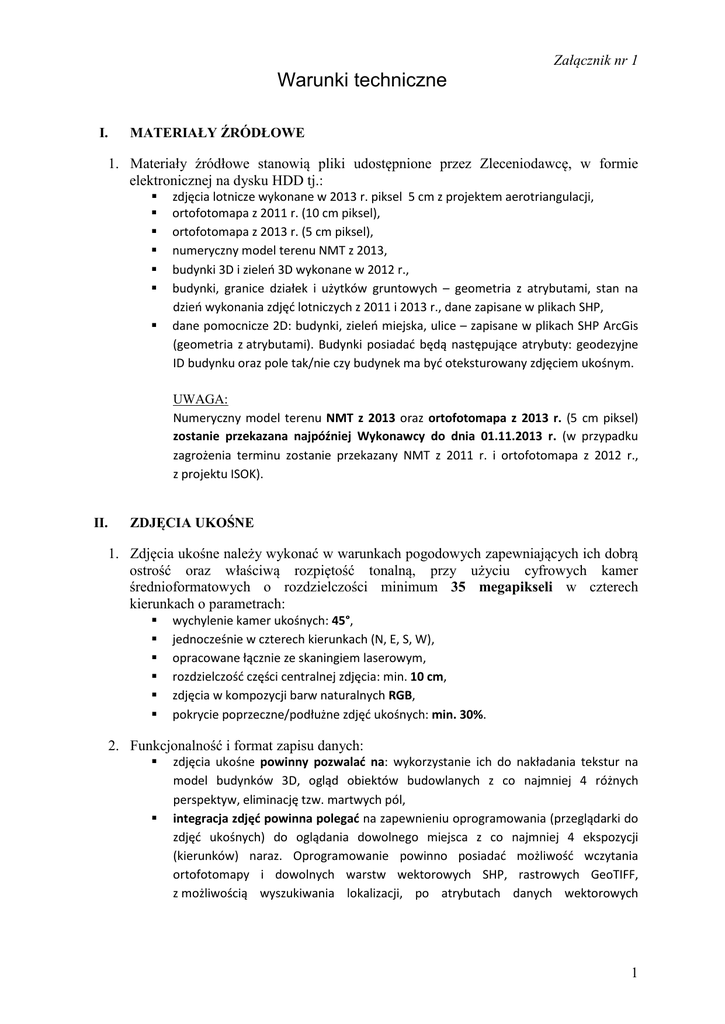 Załącznik nr 1 Warunki techniczne I. MATERIAŁY ŹRÓDŁOWE 1. Materiały źródłowe stanowią pliki udostępnione przez Zleceniodawcę, w formie elektronicznej na dysku HDD tj.: zdjęcia lotnicze wykonane w 2013 r. piksel 5 cm z projektem aerotriangulacji, ortofotomapa z 2011 r. (10 cm piksel), ortofotomapa z 2013 r. (5 cm piksel), numeryczny model terenu NMT z 2013, budynki 3D i zieleń 3D wykonane w 2012 r., budynki, granice działek i użytków gruntowych – geometria z atrybutami, stan na dzień wykonania zdjęć lotniczych z 2011 i 2013 r., dane zapisane w plikach SHP, dane pomocnicze 2D: budynki, zieleń miejska, ulice – zapisane w plikach SHP ArcGis (geometria z atrybutami). Budynki posiadać będą następujące atrybuty: geodezyjne ID budynku oraz pole tak/nie czy budynek ma być oteksturowany zdjęciem ukośnym. UWAGA: Numeryczny model terenu NMT z 2013 oraz ortofotomapa z 2013 r. (5 cm piksel) zostanie przekazana najpóźniej Wykonawcy do dnia 01.11.2013 r. (w przypadku zagrożenia terminu zostanie przekazany NMT z 2011 r. i ortofotomapa z 2012 r., z projektu ISOK). II. ZDJĘCIA UKOŚNE 1. Zdjęcia ukośne należy wykonać w warunkach pogodowych zapewniających ich dobrą ostrość oraz właściwą rozpiętość tonalną, przy użyciu cyfrowych kamer średnioformatowych o rozdzielczości minimum 35 megapikseli w czterech kierunkach o parametrach: wychylenie kamer ukośnych: 45°, jednocześnie w czterech kierunkach (N, E, S, W), opracowane łącznie ze skaningiem laserowym, rozdzielczość części centralnej zdjęcia: min. 10 cm, zdjęcia w kompozycji barw naturalnych RGB, pokrycie poprzeczne/podłużne zdjęć ukośnych: min. 30%. 2. Funkcjonalność i format zapisu danych: zdjęcia ukośne powinny pozwalać na: wykorzystanie ich do nakładania tekstur na model budynków 3D, ogląd obiektów budowlanych z co najmniej 4 różnych perspektyw, eliminację tzw. martwych pól, integracja zdjęć powinna polegać na zapewnieniu oprogramowania (przeglądarki do zdjęć ukośnych) do oglądania dowolnego miejsca z co najmniej 4 ekspozycji (kierunków) naraz. Oprogramowanie powinno posiadać możliwość wczytania ortofotomapy i dowolnych warstw wektorowych SHP, rastrowych GeoTIFF, z możliwością wyszukiwania lokalizacji, po atrybutach danych wektorowych 1 III. np. nr działki, adres. Wymagana jest także funkcja pomiarów odległości i powierzchni na zdjęciach ukośnych oraz proste nawigowanie po wczytanych danych, przekazane zdjęcia mają mieć wyznaczoną georeferencję oraz obrys rzutu trapezowego, całość zapisane w geobazie ArcGis. każde zdjęcie będzie posiadać unikalne podstawowe informacje (m.in. nr zdjęcia, współrzędne, phi, omega, kappa, roll, pitch, yaw,), które zostaną umieszczone jako atrybuty w pliku SHP lub jako metadane. LOTNICZY SKANING LASEROWY LIDAR 1. Skanowanie laserowe należy zrealizować zgodnie z poniższymi wytycznymi: lotniczy skaning laserowy należy wykonać jednocześnie z opracowaniem zdjęć ukośnych, gęstość chmury punktów: nie mniej niż 20 punktów na m2, pokrycie poprzeczne pomiędzy szeregami: min 50%, kąt skanowania: max 45°, kierunek nalotu: wschód – zachód lub północ – południe, skanowanie przy użyciu zapisu pełnej fali (tzw. Full-Waveform), rejestracja i zapis sygnału intensywności odbicia (Intensity), dokładność pomiaru wysokości Z: mh ≤ 0,15 m. 2. Funkcjonalność i format zapisu danych: IV. skaning laserowy LIDAR powinien pozwalać na: wykorzystanie go do budowy modeli 3D, dokonywanie pomiarów wysokości budynków, kątów nachylenia dachów, generowanie przekrojów, zapewnienie oprogramowania (przeglądarki) z możliwością przeglądania danych z lotniczego skaningu laserowego w kroju sekcyjnym mapy w skali 1:500. Ponadto wymagana jest funkcja pomiarów odległości i kątów oraz możliwość generowania przekrojów, wyrównana, sklasyfikowana chmura punktów, podzielona na arkusze w kroju sekcji mapy w skali 1:500, zapisana w układ współrzędnych xyz: PUWG 2000 strefa 6 (18°) i wysokościowym w układzie odniesienia Kronsztad 86, klasyfikacja według rozwarstwienia: 1- przetworzone; niesklasyfikowane; 2 - grunt; 3 - roślinność; 4 - zabudowa i obiekty inżynieryjne; 5 - szum, dodatkowo należy nadać atrybut RGB OPRACOWANIE DANYCH 3D 1. Opracowanie danych 3D należy zrealizować zgodnie z poniższymi wytycznymi: model budynków 3D: należy opracować na podstawie cyfrowych zdjęć lotniczych, danych pomocniczych 2D, zdjęć ukośnych i skaningu laserowego, dla wskazanego obszaru w załączniku 1a, co stanowi powierzchnię 35 km2 (liczba budynków nie przekracza 25 000), 2 w przypadku zgodności stanu ewidencyjnego ze stanem na zdjęciach lotniczych obrysy brył budynków 3D powinny pokrywać się z budynkami przekazanymi przez Zamawiającego – wówczas należy zachować zgodność ich identyfikatora. W przypadku rozbieżności należy przyjąć stan zgodny ze zdjęciami lotniczymi i nadać obiektom odrębny identyfikator zaczynający się od ID 5000, w wersji LoD2 – zgodnie z definicją standardu „City GeographyMarkup Language”, należy uwzględnić poziom szczegółowości: bryła budynku i struktura dachu (bez nakładania tekstur). Podstawa budynków, które są łącznikami muszą być na odpowiedniej wysokości (nie dotyczy bram). Wszystkie ściany budynków, łącznie z zabudową pierzejową lub bliźniaczą muszą być widoczne w modelu. dodatkowo dla ok. 50 budynków wskazanych przez Zamawiającego (dodatkowy atrybut do budynków) należy wykonać model budynków wraz z nałożeniem wysokorozdzielczych tekstur elewacji i dachów ze zdjęć ukośnych, stan na dzień wykonania lotniczego skaningu laserowego LIDAR, wymagana dokładność opracowania xyz: m xyz ≤ 0,20 m. model zieleni 3D: inwentaryzacja drzew obiekty punktowe (szata_drzewa_point) wraz z informacją atrybutową (KATEGORIA: drzewo_iglaste, drzewo_lisciaste; WYSOKOSC: wysokość względna; SZEROKOSC: sze