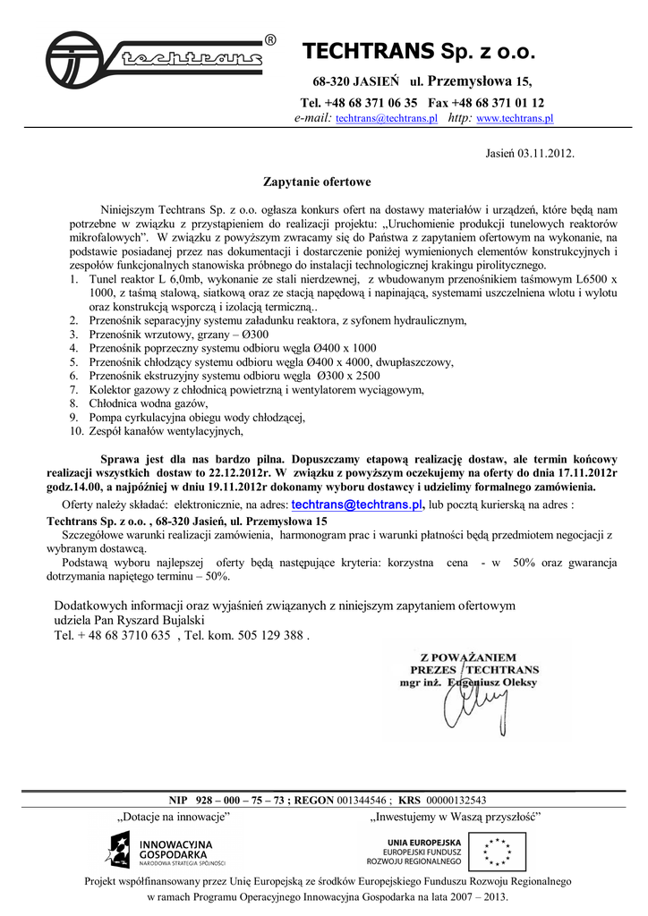 TECHTRANS Sp. z o.o. 68-320 JASIEŃ ul. Przemysłowa 15, Tel. +48 68 371 06 35 Fax +48 68 371 01 12 e-mail: [email protected] http: www.techtrans.pl Jasień 03.11.2012. Zapytanie ofertowe Niniejszym Techtrans Sp. z o.o. ogłasza konkurs ofert na dostawy materiałów i urządzeń, które będą nam potrzebne w związku z przystąpieniem do realizacji projektu: „Uruchomienie produkcji tunelowych reaktorów mikrofalowych”. W związku z powyższym zwracamy się do Państwa z zapytaniem ofertowym na wykonanie, na podstawie posiadanej przez nas dokumentacji i dostarczenie poniżej wymienionych elementów konstrukcyjnych i zespołów funkcjonalnych stanowiska próbnego do instalacji technologicznej krakingu pirolitycznego. 1. Tunel reaktor L 6,0mb, wykonanie ze stali nierdzewnej, z wbudowanym przenośnikiem taśmowym L6500 x 1000, z taśmą stalową, siatkową oraz ze stacją napędową i napinającą, systemami uszczelniena wlotu i wylotu oraz konstrukcją wsporczą i izolacją termiczną.. 2. Przenośnik separacyjny systemu załadunku reaktora, z syfonem hydraulicznym, 3. Przenośnik wrzutowy, grzany – Ø300 4. Przenośnik poprzeczny systemu odbioru węgla Ø400 x 1000 5. Przenośnik chłodzący systemu odbioru węgla Ø400 x 4000, dwupłaszczowy, 6. Przenośnik ekstruzyjny systemu odbioru węgla Ø300 x 2500 7. Kolektor gazowy z chłodnicą powietrzną i wentylatorem wyciągowym, 8. Chłodnica wodna gazów, 9. Pompa cyrkulacyjna obiegu wody chłodzącej, 10. Zespół kanałów wentylacyjnych, Sprawa jest dla nas bardzo pilna. Dopuszczamy etapową realizację dostaw, ale termin końcowy realizacji wszystkich dostaw to 22.12.2012r. W związku z powyższym oczekujemy na oferty do dnia 17.11.2012r godz.14.00, a najpóźniej w dniu 19.11.2012r dokonamy wyboru dostawcy i udzielimy formalnego zamówienia. Oferty należy składać: elektronicznie, na adres: [email protected], lub pocztą kurierską na adres : Techtrans Sp. z o.o. , 68-320 Jasień, ul. Przemysłowa 15 Szczegółowe warunki realizacji zamówienia, harmonogram prac i warunki płatności będą przedmiotem negocjacji z wybranym dostawcą. Podstawą wyboru najlepszej oferty będą następujące kryteria: korzystna cena - w 50% oraz gwarancja dotrzymania napiętego terminu – 50%. Dodatkowych informacji oraz wyjaśnień związanych z niniejszym zapytaniem ofertowym udziela Pan Ryszard Bujalski Tel. + 48 68 3710 635 , Tel. kom. 505 129 388 . NIP 928 – 000 – 75 – 73 ; REGON 001344546 ; KRS 00000132543 „Dotacje na innowacje” „Inwestujemy w Waszą przyszłość” Projekt współfinansowany przez Unię Europejską ze środków Europejskiego Funduszu Rozwoju Regionalnego w ramach Programu Operacyjnego Innowacyjna Gospodarka na lata 2007 – 2013.