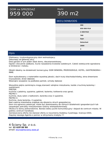 DOM na SPRZEDAŻ 959 000 Marki 390 m2 3831/3098/ODS 390 959 000 PLN 2 459 PLN 760 Sqm Detached 2000 2 Opis Efektowny, trzykondygnacyjny dom wolnostojacy. Odsunięty od głównej ulicy. Dwa garaże w tym jeden obok domu, dwustanowiskowy. Ogród i otoczenie zadbane, liczne nasadzenia krzewów ozdobnych. Całość estetycznie ogrodzona w klinkierze i metalu. Obiekt idealny na działalność komercyjną: DOM SENIORA, PRZEDSZKOLE, HOTEL, GASTRONOMIA i INNE. Dom wybudowany z materiałów wysokiej jakości, dach kryty blachodachówką, okna drewniane trzyszybowe, drzwi dębowe. Wewnątrz wszędzie na podłodze parkiet, schody dębowe Wszystkie piętra zamknięciu mogą stanowić odrębne mieszkania, każde z kuchnią łazienką i sypialniami. PARTER: kuchnia z jadalnią, sypialnia, gabinet, łazienka, kotłownia oraz garaż. PIĘTRO I: kuchnia, duży salon z balkonem, łazienka oraz 2 sypialnie. PIĘTRO II: Kuchnia, duża łazienka, 4 sypialnie. Nad częścią mieszkalną znajduje się obszerny strych gospodarczy. Dom ma ogromny potencjał, może być dostosowany do różnych działalności gospodarczych lub zaspokajać potrzeby mieszkaniowe rodziny wielopokoleniowej. Okolica to domy jednorodzinne. Bardzo dobry punkt komunikacyjny i dojazd do centrum miasta. W pobliżu centrum handlowe. Zamieszczona oferta nie stanowi oferty w rozumieniu Kodeksu Cywilnego. licencja 4355; Zapytaj naszego Agenta o pomoc w otrzymaniu kredytu !!! 4 Ściany Sp. z o.o. tel. 22 629 80 80 email: [email protected] 4 Ściany Sp. z o.o. 4 Ściany Sp. z o.o. Powered by TCPDF (www.tcpdf.org)
