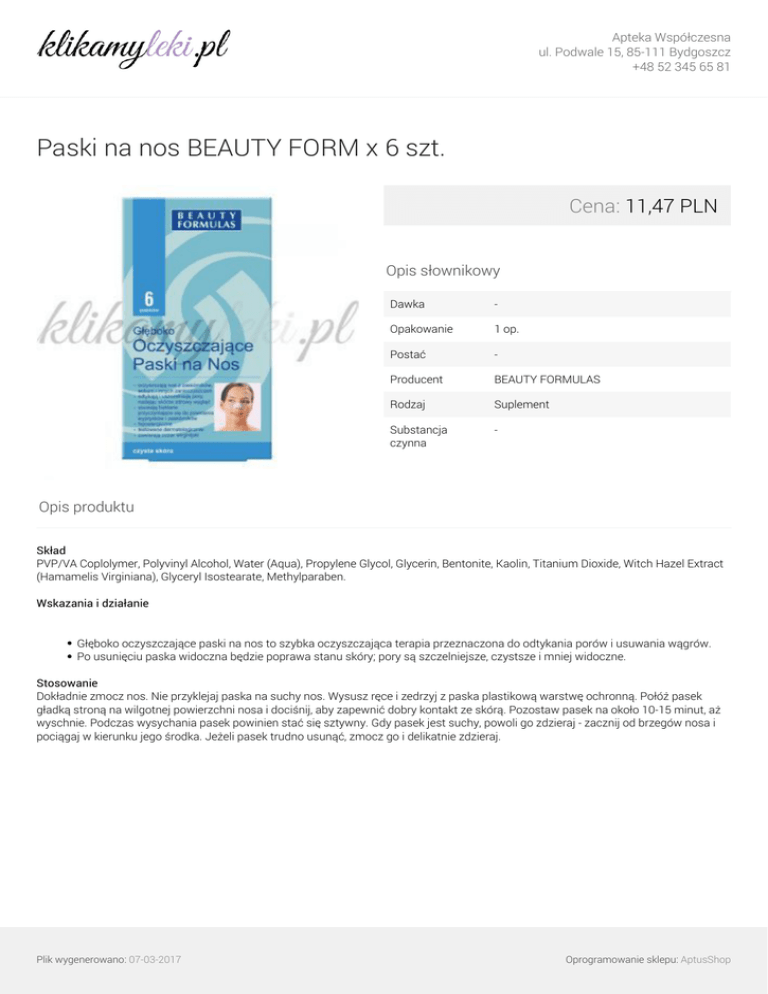 Apteka Współczesna ul. Podwale 15, 85-111 Bydgoszcz +48 52 345 65 81 Paski na nos BEAUTY FORM x 6 szt. Cena: 11,47 PLN Opis słownikowy Dawka - Opakowanie 1 op. Postać - Producent BEAUTY FORMULAS Rodzaj Suplement Substancja czynna - Opis produktu Skład PVP/VA Coplolymer, Polyvinyl Alcohol, Water (Aqua), Propylene Glycol, Glycerin, Bentonite, Kaolin, Titanium Dioxide, Witch Hazel Extract (Hamamelis Virginiana), Glyceryl Isostearate, Methylparaben. Wskazania i działanie Głęboko oczyszczające paski na nos to szybka oczyszczająca terapia przeznaczona do odtykania porów i usuwania wągrów. Po usunięciu paska widoczna będzie poprawa stanu skóry; pory są szczelniejsze, czystsze i mniej widoczne. Stosowanie Dokładnie zmocz nos. Nie przyklejaj paska na suchy nos. Wysusz ręce i zedrzyj z paska plastikową warstwę ochronną. Połóż pasek gładką stroną na wilgotnej powierzchni nosa i dociśnij, aby zapewnić dobry kontakt ze skórą. Pozostaw pasek na około 10-15 minut, aż wyschnie. Podczas wysychania pasek powinien stać się sztywny. Gdy pasek jest suchy, powoli go zdzieraj - zacznij od brzegów nosa i pociągaj w kierunku jego środka. Jeżeli pasek trudno usunąć, zmocz go i delikatnie zdzieraj. Plik wygenerowano: 07-03-2017 Powered by TCPDF (www.tcpdf.org) Oprogramowanie sklepu: AptusShop