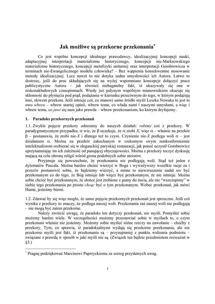 Jak możliwe są przekorne przekonania∗ Co jest wspólne koncepcji idealnego prawodawcy, idealizacyjnej koncepcji nauki, adaptacyjnej interpretacji materializmu historycznego, koncepcji nie-Marksowskiego materializmu historycznego, koncepcji metafizyki unitarnej oraz interpretacji Gombrowicza w terminach nie-Ewangelicznego modelu człowieka? – Bez wątpienia konsekwentne stosowanie metody idealizacyjnej. Lecz nawet to nie dotyka sedna umysłowości ich Autora. Łatwo to dostrzec, jeśli do prac składających się na wyżej wspomniane koncepcje dołączyć prace publicystyczne Autora – jak również niebagatelny fakt, iż ukazywały się one w niskonakładowych czasopismach. Wtedy już jedynym wspólnym mianownikiem okazuje się skłonność do płynięcia pod prąd, podążania w kierunku przeciwnym do tego, w którym podążają inni, słowem przekora. Jeśli istnieje coś, co stanowi samo źródło myśli Leszka Nowaka to jest to owo wbrew – wbrew utartej opinii, wbrew temu, co włada nami i naszymi umysłami, a więc i wbrew temu, co jawi się nam jako prawda – wbrew przekonaniom, ku którym dryfujemy. 1. Paradoks przekornych przekonań 1.1. Zwykle pojęcie przekory odnosimy do naszych działań: robimy coś z przekory. W paradygmatycznym przypadku, α wie, że β oczekuje, że α zrobi X, więc α – właśnie na przekór β – postanawia, że zrobi nie-X i dlatego też to czyni. Czynienie nie-X podlega woli α – jest działaniem α. Można na przekór zakochanym w rzekomym swym nonkonformizmie intelektualistom rozbierać się w eleganckiej paryskiej restauracji, jak ponoć uczynił Gombrowicz uprzytamniając im ich zależność od panującej obyczajowości. Można z przekory toczyć dyskusję mającą na celu obronę religii wśród grona podobnych sobie ateistów. Przyjmuje się powszechnie, że przekonania nie podlegają woli. Stąd też jeden z dylematów Pascala. Można bardzo chcieć wierzyć w Boga i wyważywszy wszelkie racje za i przeciw postanowić sobie, że będziemy wierzyć, a mimo to niewzruszenie nadal nie być przekonanym co do tego, że Bóg istnieje lub wręcz być przekonanym, że nie istnieje. Można sobie chcieć być przekonanym, że słońce jest zrobione z gumy do żucia, ale nie “wszczepimy” w siebie tego przekonania po prostu chcąc być o tym przekonanym. Wobec przekonań, jak mówi Hume, jesteśmy bierni. 1.2. Zdawać by się więc mogło, że samo pojęcie przekornych przekonań jest sprzeczne. Jeśli coś wynika z przekory to znaczy, że podlega naszej woli. Przekonania zaś naszej woli nie podlegają – nie mogą być zatem przekorne. Należy zwrócić uwagę, że paradoks ten dotyczy przekonań, nie myśli. Pomyśleć sobie możemy bardzo wiele. W szczególności możemy przestawiać sobie w myślach to, o czym przekonani właśnie nie jesteśmy. Możemy sobie myśleć różne rzeczy na zawołanie – choćby z przekory. Tym, co sprawia, iż paradoksalnymi wydają się przekorne przekonania, ale nie przekorne myśli jest fakt, iż przekonania są – przynajmniej z punktu widzenia podmiotu – związane z prawdą w sposób w jaki myśli nie są. (Związek ten będzie przedmiotem rozważań w §3.) ∗ Pragnę podziękować Marcinowi Paprzyckiemu za szereg przydatnych uwag. 1 1.3. Powyższy paradoks nie oznacza również, że niemożliwe są niby-przekorne przekonania. Może być tak, że ktoś żywi przekonania, które – tak się akurat składa – są niezgodne z powszechnymi oczekiwaniami, ale że ich geneza nie była związana ani z przekorą ani z jakimkolwiek wysiłkiem woli. W niniejszym tekście nie zamierzam rozstrzygać, które z przekonań Leszka Nowaka są przekorne, a które tylko niby-przekorne. Świadkowie genezy choćby części koncecpji L. Nowaka nie mogą nie zgodzić się z tezą, iż przynajmniej niektóre z jego przekonań w pełni zasługują na miano przekonań przekornych. Wychodzę więc z założenia, że przekorne przekonania istnieją i spróbuję doszukać się źródeł powyższego paradoksu raczej w naszym sposobie myślenia o przekonaniach niźli w nich samych. Uczynię to w dwóch krokach. W §2 wskażę na fakt, że istnieją dwa nurty myślenia o przekonaniach, z których tylko pierwszy stanowi podatny grunt dla powyższego paradoksu. Już refleksja więc nad tym faktem mogłaby stanowić wystarczającą podstawę dla odrzucenia rzekomej paradoksalności przekonań przekornych. Postawiono jednakże całkiem ogólną obiekcję (Williams 1970/1973), że idea jakichkolwiek przekonań wolicjonalnych jest nieakceptowalna. W §3 pokażę w jaki sposób zarzut ten można odeprzeć.1 2. Dwa sposoby myślenia o przekonaniach Poszczególne teorie przekonań odwołują się zasadniczo do dwóch głębokich metafor rządzących naszym myśleniem o przekonaniach. 2.1. Atomistyczno-naturalistyczne rozumienie przekonań opiera się na metaforze uderzenia. Przekonanie jest czymś, co w nas powstaje na skutek „uderzenia” pewnymi fragmentami świata zewnętrznego. Widzimy czerwone jabłko, fale świetlne padają na naszą siatkówkę, zostają przetwarzane, w rezultacie czego powstaje w nas przekonanie o tym, że znajduje się przed nami czerwone jabłko. (Empirystyczne teorie przekonań Hume’a czy Locke’a są klasycznymi przykładami tego stylu myślenia.) Przekonania percepcyjne są paradygmatycznymi przykładami przekonań dla tego ujęcia. 1 Nie można zbyt mocno podkreślić tego, że dostatecznie pełne rozpatrzenie omawianego zagadnienia wymagałoby podjęcia tu kwestii nader zdradliwej – a mianowicie, co mamy na myśli mówiąc, iż coś podlega naszej woli. Nie będę jednak w tym tekście tego zadania podejmować – tym bardziej, że miałam już okazję to czynić (1997) – ograniczę się do jednej uwagi. Zakres tego, co podlega naszej woli nie jest wyraźnie określony. Przyjmuje się zazwyczaj, że ślinienie się nie jest czymś, co podlega naszej woli. Bodziec pokarmu bezwiednie wyzwal