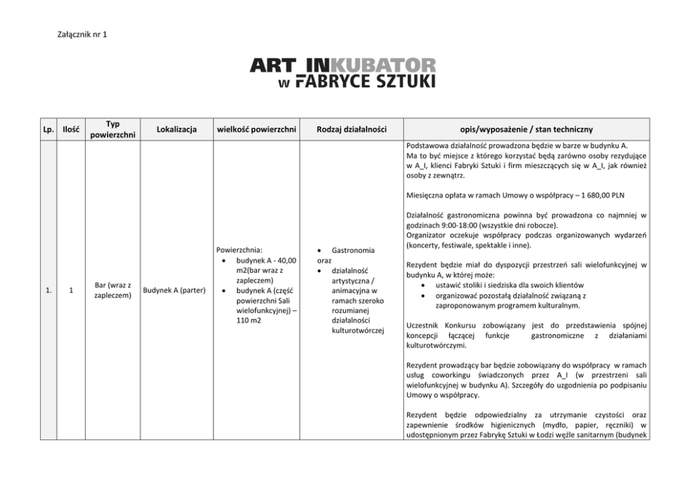 Załącznik nr 1 Lp. Ilość Typ powierzchni Lokalizacja wielkość powierzchni Rodzaj działalności opis/wyposażenie / stan techniczny Podstawowa działalność prowadzona będzie w barze w budynku A. Ma to być miejsce z którego korzystać będą zarówno osoby rezydujące w A_I, klienci Fabryki Sztuki i firm mieszczących się w A_I, jak również osoby z zewnątrz. Miesięczna opłata w ramach Umowy o współpracy – 1 680,00 PLN 1. 1 Bar (wraz z zapleczem) Budynek A (parter) Powierzchnia: budynek A - 40,00 m2(bar wraz z zapleczem) budynek A (część powierzchni Sali wielofunkcyjnej) – 110 m2 Gastronomia oraz działalność artystyczna / animacyjna w ramach szeroko rozumianej działalności kulturotwórczej Działalność gastronomiczna powinna być prowadzona co najmniej w godzinach 9:00-18:00 (wszystkie dni robocze). Organizator oczekuje współpracy podczas organizowanych wydarzeń (koncerty, festiwale, spektakle i inne). Rezydent będzie miał do dyspozycji przestrzeń sali wielofunkcyjnej w budynku A, w której może: ustawić stoliki i siedziska dla swoich klientów organizować pozostałą działalność związaną z zaproponowanym programem kulturalnym. Uczestnik Konkursu zobowiązany jest do przedstawienia spójnej koncepcji łączącej funkcje gastronomiczne z działaniami kulturotwórczymi. Rezydent prowadzący bar będzie zobowiązany do współpracy w ramach usług coworkingu świadczonych przez A_I (w przestrzeni sali wielofunkcyjnej w budynku A). Szczegóły do uzgodnienia po podpisaniu Umowy o współpracy. Rezydent będzie odpowiedzialny za utrzymanie czystości oraz zapewnienie środków higienicznych (mydło, papier, ręczniki) w udostępnionym przez Fabrykę Sztuki w Łodzi węźle sanitarnym (budynek Załącznik nr 1 A, parter) W trakcie przedsięwzięć organizowanych w A_I przez Organizatora Rezydent będzie miał możliwość prowadzenia działalności gastronomicznej w budynku C (zaplecze cateringowe w budynku C). Szczegółowy sposób współpracy w wyżej opisanym zakresie będzie ustalany indywidualnie dla każdego z przedsięwzięć. Bar budynek A w skład baru wchodzi 6 pomieszczeń: wc pracownicze, pokój socjalny, zmywalnia, rozdzielnia posiłków, magazyn podręczny, bufet; Rezydent zobowiązany jest do uzyskania wszelkich pozwoleń wymaganych przepisami prawa; dostosowanie pomieszczeń baru do wymogów sanitarnych leży po stronie Rezydenta; wykończenie: stan surowy do adaptacji w ramach uzgodnień z A_I oraz przepisami dotyczącymi prowadzenia działalności gastronomicznej; Zaplecze cateringu budynek C w skład wchodzi 6 pomieszczeń: bufet, rozdzielnia posiłków, pomieszczenie socjalne, pomieszczenie gospodarcze, 2 magazyny, zmywalnia, WC; wykończenie: stan surowy do adaptacji w ramach uzgodnień z A_I oraz przepisami dotyczącymi prowadzenia działalności gastronomicznej;