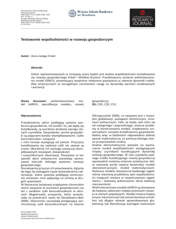 The Wroclaw School of Banking Research Journal ISSN 1643-7772 I eISSN 2392-1153 Vol. 15 I No. 5 Zeszyty Naukowe Wyższej Szkoły Bankowej we Wrocławiu ISSN 1643-7772 I eISSN 2392-1153 R. 15 I Nr 5 Testowanie współzależności w rozwoju gospodarczym Autor: Anna Janiga-Ćmiel Abstrakt Celem zaprezentowanych w niniejszej pracy badań jest analiza współzależności kształtowania się rozwoju gospodarczego Polski i Wielkiej Brytanii. Przedstawiony zostanie wielorównaniowy model GARCH, prezentujący wzajemne relatywne powiązania w zakresie dynamiki rozkładów empirycznych ze szczególnym zwróceniem uwagi na dynamikę wartości oczekiwanych i wariancji. Słowa kluczowe: wielorównaniowy model GARCH, specyfikacja modelu, rozwój gospodarczy. JEL: C01, C32, C51. Wprowadzenie (Skrzypczyński 2006), co związane jest z rozwojem globalizacji, postępem technicznym, zmianami politycznymi. Fakt, że każdy cykl różni się od następnego i poprzedniego, stwarza problemy w konstruowaniu modeli, znajdowaniu uniwersalnych narzędzi kształtowania gospodarek. Należy więc w badaniach odpowiednio dobrać aparat matematyczny, za pomocą którego można przeprowadzać analizy. Analiza ekonometryczna pozwala na wyznaczenie modeli współzależności występujących między czynnikami kształtującymi dynamikę rozwoju gospodarczego. W celu uzyskania spójnego źródła kształtującego rozwój gospodarczy wprowadzić możemy zmienne syntetyczne, które stanowią punkt wyjścia konstrukcji modeli ekonometrycznych, modeli matematycznych. Wybrane modele teoretyczne badanego zagadnienia stanowią przybliżony opis współzależności mających miejsce w rozpatrywanym zagadnieniu i stanowią jednocześnie obraz badanej rzeczywistości. Wielorównaniowe modele GARCH są stosowane do badania zależności między procesami rozwoju w różnych populacjach. Zbadać można między innymi niezmienność lub wzrost korelacji w krótkim lub długim okresie spowodowanym globalizacją lub liberalizacją wymagań stawianych Przeobrażenia, jakim podlegają systemy społeczno-gospodarcze, ich kształt i to, jak będą się kształtowały, są wynikiem działania szeregu różnych czynników. Gospodarka, wzrost gospodarki są pojęciami bardzo skomplikowanymi. Cykle koniunkturalne i związane z nimi recesje występują od zawsze. Przyczyny kształtowania się realizacji cykli nie zawsze są znane. Określenie ich wymaga zazwyczaj skomplikowanych rozwiązań, doświadczeń i czasochłonnych obserwacji. Pozyskane w ten sposób dane statystyczne pozwalają sprecyzować kierunki dalszego poziomu rozwoju gospodarczego. Poszukujemy przyczyn ich powstawania, dążymy do tego, by wzbogacić nasze doświadczenia i obserwacje. Jedne zjawiska podlegają samoczynnie zmianom, inne wpływają na zmiany w drugich zjawiskach. W literaturze światowej znajdujemy różnorodne teorie związane ze wzrostem gospodarczym czy też z zanikiem cykli koniunkturalnych w okresach długotrwałej prosperity, które powstawały na przestrzeni wielu lat (Drozdowicz-Bieć 2006). Ekonomiści zauważają postępującą synchronizację cykli koniunkturalnych na świecie Anna Janiga-Ćmiel Wydział Zarządzania Katedra Matematyki Uniwersytet Ekonomiczny w Katowicach The Wroclaw School of Banking Research Journal I ISSN 1643-7772 I eISSN 2392-1153 I Vol. 15 I No. 5 funkcjonowaniu zjawisk. Zbadać można wpływ postępu technologicznego w poszczególnych populacjach i odpowiedni wpływ jednej populacji na drugą. Modele GARCH spełniają również ważną rolę przy badaniu przepływu informacji między badanymi populacjami. Duże znaczenie przypisuje się modelom GARCH przy opisie zmienności rozwoju badanego zjawiska. Modele GARCH są odporne na wszelkie zmiany sytuacji w czasie powodujące niestabilność związków. Są odporne na szybkość zmian w przekazywanej informacji i stanowią uniwersalne podejście do wygładzania zniekształceń i przekłamań w przekazywanej informacji. Wielorównaniowe modele (Doman, Doman 2004) charakteryzuje duża zgodność z rzeczywistością badanego zjawiska. iloczynu odpowiednich warunkowych odchyleń standardowych. Modele DCC i CCC stosujemy do opisu dynamiki rozwoju zjawisk (Doman, Doman 2009), scharakteryzowanych za pomocą wielowymiarowych szeregów czasowych, przy czym model CCC w przypadku uzyskania stałej macierzy korelacji przy upływie czasu, a przy zmiennej macierzy korelacji model DCC. Wielowymiarowe procesy stochastyczne stanowią losowy opis dynamiki zjawiska, w którym mamy do czynienia z różnego rodzaju charakterem współzależności między poszczególnymi zmiennymi. W procesach gospodarczych stan oczekiwany zjawiska jest zmienny i zależny zasadniczo od upływu czasu oraz od innych czynników specyficznych dla rozpatrywanej gospodarki: (1) Wielowymiarowe ujęcie modelowania rozwojów gospodarczych Gdzie: t to jednostka czasowa związana z numeracją okresów badania empirycznego w latach 2001– 2012, czyli t = 1, …, 12, to uwarunkowania związane z działalnością gospodarczą w poprzednich latach kształtujące zarówno stan oczekiwany jak i czynniki losowe. Wielorównaniowy model GARCH (Franco, Zakoian 2009) wymaga sprecyzowania odrębnego opisu realizacji wartości oczekiwanych i zmienności wariancji. W takiej sytuacji proces stochastyczny ma losowość skupioną w składniku losowym i przedstawia się następująco: (2) y t = µt + ε t , Złożone procesy ekonomiczne możemy opisywać, wykorzystując między innymi autoregresyjny model klasy GARCH. Model ten podlegał z upływem czasu skomplikowanym modyfikacjom i rozszerzeniom. W literaturze znajdujemy dziesiątki możliwych rozszerzeń modelu GARCH zaproponowanych przez badaczy (Fiszeder 2009)] (Bollerslev, Ding, Granger, Hafner, Laurent, Chou i Kroner, Bera i Higgins, Engle i Nelson, Gourieroux, Osiewski i Pipień, Tsay, Bauwens, Laurent i Rombouts, Weron, Brzeszczyński i Kelm, Doman, Fiszeder). Nieustająca modyfikacja postaci m