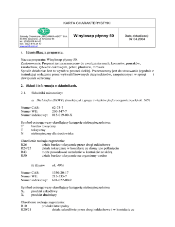 KARTA CHARAKTERYSTYKI Zakłady Chemiczne „ORGANIKA-AZOT” S.A. 43-600 Jaworzno, ul. Chopina 94 tel.: (032) 616 44 42 fax.: (032) 616 24 17 www.azot.com.pl Winylosep płynny 50 Data aktualizacji: 07.04.2004 Identyfikacja preparatu. 1. Nazwa preparatu: Winylosep płynny 50. Zastosowania: Preparat jest przeznaczony do zwalczania much, komarów, prusaków, karaluchów, rybików cukrowych, pcheł, pluskiew, mrówek. Sposób działania: Jest to wyrób w postaci ciekłej. Przeznaczony jest do stosowania (zgodnie z instrukcją) wyłącznie przez wykwalifikowanych dezynsektorów, zaopatrzonych w sprzęt i ekwipunek ochronny. 2. Skład i informacja o składnikach. 2.1. Składniki mieszaniny: a) Dichlorfos (DDVP) (insektycyd z grupy związków fosforoorganicznych) ok. 50% Numer CAS: Numer WE: Numer indeksowy: 62-73-7 200-547-7 015-019-00-X Symbol ostrzegawczy określający kategorię niebezpieczeństwa: T+ bardzo toksyczny T toksyczny N niebezpieczny dla środowiska Określenie rodzaju zagrożenia: R26 działa bardzo toksycznie przez drogi oddechowe R24/25 działa toksycznie w kontakcie ze skórą i po połknięciu R43 może powodować uczulenie w kontakcie ze skórą R50 działa bardzo toksycznie na organizmy wodne b) Ksylen Numer CAS: Numer WE: Numer indeksowy: ok. 40% 1330-20-17 215-535-7 601-022-00-9 Symbol ostrzegawczy określający kategorię niebezpieczeństwa Xn produkt szkodliwy Xi produkt drażniący Określenie rodzaju zagrożenia: R10 produkt łatwopalny R20/21 działa szkodliwie przez drogi oddechowe i w kontakcie ze Karta Charakterystyki – Winylosep płynny 50 ______________________________________________________________________________________________________________ skórą działa drażniąco na skórę R38 c) Sapogenat T 180 Numery identyfikacyjne: Numer CAS: 9046-09-7 d) Emulgator P-3 extra Numery identyfikacyjne: CAS: brak 3. Identyfikacja zagrożeń. Zagrożenie zdrowia: Substancja toksyczna, silnie drażniąca dla oczu. Działa toksycznie przez drogi oddechowe, w kontakcie ze skórą i po połknięciu. Wdychanie par może spowodować bóle i zawroty głowy, bóle brzucha, nudności, wymioty, zwężenie źrenic, łzawienie, ślinotok, poty, drgawki. Zagrożenie pożarowe: Substancja łatwo palna. Pary substancji mogą tworzyć mieszaniny wybuchowe z powietrzem.. Zagrożenie środowiska: Niebezpieczny dla środowiska. Bardzo toksyczny dla organizmów wodnych. Toksyczny dla pszczół. 4. Pierwsza pomoc. Drogi wnikania do organizmu: układ pokarmowy, układ oddechowy, skóra i oczy. Objawy i skutki: Wdychanie par może powodować bóle i zawroty głowy, bóle brzucha, nudności, wymioty, zwężenie źrenic, łzawienie, ślinotok, poty, drgawki. Objawy zatrucia mogą wystąpić nawet po wielu godzinach. Jeśli wystąpiły jakiekolwiek spośród wyżej wymienionych objawów, zwłaszcza jeśli znana jest przyczyna skażenia, przerwać pracę, zdjąć skażoną odzież, umyć skażoną skórę i włosy, nie dopuścić do jakiegokolwiek wysiłku, natychmiast wezwać lekarza i pokazać etykietę . Zasady pierwszej pomocy: Narażenie inhalacyjne: Poszkodowanego wyprowadzić na świeże powietrze, chronić przed utratą ciepła. Jeśli oddychanie jest utrudnione zastosować wspomaganie oddychania i wezwać lekarza. Skażenie oka: Przemywać oczy dużą ilością wody co najmniej 15 minut przy odwiniętych powiekach. Zasięgnąć porady lekarza. Skażenie skóry: Zdjąć zanieczyszczoną odzież, przemywać skórę dużą ilością wody i mydłem. Połknięcia: Nie powodować wymiotów, zasięgnąć natychmiastowej porady medycznej. Nie podawać do picia mleka. Zalecenia dla lekarza: 2 Karta Charakterystyki – Winylosep płynny 50 ______________________________________________________________________________________________________________ 1. Jeśli występują oznaki i objawy zatrucia, możliwie jak najszybciej wstrzyknąć 2 mg siarczanu atropiny (w przypadku dzieci w paru dawkach) i powtarzać (gdy to konieczne) dopóty, dopóki nie nastąpi pełna atropizacja. 2. Jeśli to możliwe, podać 1 g pralidoksyny domięśniowo. Powtórzyć po 3-4 godz. Inne środki zaradcze: 1. Zapewnić dostęp świeżego powietrza. 2. Obserwować oddech - możliwe, że będzie konieczna intubacja endotrachalną rurką lub tracheotomia w połączeniu ze sztucznym oddychaniem. 3. Zapewnić pacjentowi pełny odpoczynek i hospitalizować co najmniej 24 godziny. 5. Postępowanie w przypadku pożaru. Zalecane środki gaśnicze: CO2, proszek gaśniczy, piana, woda. Sprzęt ochronny: ubrać odpowiedni strój ochronny oraz sprzęt wspomagający oddychanie. Informacje dodatkowe: zbiorniki (beczki) narażone na działanie ognia lub wysokiej temperatury chłodzić rozproszonym prądem wody; o ile możliwe, usunąć z obszaru zagrożenia. Ogrzewany wyrób może się zapalić. Ze względu na zawartość składnika, którego pary z powietrzem tworzą mieszaniny wybuchowe, wyrób stwarza zagrożenie wybuchowe. 6. Postępowanie w przypadku niezamierzonego uwolnienia do środowiska. Wycieki i rozlania: Zlokalizować i zatrzymać wyciek, wyłączyć wszystkie źródła ognia, usunąć osoby z terenu zagrożenia, powiadomić policję i władze terenowe, przystąpić do usuwania awarii. Nie palić papierosów! W przypadku rozlania zasypać materiałem chłonnym (ziemia, piasek), zebrać do oznakowanego, pustego opakowania i przeznaczyć do utylizacji w porozumieniu ze specjalistami. Nie dopuścić do przedostania się preparatu do kanalizacji, zbiorników i ujęć wody. W przypadku przedostania się do kanalizacji i wód powiadomić odpowiednie władze. Ubranie ochronne: Nałożyć kombinezon, rękawice z kauczuku, fartuch, gumowe buty, okulary ochronne. 7. Postępowanie z preparatem i jego magazynowanie. Podczas stosowania i przechowywania produktu przestrzegać ogólnie obowiązujące przepisy bezpieczeństwa i higieny pracy. Przestrzegać zaleceń i warunków stosowania określonych przez producenta w instrukcji stoso