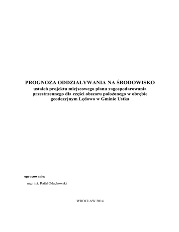 PROGNOZA ODDZIAŁYWANIA NA ŚRODOWISKO ustaleń projektu miejscowego planu zagospodarowania przestrzennego dla części obszaru położonego w obrębie geodezyjnym Lędowo w Gminie Ustka opracowanie: mgr inż. Rafał Odachowski WROCŁAW 2014 Spis treści 1.Wprowadzenie ........................................................................................................................3 1.1. Podstawa prawna, cel i zakres opracowania ..................................................................3 1.2. Metody pracy .................................................................................................................3 1.3. Wykorzystane materiały ................................................................................................4 1.4. Informacje o zawartości, głównych celach projektu MPZP ..........................................4 2.Ocena stanu i funkcjonowania środowiska oraz tendencje zmian przy braku realizacji MPZP ........................................................................................................................................5 2.1. Charakterystyka środowiska przyrodniczego ................................................................5 2.2. Stan oraz tendencje przeobrażeń środowiska przyrodniczego .........................................7 2.3. Tendencje przeobrażeń przy braku realizacji MPZP .......................................................9 3. Analiza ustaleń planu i ocena zgodności z uwarunkowaniami ekofizjograficznymi ........10 4.Przewidywany wpływ realizacji ustaleń projektu MPZP na środowisko .............................11 4.1. Analiza wpływu ustaleń planu na środowisko .............................................................11 4.2. Oddziaływanie miejscowego planu zagospodarowania przestrzennego poza obszarem opracowania .................................................................................................13 4.3. Informacje o możliwym transgranicznym oddziaływaniu na środowisko ..................13 4.4. Oddziaływanie na formy ochrony przyrody ................................................................13 4.5. Kompleksowa ocena skutków wpływu ustaleń MPZP na środowisko przyrodnicze ..14 5.Metody analizy realizacji postanowień projektu planu ........................................................14 6.Przedstawienie rozwiązań mających na celu zapobieganie, ograniczenie lub kompensację przyrodniczą negatywnych oddziaływań na środowisko ...................................14 7.Przedstawienie rozwiązań alternatywnych do rozwiązań zawartych w projekcie MPZP ......................................................................................................................................15 8.Informacje o celach ochrony środowiska ustanowionych na szczeblu międzynarodowym, krajowym i lokalnym oraz powiązania z innymi dokumentami .............15 9.Streszczenie...........................................................................................................................16 2 1. Wprowadzenie 1.1. Podstawa prawna, cel i zakres opracowania Obowiązek sporządzenia prognozy oddziaływania na środowisko ustaleń projektu miejscowego planu zagospodarowania przestrzennego wynika z art. 46 ustawy z dnia 3 października 2008 r. o udostępnianiu informacji o środowisku i jego ochronie, udziale społeczeństwa w ochronie środowiska oraz o ocenach oddziaływania na środowisko, która jednocześnie ustala zakres merytoryczny opracowania. Zgodnie z art. 17 pkt 4 ustawy z dnia 27 marca 2003 r. o planowaniu i zagospodarowaniu przestrzennym prognozę oddziaływania na środowisko sporządza organ opracowujący projekt miejscowego planu zagospodarowania przestrzennego (MPZP). Integralną częścią prognozy jest załącznik graficzny. Prognoza obejmuje obszar objęty projektem MPZP (zgodnie z uchwałą Nr XXXVI.435.2014 z dnia 28 lutego 2014 roku w sprawie przystąpienia do opracowania miejscowego planu zagospodarowania przestrzennego dla części obszaru położonego w obrębie geodezyjnym Lędowo w Gminie Ustka) wraz z obszarami pozostającymi w zasięgu oddziaływania wynikającego z realizacji ustaleń planu. Celem sporządzenia prognozy jest ocena skutków (zarówno negatywnych, jak i pozytywnych), jakie mogą wynikać z projektowanego przeznaczenia terenu oraz realizacji ustaleń projektu planu na środowisko, a w szczególności na różnorodność biologiczną, ludzi, zwierzęta, rośliny, wodę, powietrze, powierzchnię ziemi, krajobraz, klimat, zasoby naturalne oraz zabytki, z uwzględnieniem wzajemnych powiązań między tymi elementami. W opracowaniu przedstawiono analizę stanu i funkcjonowania środowiska, jego zasobów, odporności na degradację i zdolności do regeneracji wynikających z uwarunkowań ekofizjograficznych. Ponadto prognoza ocenia rozwiązania funkcjonalno-przestrzenne i inne ustalenia zawarte w projekcie miejscowego planu zagospodarowania przestrzennego pod kątem zgodności z uwarunkowaniami ekofizjograficznymi, zgodności z przepisami prawa dotyczącymi ochrony środowiska (w szczególności dotyczące obszarów podlegających ochronie na podstawie ustawy z dnia 16 kwietnia 2004 r. o ochronie przyrody) oraz ochrony różnorodności biologicznej. Prognoza identyfikuje przewidywane zagrożenia dla środowiska, które mogą powstać na terenach znajdujących się w zasięgu oddziaływania wynikającego z realizacji ustaleń MPZP. 1.2. Metody pracy W trakcie przygotowania niniejszego opracowania rozpoznano walory i zasoby przyrodnicze, stan zagospodarowania, walory krajobrazowe, stan środowiska i istniejące zagrożenia oraz uciążliwości dla środowiska i zdrowia człowieka. Przeanalizowano wzajemne powiązania między elementami środowiska, odporność poszczególnych elementów środowiska na degradację oraz dokonano kompleksowej oceny terenu. Wykorzystano opracowania poruszające problematykę ochrony środowiska gminy Ustka, m