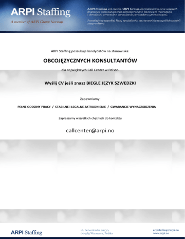 ARPI Staffing poszukuje kandydatów na stanowiska: OBCOJĘZYCZNYCH KONSULTANTÓW dla największych Call Center w Polsce. Wyślij CV jeśli znasz BIEGLE JĘZYK SZWEDZKI Zapewniamy: PEŁNE GODZINY PRACY / STABILNE i LEGALNE ZATRUDNIENIE / GWARANCJE WYNAGRODZENIA Zapraszamy wszystkich chętnych do kontaktu [email protected]