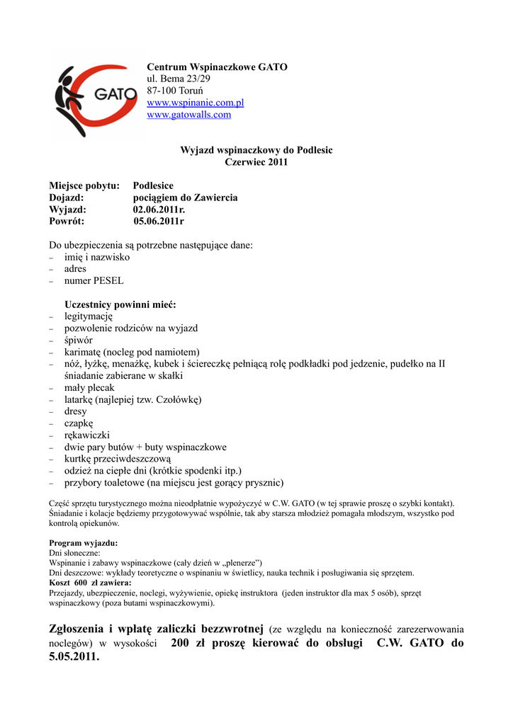 Centrum Wspinaczkowe GATO ul. Bema 23/29 87-100 Toruń www.wspinanie.com.pl www.gatowalls.com Wyjazd wspinaczkowy do Podlesic Czerwiec 2011 Miejsce pobytu: Dojazd: Wyjazd: Powrót: Podlesice pociągiem do Zawiercia 02.06.2011r. 05.06.2011r Do ubezpieczenia są potrzebne następujące dane: − imię i nazwisko − adres − numer PESEL − − − − − − − − − − − − − − Uczestnicy powinni mieć: legitymację pozwolenie rodziców na wyjazd śpiwór karimatę (nocleg pod namiotem) nóż, łyżkę, menażkę, kubek i ściereczkę pełniącą rolę podkładki pod jedzenie, pudełko na II śniadanie zabierane w skałki mały plecak latarkę (najlepiej tzw. Czołówkę) dresy czapkę rękawiczki dwie pary butów + buty wspinaczkowe kurtkę przeciwdeszczową odzież na ciepłe dni (krótkie spodenki itp.) przybory toaletowe (na miejscu jest gorący prysznic) Część sprzętu turystycznego można nieodpłatnie wypożyczyć w C.W. GATO (w tej sprawie proszę o szybki kontakt). Śniadanie i kolacje będziemy przygotowywać wspólnie, tak aby starsza młodzież pomagała młodszym, wszystko pod kontrolą opiekunów. Program wyjazdu: Dni słoneczne: Wspinanie i zabawy wspinaczkowe (cały dzień w „plenerze”) Dni deszczowe: wykłady teoretyczne o wspinaniu w świetlicy, nauka technik i posługiwania się sprzętem. Koszt 600 zł zawiera: Przejazdy, ubezpieczenie, noclegi, wyżywienie, opiekę instruktora (jeden instruktor dla max 5 osób), sprzęt wspinaczkowy (poza butami wspinaczkowymi). Zgłoszenia i wpłatę zaliczki bezzwrotnej (ze względu na konieczność zarezerwowania noclegów) w wysokości 200 zł proszę kierować do obsługi C.W. GATO do 5.05.2011.