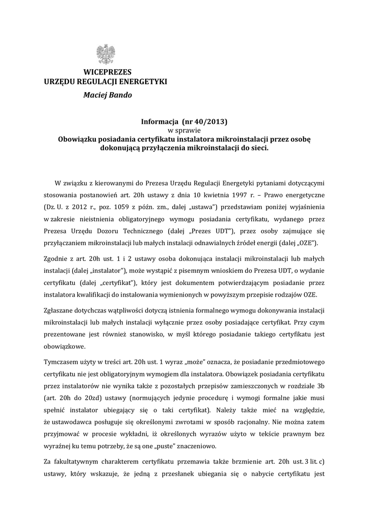 WICEPREZES URZĘDU REGULACJI ENERGETYKI Maciej Bando Informacja (nr 40/2013) w sprawie Obowiązku posiadania certyfikatu instalatora mikroinstalacji przez osobę dokonującą przyłączenia mikroinstalacji do sieci. W związku z kierowanymi do Prezesa Urzędu Regulacji Energetyki pytaniami dotyczącymi stosowania postanowień art. 20h ustawy z dnia 10 kwietnia 1997 r. – Prawo energetyczne (Dz. U. z 2012 r., poz. 1059 z późn. zm., dalej „ustawa”) przedstawiam poniżej wyjaśnienia w zakresie nieistnienia obligatoryjnego wymogu posiadania certyfikatu, wydanego przez Prezesa Urzędu Dozoru Technicznego (dalej „Prezes UDT"), przez osoby zajmujące się przyłączaniem mikroinstalacji lub małych instalacji odnawialnych źródeł energii (dalej „OZE”). Zgodnie z art. 20h ust. 1 i 2 ustawy osoba dokonująca instalacji mikroinstalacji lub małych instalacji (dalej „instalator"), może wystąpić z pisemnym wnioskiem do Prezesa UDT, o wydanie certyfikatu (dalej „certyfikat”), który jest dokumentem potwierdzającym posiadanie przez instalatora kwalifikacji do instalowania wymienionych w powyższym przepisie rodzajów OZE. Zgłaszane dotychczas wątpliwości dotyczą istnienia formalnego wymogu dokonywania instalacji mikroinstalacji lub małych instalacji wyłącznie przez osoby posiadające certyfikat. Przy czym prezentowane jest również stanowisko, w myśl którego posiadanie takiego certyfikatu jest obowiązkowe. Tymczasem użyty w treści art. 20h ust. 1 wyraz „może” oznacza, że posiadanie przedmiotowego certyfikatu nie jest obligatoryjnym wymogiem dla instalatora. Obowiązek posiadania certyfikatu przez instalatorów nie wynika także z pozostałych przepisów zamieszczonych w rozdziale 3b (art. 20h do 20zd) ustawy (normujących jedynie procedurę i wymogi formalne jakie musi spełnić instalator ubiegający się o taki certyfikat). Należy także mieć na względzie, że ustawodawca posługuje się określonymi zwrotami w sposób racjonalny. Nie można zatem przyjmować w procesie wykładni, iż określonych wyrazów użyto w tekście prawnym bez wyraźnej ku temu potrzeby, że są one „puste" znaczeniowo. Za fakultatywnym charakterem certyfikatu przemawia także brzmienie art. 20h ust. 3 lit. c) ustawy, który wskazuje, że jedną z przesłanek ubiegania się o nabycie certyfikatu jest udokumentowane trzyletnie doświadczenie zawodowe w zakresie instalowania lub modernizacji urządzeń i instalacji: sanitarnych, energetycznych, grzewczych, chłodniczych lub elektrycznych. Treść tego przepisu, a także brak jakiegokolwiek przepisu przejściowego w tym zakresie potwierdza, że doświadczenie takie może być uzyskane także po wejściu w życie postanowień rozdziału 3b, a więc po 11 września 2013 r. Powyższe oznacza, że ustawodawca wprost dopuścił możliwość instalowania instalacji energetycznych i elektrycznych przez osoby nie posiadające certyfikatu, a posiadanie niniejszego certyfikatu jest dodatkowym uprawnieniem i może podnieść wiarygodność osoby dokonującej instalacji mikroinstalacji oraz małych instalacji. Podkreślić również należy, że art. 14 ust. 3 dyrektywy 2009/28/WE Parlamentu Europejskiego i Rady z dnia 23 kwietnia 2009 r. w sprawie promowania stosowania energii ze źródeł odnawialnych (Dz. Urz. UE L 140/16) stanowi, że instalatorzy małych kotłów i pieców na biomasę, systemów fotowoltaicznych i systemów ciepła słonecznego, płytkich systemów geotermalnych oraz pomp ciepła będą mieli zapewniony dostęp do systemów certyfikacji lub równoważnych systemów kwalifikowania. Mając na uwadze okoliczność, iż uregulowania ustawy w tym zakresie stanowią implementację tej dyrektywy, również z tej przyczyny brak jest podstaw do interpretowania przepisu art. 20h ustawy, w sposób odmienny niż stanowi założenie art. 14 ust. 3 ww. dyrektywy. Nie bez znaczenia jest także fakt, że zgodnie z art. 7 ust. 8d 9 ustawy przyłączane mikroinstalacje muszą spełniać wymagania techniczne i eksploatacyjne określone w art. 7a ust. 1 ustawy. Szczegółowe warunki przyłączenia, wymagania techniczne oraz warunki współpracy mikroinstalacji z systemem elektroenergetycznym określają przepisy wydane na podstawie art. 9 ust. 3 ustawy, a więc rozporządzenie Ministra Gospodarki z dnia 4 maja 2007 r. w sprawie szczegółowych warunków funkcjonowania systemu elektroenergetycznego (Dz. U z 2007r. Nr 93, poz. 623 z późn. zm.). Wskazane przepisy określają jedynie parametry urządzeń oraz wymogi techniczno‐ eksploatacyjne jakie muszą spełniać mikroinstalacje i małe instalacje. Zatem żaden z przepisów nie uzależnia przyłączenia instalacji do sieci od obecności instalatora posiadającego certyfikat. Tym samym przedsiębiorstwa energetyczne, które uzależniają przyłączenie mikroinstalacji od faktu posiadania certyfikatu w sytuacji gdy system certyfikacji jest systemem dobrowolnym, działają bez podstawy prawnej, dopuszczają się naruszenia przepisu art. 56 ust. 1 pkt 4 ustawy, odmawiając z nieuzasadnionych powodów zawarcia umowy, o której mowa w art. 7 ust. 1. Warszawa, dnia 11 grudnia 2013 r.