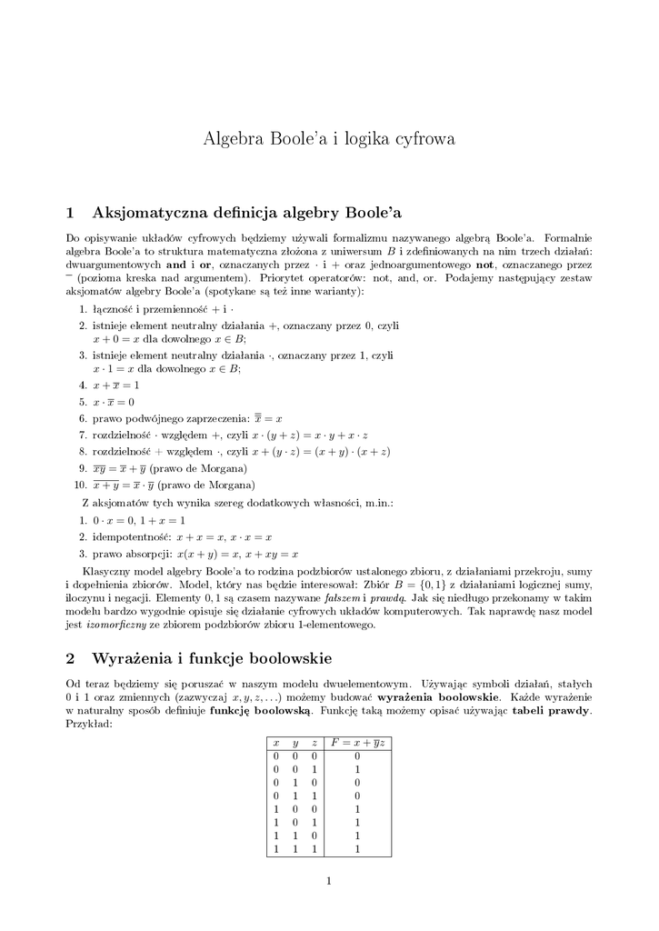 Do opisywanie ukªadów cyfrowych b¦dziemy u»ywali formalizmu nazywanego algebr¡ Boole'a.