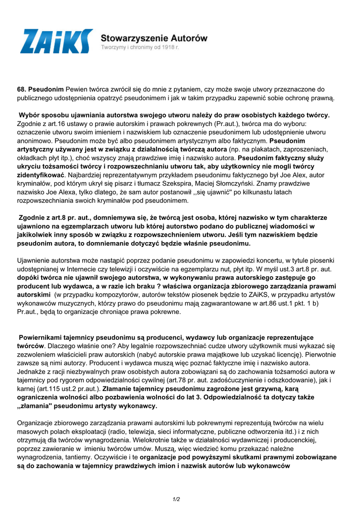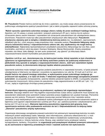 68. Pseudonim Pewien twórca zwrócił się do mnie z pytaniem, czy może swoje utwory przeznaczone do publicznego udostępnienia opatrzyć pseudonimem i jak w takim przypadku zapewnić sobie ochronę prawną. Wybór sposobu ujawniania autorstwa swojego utworu należy do praw osobistych każdego twórcy. Zgodnie z art.16 ustawy o prawie autorskim i prawach pokrewnych (Pr.aut.), twórca ma do wyboru: oznaczenie utworu swoim imieniem i nazwiskiem lub oznaczenie pseudonimem lub udostępnienie utworu anonimowo. Pseudonim może być albo pseudonimem artystycznym albo faktycznym. Pseudonim artystyczny używany jest w związku z działalnością twórczą autora (np. na plakatach, zaproszeniach, okładkach płyt itp.), choć wszyscy znają prawdziwe imię i nazwisko autora. Pseudonim faktyczny służy ukryciu tożsamości twórcy i rozpowszechnianiu utworu tak, aby użytkownicy nie mogli twórcy zidentyfikować. Najbardziej reprezentatywnym przykładem pseudonimu faktycznego był Joe Alex, autor kryminałów, pod którym ukrył się pisarz i tłumacz Szekspira, Maciej Słomczyński. Znamy prawdziwe nazwisko Joe Alexa, tylko dlatego, że sam autor postanowił ,,się ujawnić'' po kilkunastu latach rozpowszechniania swoich kryminałów pod pseudonimem. Zgodnie z art.8 pr. aut., domniemywa się, że twórcą jest osoba, której nazwisko w tym charakterze ujawniono na egzemplarzach utworu lub której autorstwo podano do publicznej wiadomości w jakikolwiek inny sposób w związku z rozpowszechnieniem utworu. Jeśli tym nazwiskiem będzie pseudonim autora, to domniemanie dotyczyć będzie właśnie pseudonimu. Ujawnienie autorstwa może nastąpić poprzez podanie pseudonimu w zapowiedzi koncertu, w tytule piosenki udostępnianej w Internecie czy telewizji i oczywiście na egzemplarzu nut, płyt itp. W myśl ust.3 art.8 pr. aut. dopóki twórca nie ujawnił swojego autorstwa, w wykonywaniu prawa autorskiego zastępuje go producent lub wydawca, a w razie ich braku ? właściwa organizacja zbiorowego zarządzania prawami autorskimi (w przypadku kompozytorów, autorów tekstów piosenek będzie to ZAiKS, w przypadku artystów wykonawców muzycznych, którzy prawo do pseudonimu mają zagwarantowane w art.86 ust.1 pkt. 1 b) Pr.aut., będą to organizacje chroniące prawa pokrewne. Powiernikami tajemnicy pseudonimu są producenci, wydawcy lub organizacje reprezentujące twórców. Dlaczego właśnie one? Aby legalnie rozpowszechniać cudze utwory użytkownik musi wykazać się zezwoleniem właścicieli praw autorskich (nabyć autorskie prawa majątkowe lub uzyskać licencję). Pierwotnie zawsze są nimi autorzy. Producent i wydawca muszą więc poznać faktyczne imię i nazwisko autora. Jednakże z racji niezbywalnych praw osobistych autora zobowiązani są do zachowania tożsamości autora w tajemnicy pod rygorem odpowiedzialności cywilnej (art.78 pr. aut. zadośćuczynienie i odszkodowanie), jak i karnej (art.115 ust.2 pr.aut.). Złamanie tajemnicy pseudonimu zagrożone jest grzywną, karą ograniczenia wolności albo pozbawienia wolności do lat 3. Odpowiedzialność ta dotyczy także ,,złamania'' pseudonimu artysty wykonawcy. Organizacje zbiorowego zarządzania prawami autorskimi lub pokrewnymi reprezentują twórców na wielu masowych polach eksploatacji (radio, telewizja, sieci informatyczne, publiczne odtworzenia itd.) i z nich otrzymują dla twórców wynagrodzenia. Wielokrotnie także w działalności wydawniczej i producenckiej, poprzez zawieranie w imieniu twórców umów. Muszą, więc wiedzieć komu przekazać należne wynagrodzenia, tantiemy. Oczywiście i te organizacje pod powyższymi skutkami prawnymi zobowiązane są do zachowania w tajemnicy prawdziwych imion i nazwisk autorów lub wykonawców 1/2 występujących pod pseudonimami. W przypadku pseudonimu mógłby powstać problem przy ustalaniu, czy przypadkowo nie wygasły autorskie prawa majątkowe do utworu, a więc, czy można go eksploatować bez zgody autora i zapłaty mu wynagrodzenia. Bo jak ustalić, kiedy zmarł autor (faktyczny), który ukrył się pod pseudonimem i nikomu nie wolno, także po jego śmierci ujawnić prawdziwej tożsamości. ,,Zdekonspirowanie'' pseudonimu po śmierci autora bez jego zgody jest także przestępstwem i naruszeniem praw osobistych, jeśli sam nie wyraził takiej woli. W normalnej sytuacji, gdy autor utworu jest znany, autorskie prawa majątkowe wygasają 70 lat po śmierci autora. W przypadku pseudonimu, ale także anonimu, daty śmierci autora nie da się ustalić. Zgodnie z art.36 pkt. 2 pr. aut. w odniesieniu do utworu, którego twórca nie jest znany (publiczności, użytkownikom), autorskie prawa majątkowe gasną z upływem lat 70 od daty pierwszego rozpowszechnienia utworu, a więc pierwszego legalnego (za zgodą twórcy lub jego następców prawnych) publicznego udostępnienia, bez względu na sposób i formę tego udostępnienia (publikacja, Internet, TV). W pewnych sytuacjach więc, ochrona praw majątkowych autora, który posługuje się pseudonimem może być krótsza (jeśli utwór opublikowano za życia), w niektórych dłuższa (gdy rozpowszechnienie nastąpi długo po śmierci autora ukrytego pod pseudonimem). Oczywiście, jeśli w tym czasie autor ujawni swoją tożsamość, przywrócone zostają zwykłe zasady obliczania wygaśnięcia praw majątkowych ? 70 lat od śmierci twórcy. Podobnie, gdy pseudonim nie pozostawia wątpliwości co do tożsamości autora. Powyższe zasady ochrony pseudonimu, nie pozwalają użytkownikowi utworu zastąpić pseudonimu prawdziwym nazwiskiem autora, choć wie lub nawet gdy jest powszechnie wiadome, kto ukrywa się pod pseudonimem. Byłoby to też naruszenie praw osobistych autora (także wykonawcy), pozwalające mu na wytoczenie procesu cywilnego i złożenie wniosku o ściganie karne. Trzeba też zauważyć, że pseudonimem posługujemy się nie tylko w działalności twórczej. Pseudonim został wymieniony w art.23 kodeksu cywilnego w kręgu