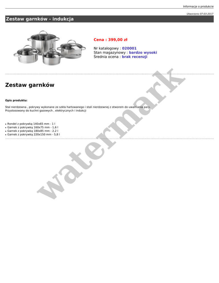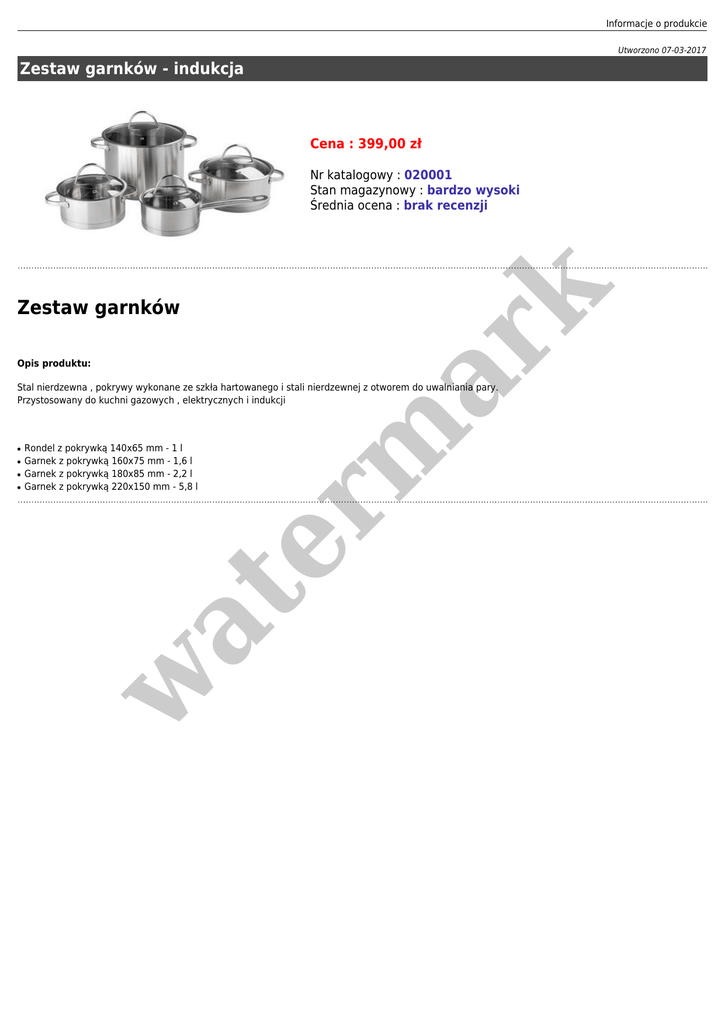 Informacje o produkcie Utworzono 07-03-2017 Zestaw garnków - indukcja Cena : 399,00 zł Zestaw garnków Opis produktu: er m ar k Nr katalogowy : 020001 Stan magazynowy : bardzo wysoki Średnia ocena : brak recenzji Stal nierdzewna , pokrywy wykonane ze szkła hartowanego i stali nierdzewnej z otworem do uwalniania pary. Przystosowany do kuchni gazowych , elektrycznych i indukcji ● ● Rondel z pokrywką 140x65 mm - 1 l Garnek z pokrywką 160x75 mm - 1,6 l Garnek z pokrywką 180x85 mm - 2,2 l Garnek z pokrywką 220x150 mm - 5,8 l at ● w ●