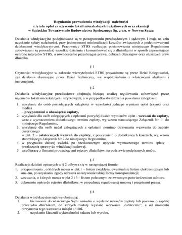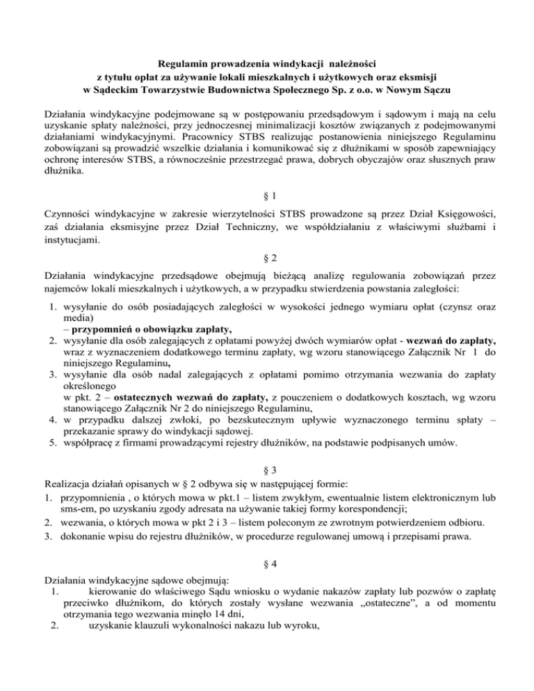 Regulamin prowadzenia windykacji należności z tytułu opłat za używanie lokali mieszkalnych i użytkowych oraz eksmisji w Sądeckim Towarzystwie Budownictwa Społecznego Sp. z o.o. w Nowym Sączu Działania windykacyjne podejmowane są w postępowaniu przedsądowym i sądowym i mają na celu uzyskanie spłaty należności, przy jednoczesnej minimalizacji kosztów związanych z podejmowanymi działaniami windykacyjnymi. Pracownicy STBS realizując postanowienia niniejszego Regulaminu zobowiązani są prowadzić wszelkie działania i komunikować się z dłużnikami w sposób zapewniający ochronę interesów STBS, a równocześnie przestrzegać prawa, dobrych obyczajów oraz słusznych praw dłużnika. §1 Czynności windykacyjne w zakresie wierzytelności STBS prowadzone są przez Dział Księgowości, zaś działania eksmisyjne przez Dział Techniczny, we współdziałaniu z właściwymi służbami i instytucjami. §2 Działania windykacyjne przedsądowe obejmują bieżącą analizę regulowania zobowiązań przez najemców lokali mieszkalnych i użytkowych, a w przypadku stwierdzenia powstania zaległości: 1. wysyłanie do osób posiadających zaległości w wysokości jednego wymiaru opłat (czynsz oraz media) – przypomnień o obowiązku zapłaty, 2. wysyłanie dla osób zalegających z opłatami powyżej dwóch wymiarów opłat - wezwań do zapłaty, wraz z wyznaczeniem dodatkowego terminu zapłaty, wg wzoru stanowiącego Załącznik Nr 1 do niniejszego Regulaminu, 3. wysyłanie dla osób nadal zalegających z opłatami pomimo otrzymania wezwania do zapłaty określonego w pkt. 2 – ostatecznych wezwań do zapłaty, z pouczeniem o dodatkowych kosztach, wg wzoru stanowiącego Załącznik Nr 2 do niniejszego Regulaminu, 4. w przypadku dalszej zwłoki, po bezskutecznym upływie wyznaczonego terminu spłaty – przekazanie sprawy do windykacji sądowej. 5. współpracę z firmami prowadzącymi rejestry dłużników, na podstawie podpisanych umów. §3 Realizacja działań opisanych w § 2 odbywa się w następującej formie: 1. przypomnienia , o których mowa w pkt.1 – listem zwykłym, ewentualnie listem elektronicznym lub sms-em, po uzyskaniu zgody adresata na używanie takiej formy korespondencji; 2. wezwania, o których mowa w pkt 2 i 3 – listem poleconym ze zwrotnym potwierdzeniem odbioru. 3. dokonanie wpisu do rejestru dłużników, w procedurze regulowanej umową i przepisami prawa. §4 Działania windykacyjne sądowe obejmują: 1. kierowanie do właściwego Sądu wniosku o wydanie nakazów zapłaty lub pozwów o zapłatę przeciwko dłużnikom, do których zostały wysłane wezwania „ostateczne”, a od momentu otrzymania tego wezwania minęło 14 dni, 2. uzyskanie klauzuli wykonalności nakazu lub wyroku, 3. kierowanie zasądzonych należności na drogę postępowania egzekucyjnego. §5 1. Z tytułu zwłoki w terminowym regulowaniu należności związanych z najmem lokalu pobierane są odsetki ustawowe. 2. W uzasadnionych przypadkach, na wniosek dłużnika, Zarząd Spółki może odstąpić od naliczenia i poboru odsetek. §6 Na pisemny wniosek dłużnika, przed skierowaniem sprawy do windykacji sądowej, w sytuacjach uzasadnionych (np. stanem zdrowia, sytuacją rodzinną, innymi zdarzeniami losowymi), Zarząd Spółki może podjąć decyzję o zawarciu ugody w zakresie spłaty zadłużenia, wg Załącznika Nr 3 do niniejszego Regulaminu. Ugoda może regulować spłatę zadłużenia w ratach, lub w świadczeniach niepieniężnych (np. prace porządkowe, remontowe, administracyjne). §7 Zapłata przez dłużnika całego zadłużenia wobec STBS, powoduje zaniechanie działań windykacyjnych wobec dłużnika, o czym Spółka powiadomi zainteresowanego odpowiednim pismem. Regulamin przyjęty uchwałą nr 3/06/2012 Zarządu STBS sp. z o.o. z dnia 5 czerwca 2012 r.