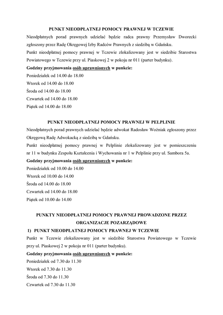 PUNKT NIEODPŁATNEJ POMOCY PRAWNEJ W TCZEWIE Nieodpłatnych porad prawnych udzielać będzie radca prawny Przemysław Dworecki zgłoszony przez Radę Okręgowej Izby Radców Prawnych z siedzibą w Gdańsku. Punkt nieodpłatnej pomocy prawnej w Tczewie zlokalizowany jest w siedzibie Starostwa Powiatowego w Tczewie przy ul. Piaskowej 2 w pokoju nr 011 (parter budynku). Godziny przyjmowania osób uprawnionych w punkcie: Poniedziałek od 14.00 do 18.00 Wtorek od 14.00 do 18.00 Środa od 14.00 do 18.00 Czwartek od 14.00 do 18.00 Piątek od 14.00 do 18.00 PUNKT NIEODPŁATNEJ POMOCY PRAWNEJ W PELPLINIE Nieodpłatnych porad prawnych udzielać będzie adwokat Radosław Woźniak zgłoszony przez Okręgową Radę Adwokacką z siedzibą w Gdańsku. Punkt nieodpłatnej pomocy prawnej w Pelplinie zlokalizowany jest w pomieszczeniu nr 11 w budynku Zespołu Kształcenia i Wychowania nr 1 w Pelplinie przy ul. Sambora 5a. Godziny przyjmowania osób uprawnionych w punkcie: Poniedziałek od 10.00 do 14.00 Wtorek od 10.00 do 14.00 Środa od 14.00 do 18.00 Czwartek od 14.00 do 18.00 Piątek od 10.00 do 14.00 PUNKTY NIEODPŁATNEJ POMOCY PRAWNEJ PROWADZONE PRZEZ ORGANIZACJE POZARZĄDOWE 1) PUNKT NIEODPŁATNEJ POMOCY PRAWNEJ W TCZEWIE Punkt w Tczewie zlokalizowany jest w siedzibie Starostwa Powiatowego w Tczewie przy ul. Piaskowej 2 w pokoju nr 011 (parter budynku). Godziny przyjmowania osób uprawnionych w punkcie: Poniedziałek od 7.30 do 11.30 Wtorek od 7.30 do 11.30 Środa od 7.30 do 11.30 Czwartek od 7.30 do 11.30 Piątek od 7.30 do 11.30 Punkt prowadzony jest przez organizację pozarządową, tj. Pomorskie Centrum Terapeutyczno - Prawne z siedzibą w Sierakowicach przy ul. Kościerskiej 16, KRS 0000482895. Nieodpłatnej pomocy prawnej będą udzielać radcowie prawni lub adwokaci. 2) PUNKT NIEODPŁATNEJ POMOCY PRAWNEJ W GNIEWIE Punkt w Gniewie zlokalizowany jest w budynku Urzędu Miasta i Gminy w Gniewie, Plac Grunwaldzki 1 (parter budynku, wejście po prawej stronie od głównego wejścia do budynku) Godziny przyjmowania osób uprawnionych w punkcie: Poniedziałek od 8.00 do 12.00 Wtorek od 8.00 do 12.00 Środa od 13.00 do 17.00 Czwartek od 8.00 do 12.00 Piątek od 8.00 do 12.00 Punkt prowadzony jest przez organizację pozarządową, tj. Pomorskie Centrum Terapeutyczno - Prawne z siedzibą w Sierakowicach przy ul. Kościerskiej 16, KRS 0000482895. Nieodpłatnej pomocy prawnej będą udzielać radcowie prawni lub adwokaci. 3) PUNKT NIEODPŁATNEJ POMOCY PRAWNEJ W SUBKOWACH Punkt w Subkowach zlokalizowany jest w pomieszczeniu biurowym nr 1 na parterze budynku Urzędu Gminy w Subkowach przy ul. Wybickiego 19a Godziny przyjmowania osób uprawnionych w punkcie: Poniedziałek od 9.00 do 13.00 Wtorek od 12.00 do 16.00 Środa od 9.00 do 13.00 Czwartek od 9.00 do 13.00 Piątek od 9.00 do 13.00 Punkt prowadzony jest przez organizację pozarządową, tj. Zaborskie Towarzystwo Naukowe z siedzibą w miejscowości Brusy przy ul. Dworcowej 18, KRS 0000291352. Nieodpłatnej pomocy prawnej będą udzielać radcowie prawni lub adwokaci.