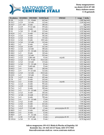 Stany magazynowe na dzień 2014-07-08 Rury stalowe nowe I i II gatunek Średnica fi 28 fi 33,7 fi 33,7 fi 38 fi 38 fi 41 fi 42,4 fi 42,4 fi 42,4 fi 42,4 fi 42,4 fi 48,3 fi 48,3 fi 48,3 fi 48,3 fi 48,3 fi 48,3 fi 60,3 fi 60,3 fi 60,3 fi 60,3 fi 60,3 fi 60,3 fi 60,3 fi 60,3 fi 63,5 fi 70 fi 70 fi 76,1 fi 76,1 fi 76,1 fi 76,1 fi 76,1 fi 76,1 fi 76,1 fi 76,1 fi 76,1 fi 76,1 fi 76,1 fi 76,1 fi 76,1 fi 88,9 fi 88,9 fi 88,9 fi 95 fi 101,6 SCIANKA x 2,9 x 2,9 x 4 - 4,5 x 2,9 x 4,5 x 3,6 x2 x 2,6 x 3,2 x 3,6 x 3,6 x2 x 2,6 x 2,6 x 2,9 x3 x 3,2 x 2,5 x 3,2 x 3,2 x 3,6 x4 x4 x4 x 4,5 x4 x 2,7 x5 x2 x 2,3 x 2,9 x3 x3 x 3,2 ODCINKI 9 - 12mb 12 mb 6 mb 9-12 mb 6 mb 9 - 12 mb 6 mb 6 mb 6 mb 6 mb 12 mb 6 mb 6 mb 12 mb 9 - 12 mb 8 mb 12 mb 2,86 mb 8 - 9 mb 12 mb 9 - 12 mb 5,60 mb 6 mb 9 -12 mb 12 mb 12 mb 6 mb 6 mb 6 mb 6 mb 6 mb 6 mb 9 - 12 mb 6 mb ILOSC 64 13 38 59 21 13 81 36 15 101 14 4 32 38 42 10 59 9 32,5 13 8 9 28 12 33,5 15 45 24 22 95 43 30 3 20 x 3,6 6 mb 47 x4 x4 x 4,2 x 4,5 x 6,3 x 6,3 x4 x5 x5 x 10 x 3,6 6 mb 9 - 12 mb 6 mb 6 mb 6 mb 7,22 mb 6 mb 6 mb 9 - 12 mb 7,37 mb 9 - 12 mb 78 7 6 22 13 1 20 5 5 4 5 Jed. szt. szt. szt. szt. szt. szt. szt. szt. szt. szt. szt. szt. szt. szt. szt. szt. szt. szt. szt. szt. szt. szt. szt. szt. szt. szt. szt. szt. szt. szt. szt. szt. szt. szt. szt. szt. szt. szt. szt. szt. szt. szt. szt. szt. szt. szt. UWAGI ocynk ocynk precyzyjna R-35 precyzyjna R-35 waga Jedn. 1,80 kg/mb 2,20 kg/mb kg/mb 2,51 kg/mb 3,72 kg/mb 3,32 kg/mb 1,99 kg/mb 2,55 kg/mb 3,09 kg/mb 3,45 kg/mb 3,45 kg/mb 2,28 kg/mb 2,93 kg/mb 2,93 kg/mb 3,25 kg/mb 3,35 kg/mb 3,56 kg/mb 3,56 kg/mb 4,51 kg/mb 4,51 kg/mb 5,03 kg/mb 5,55 kg/mb 5,55 kg/mb 5,55 kg/mb 6,19 kg/mb 5,87 kg/mb 4,54 kg/mb 8,01 kg/mb 3,65 kg/mb 4,19 kg/mb 5,24 kg/mb 5,41 kg/mb 5,41 kg/mb 5,75 kg/mb 6,44 kg/mb 7,11 kg/mb 7,11 kg/mb 7,44 kg/mb 7,94 kg/mb 10,83 kg/mb 10,83 kg/mb 8,38 kg/mb 10,35 kg/mb 10,35 kg/mb 20,96 kg/mb 8,70 kg/mb Adres magazynu: 09-411 Biała k.Płocka ul.Sapiehy 10 Kontakt: fax. 24 365-64-67 kom. 603-573-903 [email protected] www.centrum-stali.eu Stany magazynowe na dzień 2014-07-08 Rury stalowe nowe I i II gatunek fi 108 fi 108 fi 114,3 fi 114,3 fi 114,3 fi 114,3 fi 114,3 fi 114,3 fi 115 fi 127 fi 127 fi 128 fi 130 fi 133 fi 133 fi 133 fi 133 fi 133 fi 133 fi 133 fi 139,7 x2 x 10 x2 x 2,6 x3 x 3,6 x 4,5 x 22 x 15,5 x 8,5 x 26 x 9,5 x 30 x 3,2 x 3,6 x4 x 11,5 x 12 x 17 x 22 x 3,6 6 mb 2,88 mb 6 mb 12 mb 9 - 12 mb 9 - 12 mb 6 mb 7,29 mb 6,60 mb 7,10 mb 7,60 mb 7,32 mb 4,03 mb 6 mb 6 mb 6 mb 6,15 mb 3,35 mb 2,15 mb 4,56 mb 12 mb 1 1 67 7 18 10 2 1 1 5 1 1 1 15 27 4 1 1 1 1 9+4mb fi 139,7 x 3,6 12 mb fi 142 fi 145 x 20,5 x8 9 mb 7,13-7,70 mb fi 145 fi 159 fi 159 fi 159 fi 168,3 fi 168,3 x 8,5 x 4,5 x5 x 12,3 x 3,2 x4 7,69 mb 6 mb 6 mb 8,70 mb 5 - 6 mb 12 mb fi 168,3 fi 168,3 fi 168,3 x 4,5 x 6,3 x 6,3 5 - 6 mb 5-6 mb 12 mb fi 168,3 fi 168,3 x 7,1 x 8,8 5-6 mb 5-6 mb szt. szt. szt. szt. szt. szt. szt. szt. szt szt szt. szt. szt. szt. szt. szt. szt. szt. szt. szt. szt. 15 szt. R-35 niklowana R-35 R-35 R-35 precyzyjna R-35 precyzyjna R-35 R-35 rura precyzyjna R-35 R-35 R-35 precyzyjna R-35 atest 3.1 P235 TR1/EN 10217-1 szew wzdłużny atest 3.1 S235 JRH/EN 10219-1 i -2; P235 TR1/EN 10217-1; szew wzdłużny 1 szt. 5 szt. precyzyjna R-35 odc. 7,13 mb 7,68 mb 7,69 mb 7,70 mb 1 szt. precyzyjna R-35 36 szt. 1 odc. 4 mb 3 szt. 1 szt. niklowana R-35 7 szt. 6 szt. atest 3.1 S235 JRH/EN 10219-1 i -2; P235 TR1/EN 10217-1; szew wzdłużny 7 szt. 19 szt. 3 szt. atest 3.1 P235 TR1/EN 10217-1 szew wzdłużny ocynk 10 szt. 2 szt. Adres magazynu: 09-411 Biała k.Płocka ul.Sapiehy 10 Kontakt: fax. 24 365-64-67 kom. 603-573-903 [email protected] www.centrum-stali.eu 5,23 24,17 5,54 7,16 8,21 9,80 12,15 50,08 38,03 24,84 64,76 27,76 73,99 10,24 11,49 12,73 34,46 35,81 48,63 60,22 12,08 kg/mb kg/mb kg/mb kg/mb kg/mb kg/mb kg/mb kg/mb kg/mb kg/mb kg/mb kg/mb kg/mb kg/mb kg/mb kg/mb kg/mb kg/mb kg/mb kg/mb kg/mb 12,08 kg/mb 61,63 kg/mb 27,03 kg/mb 28,61 17,15 18,99 44,50 13,03 16,21 kg/mb kg/mb kg/mb kg/mb kg/mb kg/mb 18,18 kg/mb 25,17 kg/mb 25,17 kg/mb 28,23 kg/mb 34,61 kg/mb Stany magazynowe na dzień 2014-07-08 Rury stalowe nowe I i II gatunek fi 168,3 fi 168,3 fi 170 fi 177,8 fi 177,8 fi 177,8 fi 177,8 fi 177,8 fi 180 fi 183 x 9,5 x 28 x 30 x 7,1 x8 x 8,5 x 9,5 x 22 x 19 x7 5-7 mb 5,75 mb 1,30-1,59 mb 5-6 mb 5-6 mb 7,68 mb 5-6 mb 9,30 mb 3,95 mb 6 mb 3 1 2 1 3 1 5 1 1 1 szt. szt szt szt. szt. szt. szt. szt. szt szt. fi 183 fi 185 fi 186 fi 190 x 9,7 x 8,5 x 8,5 x 15 7,31 mb 9 mb ok. 6 mb 2,35 - 8,22 mb 5 1 1 3 szt. szt. szt. szt. fi 195 fi 202 fi 214 fi 219,1 fi 219,1 fi 219,1 fi 219,1 fi 219,1 fi 219,1 x 22 x 12 x 7,1 x 4,5 x 5,6 x 6,3 x 6,3 x 7,1 x 7,1 2,22 mb 6,13 mb 8,60-9 mb 5-7 mb 5-7 mb 5-6 mb 12 mb 5-6 mb 7,31-9 mb 1 1 2 1 5 108 1 8 3 szt. szt. szt szt. szt. szt. szt. szt. szt. fi 219,1 fi 219,1 fi 219,1 fi 219,1 fi 219,1 fi 219,1 fi 219,1 x 7,1 x8 x8 x8 x 8,8 x 8,8 x 10 12 mb 5-6 mb 5-7 mb 12 mb 5-6 mb 12 mb 5 - 6 mb 1 14 12 1 4 1 9 szt. szt. szt. szt. szt. szt. szt. fi 219,1 fi 219,1 fi 219,1 fi 244,5 fi 244,5 fi 273 fi 273 fi 273 fi 273 fi 273 fi 273 fi 273 x 11 x 12,5 x 27 x10 x 12,5 x 4,5 x5 x 5,6 x 6,3 x 7,1 x8 x8 5-7 mb 5 - 6 mb 1,27 mb 5 - 7 mb 5-7 mb 5-6mb 12 mb 5-6 mb 5-6 mb 4 - 7 mb 5-7 mb 5-7 mb 3 26 1 3 5 2 1 5 24 15 14 58 szt. szt. szt. szt. szt. szt. szt. szt. szt. szt. szt. szt. R-35 R-35 niklowana R-35 R-35 R-35 rura precyzyjna R-35 nagwintowana (długość mierzona bez gwintu) rura precyzyjna R-35 precyzyjna R-35 precyzyjna R-35 R-35 odc. 2,35 mb 2,49 mb 8,22 mb R-35 R-35 R-35 38,30 96,88 103,58 29,89 33,50 35,49 39,43 84,53 75,44 30,38 kg/mb kg/mb kg/mb kg/mb kg/mb kg/mb kg/mb kg/mb kg/mb kg/mb 41,46 37,00 37,21 64,74 kg/mb kg/mb kg/mb kg/mb 93,86 56,23 36,23 23,82 29,49 33,06 33,06 37,12 37,12 kg/mb kg/mb kg/mb kg/mb kg/mb kg/mb kg/mb kg/mb kg/mb 37,12 41,65 41,65 41,65 45,64 45,64 51,57 kg/mb kg/mb kg/mb kg/mb kg/mb kg/mb kg/mb 56,45 63,69 127,91 57,83 71,52 29,80 33,05 36,93 41,44 46,56 52,28 52,28 kg/mb