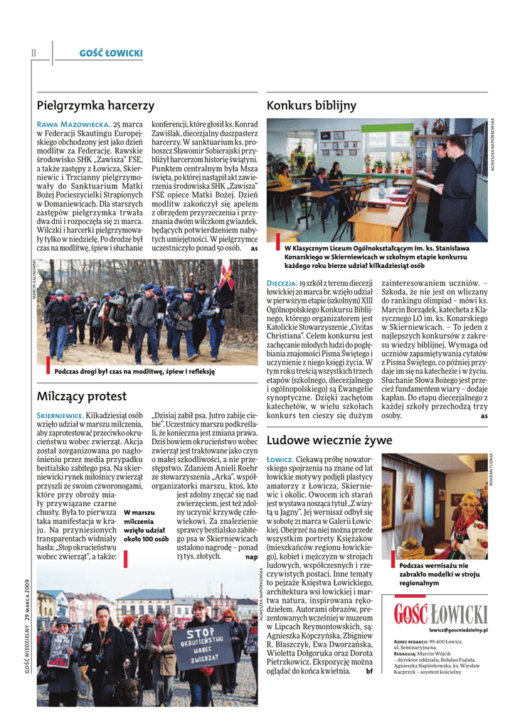 GOŚĆ ŁOWICKI konferencji, które głosił ks. Konrad Zawiślak, diecezjalny duszpasterz harcerzy. W sanktuarium ks. proboszcz Sławomir Sobierajski przybliżył harcerzom historię świątyni. Punktem centralnym była Msza święta, po której nastąpił akt zawierzenia środowiska SHK „Zawisza” FSE opiece Matki Bożej. Dzień modlitw zakończył się apelem z obrzędem przyrzeczenia i przyznania dwóm wilczkom gwiazdek, będących potwierdzeniem nabytych umiejętności. W pielgrzymce uczestniczyło ponad 50 osób. as W Klasycznym Liceum Ogólnokształcącym im. ks. Stanisława Konarskiego w Skierniewicach w szkolnym etapie konkursu każdego roku bierze udział kilkadziesiąt osób MARCIN KALINOWSKI RAWA MAZOWIECKA. 25 marca w Federacji Skautingu Europejskiego obchodzony jest jako dzień modlitw za Federację. Rawskie środowisko SHK „Zawisza” FSE, a także zastępy z Łowicza, Skierniewic i Trzcianny pielgrzymowały do Sanktuarium Matki Bożej Pocieszycielki Strapionych w Domaniewicach. Dla starszych zastępów pielgrzymka trwała dwa dni i rozpoczęła się 21 marca. Wilczki i harcerki pielgrzymowały tylko w niedzielę. Po drodze był czas na modlitwę, śpiew i słuchanie Konkurs biblijny AGNIESZKA NAPIÓRKOWSKA Pielgrzymka harcerzy DIECEZJA. 19 szkół z terenu diecezji łowickiej 20 marca br. wzięło udział w pierwszym etapie (szkolnym) XIII Ogólnopolskiego Konkursu Biblijnego, którego organizatorem jest Katolickie Stowarzyszenie „Civitas Christiana”. Celem konkursu jest zachęcanie młodych ludzi do pogłębiania znajomości Pisma Świętego i uczynienie z niego księgi życia. W tym roku treścią wszystkich trzech etapów (szkolnego, diecezjalnego i ogólnopolskiego) są Ewangelie synoptyczne. Dzięki zachętom katechetów, w wielu szkołach konkurs ten cieszy się dużym Podczas drogi był czas na modlitwę, śpiew i refleksję Milczący protest Ludowe wiecznie żywe AGNIESZKA NAPIÓRKOWSKA GOŚĆ NIEDZIELNY 29 MARCA 2009 SKIERNIEWICE. Kilkadziesiąt osób „Dzisiaj zabił psa. Jutro zabije ciewzięło udział w marszu milczenia, bie”. Uczestnicy marszu podkreślaaby zaprotestować przeciwko okru- li, że konieczna jest zmiana prawa. cieństwu wobec zwierząt. Akcja Dziś bowiem okrucieństwo wobec został zorganizowana po nagło- zwierząt jest traktowane jako czyn śnieniu przez media przypadku o małej szkodliwości, a nie przebestialsko zabitego psa. Na skier- stępstwo. Zdaniem Anieli Roehr niewicki rynek miłośnicy zwierząt ze stowarzyszenia „Arka”, współprzyszli ze swoim czworonogami, organizatorki marszu, ktoś, kto które przy obroży miajest zdolny znęcać się nad ły przywiązane czarne zwierzęciem, jest też zdolchusty. Była to pierwsza W marszu ny uczynić krzywdę człotaka manifestacja w kra- milczenia wiekowi. Za znalezienie ju. Na przyniesionych wzięło udział sprawcy bestialsko zabitetransparentach widniały około 100 osób go psa w Skierniewicach hasła: „Stop okrucieństwu ustalono nagrodę – ponad 13 tys. złotych. nap wobec zwierząt”, a także: zainteresowaniem uczniów. – Szkoda, że nie jest on wliczany do rankingu olimpiad – mówi ks. Marcin Borządek, katecheta z Klasycznego LO im. ks. Konarskiego w Skierniewicach. – To jeden z najlepszych konkursów z zakresu wiedzy biblijnej. Wymaga od uczniów zapamiętywania cytatów z Pisma Świętego, co później przydaje im się na katechezie i w życiu. Słuchanie Słowa Bożego jest przecież fundamentem wiary – dodaje kapłan. Do etapu diecezjalnego z każdej szkoły przechodzą trzy osoby. as ŁOWICZ. Ciekawą próbę nowatorskiego spojrzenia na znane od lat łowickie motywy podjęli plastycy amatorzy z Łowicza, Skierniewic i okolic. Owocem ich starań jest wystawa nosząca tytuł „Z wizytą u Jagny”. Jej wernisaż odbył się w sobotę 21 marca w Galerii Łowickiej. Obejrzeć na niej można przede wszystkim portrety Księżaków (mieszkańców regionu łowickiego), kobiet i mężczyzn w strojach ludowych, współczesnych i rzeczywistych postaci. Inne tematy to pejzaże Księstwa Łowickiego, architektura wsi łowickiej i martwa natura, inspirowana rękodziełem. Autorami obrazów, prezentowanych wcześniej w muzeum w Lipcach Reymontowskich, są: Agnieszka Kopczyńska, Zbigniew R. Błaszczyk, Ewa Dworzańska, Wioletta Dołgoruka oraz Dorota Pietrzkowicz. Ekspozycję można oglądać do końca kwietnia. bf BOHDAN FUDAŁA II Podczas wernisażu nie zabrakło modelki w stroju regionalnym [email protected] ADRES REDAKCJI: 99-400 Łowicz, ul. Seminaryjna 6a, REDAGUJĄ: Marcin Wójcik – dyrektor oddziału, Bohdan Fudała, Agnieszka Napiórkowska, ks. Wiesław Kacprzyk – asystent kościelny