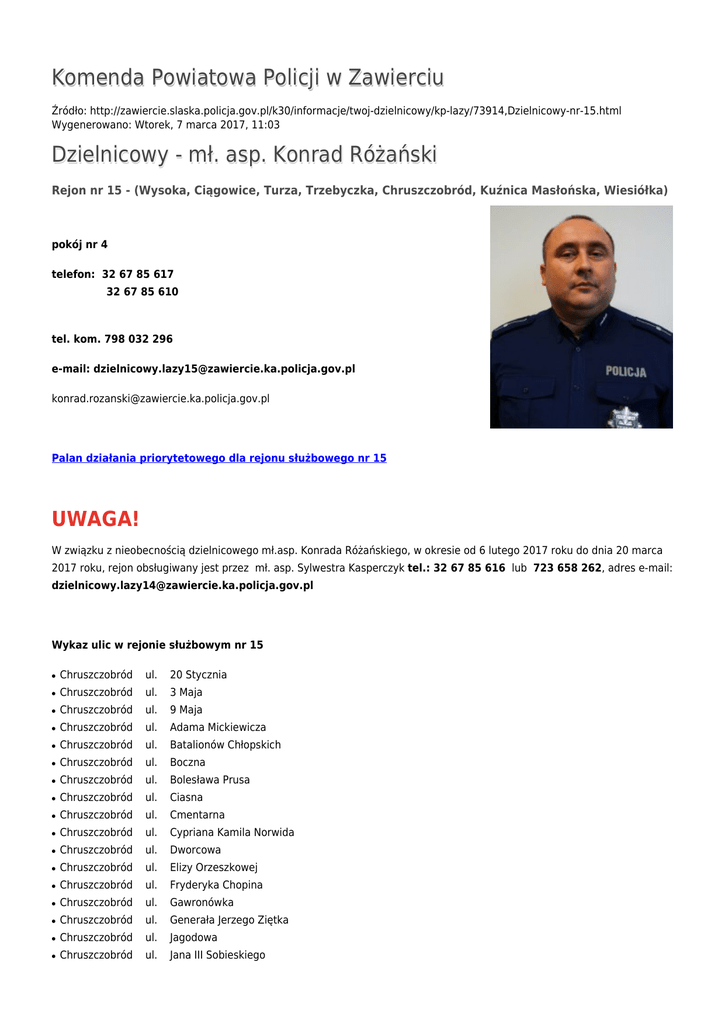 Komenda Powiatowa Policji w Zawierciu Źródło: http://zawiercie.slaska.policja.gov.pl/k30/informacje/twoj-dzielnicowy/kp-lazy/73914,Dzielnicowy-nr-15.html Wygenerowano: Wtorek, 7 marca 2017, 11:03 Dzielnicowy - mł. asp. Konrad Różański Rejon nr 15 - (Wysoka, Ciągowice, Turza, Trzebyczka, Chruszczobród, Kuźnica Masłońska, Wiesiółka) pokój nr 4 telefon: 32 67 85 617 32 67 85 610 tel. kom. 798 032 296 e-mail: [email protected] [email protected] Palan działania priorytetowego dla rejonu służbowego nr 15 UWAGA! W związku z nieobecnością dzielnicowego mł.asp. Konrada Różańskiego, w okresie od 6 lutego 2017 roku do dnia 20 marca 2017 roku, rejon obsługiwany jest przez mł. asp. Sylwestra Kasperczyk tel.: 32 67 85 616 lub 723 658 262, adres e-mail: [email protected] Wykaz ulic w rejonie służbowym nr 15 ● Chruszczobród ul. 20 Stycznia ● Chruszczobród ul. 3 Maja ● Chruszczobród ul. 9 Maja ● Chruszczobród ul. Adama Mickiewicza ● Chruszczobród ul. Batalionów Chłopskich ● Chruszczobród ul. Boczna ● Chruszczobród ul. Bolesława Prusa ● Chruszczobród ul. Ciasna ● Chruszczobród ul. Cmentarna ● Chruszczobród ul. Cypriana Kamila Norwida ● Chruszczobród ul. Dworcowa ● Chruszczobród ul. Elizy Orzeszkowej ● Chruszczobród ul. Fryderyka Chopina ● Chruszczobród ul. Gawronówka ● Chruszczobród ul. Generała Jerzego Ziętka ● Chruszczobród ul. Jagodowa ● Chruszczobród ul. Jana III Sobieskiego ● Chruszczobród ul. Jana Kochanowskiego ● Chruszczobród ul. Jana Matejki ● Chruszczobród ul. Józefa Bema ● Chruszczobród ul. Juliana Tuwima ● Chruszczobród ul. Juliusza Słowackiego ● Chruszczobród ul. Kamienna ● Chruszczobród ul. Krakowska ● Chruszczobród ul. Królewska ● Chruszczobród ul. Krótka ● Chruszczobród ul. Krzywa ● Chruszczobród ul. Kwiatowa ● Chruszczobród ul. Leśna ● Chruszczobród ul. Łazowska ● Chruszczobród ul. Łysa Góra ● Chruszczobród ul. Marii Konopnickiej ● Chruszczobród ul. Mikołaja Reja ● Chruszczobród ul. Myśliwska ● Chruszczobród ul. Nowa ● Chruszczobród ul. Ogrodowa ● Chruszczobród ul. Piaski ● Chruszczobród ul. Piastów ● Chruszczobród ul. Piotra Ściegiennego ● Chruszczobród ul. Podgórna ● Chruszczobród ul. Polna ● Chruszczobród ul. Powiatowa ● Chruszczobród ul. Regionalna ● Chruszczobród ul. Rolna ● Chruszczobród ul. Rzeczna ● Chruszczobród ul. Słoneczna ● Chruszczobród ul. Sportowa ● Chruszczobród ul. Stanisława Staszica ● Chruszczobród ul. Stawowa ● Chruszczobród ul. Szpakowa ● Chruszczobród ul. Tadeusza Kościuszki ● Chruszczobród ul. Topolowa ● Chruszczobród ul. Wesoła ● Chruszczobród ul. Wiejska ● Chruszczobród ul. Wincentego Witosa ● Chruszczobród ul. Wiśniowa ● Chruszczobród ul. Władysława Broniewskiego ● Chruszczobród ul. Zielona ● Ciągowice ul. 1 Maja ● Ciągowice ul. Cmentarna ● Ciągowice ul. Górna ● Ciągowice ul. Henryka Sienkiewicza ● Ciągowice ul. Juliana Tuwima ● Ciągowice ul. Kopalniana ● Ciągowice ul. Krótka ● Ciągowice ul. Leśna ● Ciągowice ul. Lipowa ● Ciągowice ul. Nadziei ● Ciągowice ul. Ogrodowa ● Ciągowice ul. Tadeusza Kościuszki ● Ciągowice ul. Wojska Polskiego ● Ciągowice ul. Wolności ● Ciągowice ul. Zacisze ● Ciągowice ul. Zielona ● Ciągowice ul. Zwycięstwa ● Kuźnica Masłońska ul. Brzozowa ● Kuźnica Masłońska ul. Leśna ● Kuźnica Masłońska ul. Piaskowa ● Kuźnica Masłońska ul. Słoneczna ● Kuźnica Masłońska ul. Topolowa ● Kuźnica Masłońska ul. Zawierciańska ● Kuźnica Masłońska ul. Zwycięstwa ● Trzebyczka ● Turza ul. 1 Maja ● Turza ul. Gajówka ● Turza ul. Jana III Sobieskiego ● Turza ul. Kądzielów ● Turza ul. Ogrodowa ● Turza ul. Strażacka ● Turza ul. Zwycięstwa ● Wiesiółka ul. Gajowa ● Wiesiółka ul. Henryka Pobożnego ● Wiesiółka ul. Starorynkowa ● Wiesiółka ● Wysoka ul. Adama Mickiewicza ● Wysoka ul. Boczna ● Wysoka ul. Dolna ● Wysoka ul. Fabryczna ● Wysoka ul. Henryka Pobożnego ● Wysoka ul. Ignacego Paderewskiego ● Wysoka ul. Krótka ● Wysoka ul. Leśna ● Wysoka ul. Marii Konopnickiej ● Wysoka ul. Nowa ● Wysoka ul. Ogrodowa ● Wysoka ul. Parkowa ● Wysoka ul. Podmiejska ● Wysoka ul. Polna ● Wysoka ul. Powiatowa ● Wysoka ul. Robotnicza ● Wysoka ul. Słoneczna ● Wysoka ul. Sportowa ● Wysoka ul. Stefana Żeromskiego ● Wysoka ul. Studzienna ● Wysoka ul. Szeroka ● Wysoka ul. Tadeusza Kościuszki ● Wysoka ul. Wały ● Wysoka ul. Wesoła ul. ul. Studzienna ZAŁĄCZNIKI DO STRONY 63.79 KB Ocena: 5/5 (6) Tweetnij