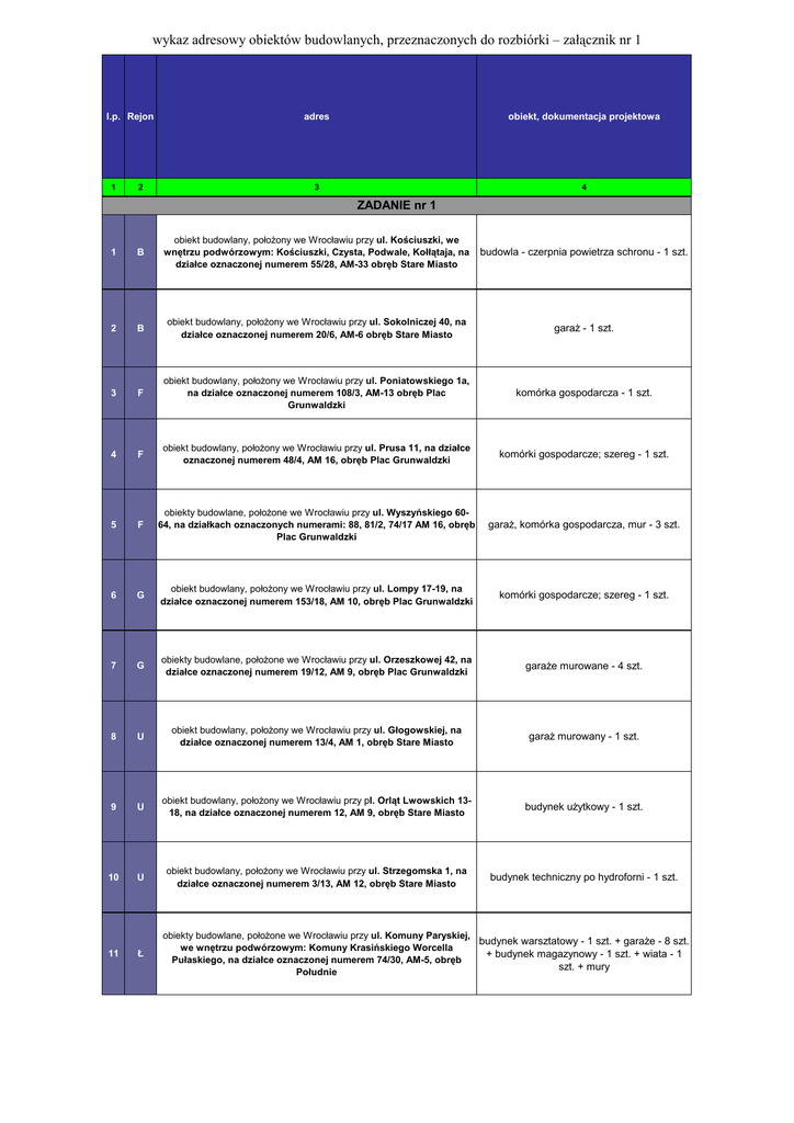 wykaz adresowy obiektów budowlanych, przeznaczonych do rozbiórki – załącznik nr 1 l.p. Rejon 1 2 adres obiekt, dokumentacja projektowa 3 4 ZADANIE nr 1 1 B obiekt budowlany, położony we Wrocławiu przy ul. Kościuszki, we wnętrzu podwórzowym: Kościuszki, Czysta, Podwale, Kołłątaja, na działce oznaczonej numerem 55/28, AM-33 obręb Stare Miasto budowla - czerpnia powietrza schronu - 1 szt. 2 B obiekt budowlany, położony we Wrocławiu przy ul. Sokolniczej 40, na działce oznaczonej numerem 20/6, AM-6 obręb Stare Miasto garaż - 1 szt. 3 F obiekt budowlany, położony we Wrocławiu przy ul. Poniatowskiego 1a, na działce oznaczonej numerem 108/3, AM-13 obręb Plac Grunwaldzki komórka gospodarcza - 1 szt. 4 F obiekt budowlany, położony we Wrocławiu przy ul. Prusa 11, na działce oznaczonej numerem 48/4, AM 16, obręb Plac Grunwaldzki komórki gospodarcze; szereg - 1 szt. 5 F obiekty budowlane, położone we Wrocławiu przy ul. Wyszyńskiego 6064, na działkach oznaczonych numerami: 88, 81/2, 74/17 AM 16, obręb Plac Grunwaldzki garaż, komórka gospodarcza, mur - 3 szt. 6 G obiekt budowlany, położony we Wrocławiu przy ul. Lompy 17-19, na działce oznaczonej numerem 153/18, AM 10, obręb Plac Grunwaldzki komórki gospodarcze; szereg - 1 szt. 7 G obiekty budowlane, położone we Wrocławiu przy ul. Orzeszkowej 42, na działce oznaczonej numerem 19/12, AM 9, obręb Plac Grunwaldzki garaże murowane - 4 szt. 8 U obiekt budowlany, położony we Wrocławiu przy ul. Głogowskiej, na działce oznaczonej numerem 13/4, AM 1, obręb Stare Miasto garaż murowany - 1 szt. 9 U obiekt budowlany, położony we Wrocławiu przy pl. Orląt Lwowskich 1318, na działce oznaczonej numerem 12, AM 9, obręb Stare Miasto budynek użytkowy - 1 szt. 10 U obiekt budowlany, położony we Wrocławiu przy ul. Strzegomska 1, na działce oznaczonej numerem 3/13, AM 12, obręb Stare Miasto budynek techniczny po hydroforni - 1 szt. 11 Ł obiekty budowlane, położone we Wrocławiu przy ul. Komuny Paryskiej, budynek warsztatowy - 1 szt. + garaże - 8 szt. we wnętrzu podwórzowym: Komuny Krasińskiego Worcella + budynek magazynowy - 1 szt. + wiata - 1 Pułaskiego, na działce oznaczonej numerem 74/30, AM-5, obręb szt. + mury Południe