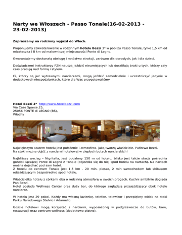 Narty we Włoszech - Passo Tonale(16-02-2013 23-02-2013) Zapraszamy na rodzinny wyjazd do Włoch. Proponujemy zakwaterowanie w rodzinnym hotelu Bezzi 3* w pobliżu Passo Tonale, tylko 1,5 km od miasteczka i 8 km od malowniczej miejscowości Ponte di Legno. Gwarantujemy doskonałą obsługę i mnóstwo atrakcji, zarówno dla dorosłych, jak i dla dzieci. Doświadczeni instruktorzy PZN nauczą jeździć nieumiejących lub doszlifują braki u tych, którzy cały czas pracują nad formą i stylem. Ci, którzy są już wytrawnymi narciarzami, mogą jeździć samodzielnie i uczestniczyć jedynie w dodatkowych niespodziankach, które dla Was przygotowaliśmy Hotel Bezzi 3* http://www.hotelbezzi.com Via Case Sparse,25, 25056 PONTE di LEGNO (BS), Włochy Największym atutem hotelu jest położenie i atmosfera, jaką tworzą właściciele, Państwo Bezzi. Na stoki można dojść z narciarni hotelowej w ciepłych butach narciarskich! Najbliższy wyciąg – Nigritella, jest oddalony 150 m od hotelu, blisko jest także stacja pośrednia gondoli łączącej Ponte di Legno z Tonale (dojeżdża się do niej spod hotelu na nartach). Na nartach można dojechać pod sam hotel. Z hotelu do centrum Tonale jest 1,5 km - 20 min. pieszo, 2 min samochodem lub skibusem odjeżdżającym bezpośrednio spod hotelu. Właścicielka hotelu z córkami dba o rodzinną atmosferę w swoich progach. Kuchni ambitnie dogląda Pan Bezzi. Hotel posiada Wellness Center oraz duży bar, do którego zaglądają przejeżdżający obok hotelu narciarze. W hotelu jest 29 pokoi. Każdy ma własną łazienkę, telefon, telewizor i przepiękny widok na stoki Parku Narodowego Stelvio i Adamello. Goście hotelowi mogą korzystać z narciarni, wyposażonej w podgrzewacze do butów, baru, restauracji oraz centrum wellness (dodatkowo płatne). Ceny karnetów Temù - Pontedilegno - Tonale - Presena: Termin: 26.01. - 03.02. i 16 – 23.02.2013 ( 6 dni ) dorośli 192 EUR/osoba dzieci ur. po 30.11.1996 135 EUR/osoba seniorzy ur. przed 30.11.1947 174 EUR/osoba Dzieci ur. po 30.11.2004 gratis , jeżeli będą obecne przy zakupie i rodzic kupi pełnopłatny skipass (1 dorosły płatny = 1 dziecko gratis). Koniecznie trzeba przedstawić dokument z datą urodzenia dziecka. Karty karnetowe wydawane są po wpłaceniu zwrotnego depozytu w wysokości 5 EUR/osoba. W dniu rozpoczynającym imprezę jeden z instruktorów zbierze od uczestników pieniądze na karnet, aby dokonać jego zakupu, dlatego prosimy o zabranie ze sobą odliczonej kwoty w EUR. 26 stycznia – 02 lutego, ferie województwa: Podlaskie, Warmińsko-Mazurskie, Dolnośląskie, Mazowieckie, Opolskie, Zachodniopomorskie 16 - 23 lutego 2013, ferie województwa: Lubelskie, Łódzkie, Podkarpackie, Pomorskie, Śląskie Ceny: osoba dorosła: 449 EUR dzieci od 0 do 3 lat: 80 EUR dzieci od 3 do 5 lat (bez szkolenia): 255 EUR dzieci od 5 do 6 lat: 425 EUR – cena ze szkoleniem dziecko od 6 do 13 lat: 475 EUR – cena ze szkoleniem dziecko od 13 do 17 lat: 545 EUR – cena ze szkoleniem dopłata do pokoju jednoosobowego: 10 EUR/dzień. szkolenie narciarskie dla osób dorosłych – 110 EUR/osoba UWAGA: gwarantujemy instruktora przy minimum 5 osobach w grupie. W cenie: 7 noclegów 7 śniadań i 7 obiadokolacji szkolenie dla dzieci ubezpieczenie KL i NNW. Dodatkowo płatne: transport napoje do obiadokolacji pozostałe posiłki skipassy ubezpieczenie SKI (20 EUR/osoba) W cenie szkolenia: opieka instruktora (dzieci, które ukończyły 5 lat i samodzielnie przemieszczają się na nartach: 6 dni po ok. 6 godzin dziennie, dorośli 6 dni po ok. 3 godziny dziennie). w ramach opieki instruktorów szkolenie na każdym poziomie zaawansowania, dostosowane do umiejętności uczestników. szkolenie przez instruktorów PZN (elementy jazdy sportowej, korekta stylu jazdy z wykorzystaniem technik wideo, analiza techniki). SCUBA TRAVEL – PROFESSIONAL INCENTIVE UL. STOCZNIOWCÓW 9, 03-982 WARSZAWA EMAIL: [email protected], http://www.scubatravel.com.pl [email protected], http://www.proincentive.pl TEL.: (+4822) 646 98 43, FAX: (+4822) 646 98 41 Powered by TCPDF (www.tcpdf.org)