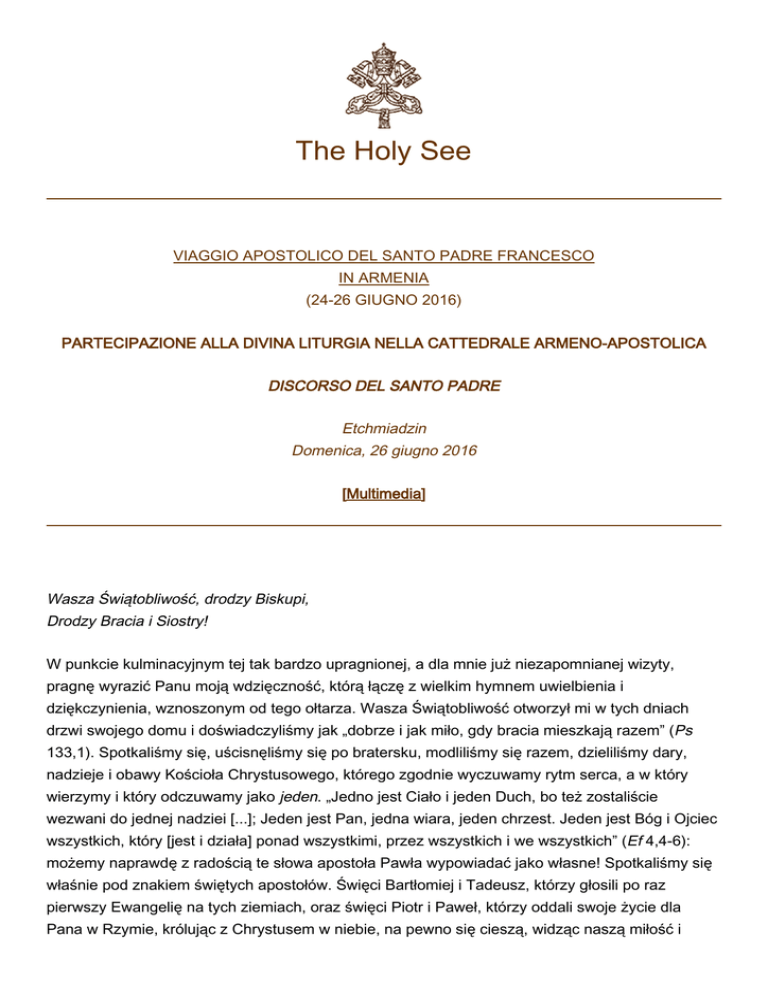 The Holy See VIAGGIO APOSTOLICO DEL SANTO PADRE FRANCESCO IN ARMENIA (24-26 GIUGNO 2016) PARTECIPAZIONE ALLA DIVINA LITURGIA NELLA CATTEDRALE ARMENO-APOSTOLICA DISCORSO DEL SANTO PADRE Etchmiadzin Domenica, 26 giugno 2016 [Multimedia] Wasza Świątobliwość, drodzy Biskupi, Drodzy Bracia i Siostry! W punkcie kulminacyjnym tej tak bardzo upragnionej, a dla mnie już niezapomnianej wizyty, pragnę wyrazić Panu moją wdzięczność, którą łączę z wielkim hymnem uwielbienia i dziękczynienia, wznoszonym od tego ołtarza. Wasza Świątobliwość otworzył mi w tych dniach drzwi swojego domu i doświadczyliśmy jak „dobrze i jak miło, gdy bracia mieszkają razem” (Ps 133,1). Spotkaliśmy się, uścisnęliśmy się po bratersku, modliliśmy się razem, dzieliliśmy dary, nadzieje i obawy Kościoła Chrystusowego, którego zgodnie wyczuwamy rytm serca, a w który wierzymy i który odczuwamy jako jeden. „Jedno jest Ciało i jeden Duch, bo też zostaliście wezwani do jednej nadziei [...]; Jeden jest Pan, jedna wiara, jeden chrzest. Jeden jest Bóg i Ojciec wszystkich, który [jest i działa] ponad wszystkimi, przez wszystkich i we wszystkich” (Ef 4,4-6): możemy naprawdę z radością te słowa apostoła Pawła wypowiadać jako własne! Spotkaliśmy się właśnie pod znakiem świętych apostołów. Święci Bartłomiej i Tadeusz, którzy głosili po raz pierwszy Ewangelię na tych ziemiach, oraz święci Piotr i Paweł, którzy oddali swoje życie dla Pana w Rzymie, królując z Chrystusem w niebie, na pewno się cieszą, widząc naszą miłość i 2 nasze konkretne dążenie do pełnej komunii. Za to wszystko dziękuję Panu za was i z wami: Chwała Bogu. Podczas tej Boskiej Liturgii wznosił się do nieba uroczysty śpiew Trisagion [Święty Boże], wielbiący świętość Boga; zstępuje obfite błogosławieństwo na ziemię, za wstawiennictwem Matki Bożej, wielkich świętych i doktorów, męczenników, zwłaszcza wielu męczenników, których w tym miejscu kanonizowaliście w ubiegłym roku. Niech „Jednorodzony Bóg, który tutaj zstąpił”, pobłogosławi naszą drogę. Niech Duch Święty uczyni z wierzących jedno serce i jedną duszę: niech przyjdzie, aby odnowić nas w jedności. Dlatego chciałbym, czyniąc je swoimi, ponownie przywołać niektóre piękne słowa, które weszły do waszej liturgii. Przyjdź, Duchu, Ty „który z nieustannymi jękami jesteś naszym orędownikiem u miłosiernego Ojca, Ty, który czuwasz nad świętymi i oczyszczasz grzeszników”; wylej na nas ogień swojej miłości i jedności, a „ustaną powody naszego zgorszenia” (GRZEGORZ Z NAREKU, Księga śpiewów żałobliwych, 33, 5), nade wszystko brak jedności uczniów Chrystusa. Niech Kościół Ormiański podąża w pokoju, a komunia między nami niech się stanie pełna. Niech we wszystkich zrodzi się silne pragnienie jedności, jedności, która „nie oznacza ani podporządkowania jednego Kościoła drugiemu, ani też wchłonięcia go, ale raczej przyjęcie wszystkich darów, jakie Bóg dał każdemu, by ukazać całemu światu wielką tajemnicę zbawienia, dokonanego przez Chrystusa Pana za pośrednictwem Ducha Świętego” (Przemówienie Ojca Świętego podczas Boskiej Liturgii w kościele św. Jerzego w Fanarze, Stambuł, 30 listopada 2014, L’Osservatore Romano, wyd. pl. 12 (368)/2014, s.29). Przyjmijmy wezwanie świętych, usłyszymy głos pokornych i ubogich, wielu ofiar nienawiści, które cierpiały i oddały swoje życie za wiarę. Nakłońmy ucha na młode pokolenia, które pragną przyszłości wolnej od podziałów przeszłości. Niech z tego świętego miejsca ponownie rozprzestrzenia się promienne światło; niech do tego, które od czasów świętego Grzegorza, waszego ojca w Ewangelii, oświecało te ziemie, dołączy się światło miłości, która przebacza i jedna. Podobnie jak Apostołowie w poranek wielkanocny, pomimo wątpliwości i niepewności, biegli do miejsca zmartwychwstania, przyciągnięci jutrzenką i szczęśliwi nową nadzieją (por. J 20,3-4), podobnie i my, w tę świętą niedzielę, idźmy za Bożym wezwaniem do pełnej komunii i przyspieszmy ku niej kroku. A teraz Wasza Świątobliwość, w imię Boże, proszę Cię, abyś mnie pobłogosławił, pobłogosławił mnie i Kościół katolicki, abyś pobłogosławił ten nasz bieg ku pełnej jedności. 3 © Copyright - Libreria Editrice Vaticana