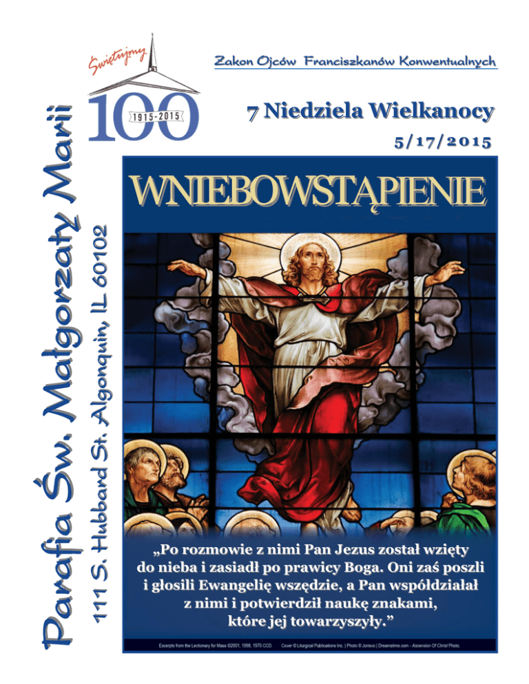 7 Niedziela Wielkanocy 5/17/2015 WNIEBOWSTĄPIENIE 111 S. Hubbard St. Algonquin, lL 60102 Parafia Św. Małgorzaty Marii Zakon Ojców Franciszkanów Konwentualnych „Po rozmowie z nimi Pan Jezus został wzięty do nieba i zasiadł po prawicy Boga. Oni zaś poszli i głosili Ewangelię wszędzie, a Pan współdziałał z nimi i potwierdził naukę znakami, które jej towarzyszyły.” OD PROBOSZCZA „Pan Jezus został wzięty do nieba i zasiadł po prawicy Ojca” Drodzy Przyjaciele ! W opisie sądu ostatecznego Bóg stawia ludzi dobrych po prawej stronie, a ludzi złych po lewej stronie. Ci, którzy są po prawicy Boga, są w zasięgu Jego prawej ręki, a więc On potrafi ich zasłonić i obronić. Trzeba zrobić wszystko, aby zająć miejsce po prawej stronie Boga. Sami się nie obronimy. Potrzebujemy tej Boskiej ręki. Wiedzieli już o tym starożytni Grecy, o czym wspomina Homer. Gdy Odyseusz wracał spod Troi, musiał przepłynąć obok śpiewających syren. Syreny śpiewały tak cudownie, że statki starając się podpłynąć blisko nich, wpływały na mieliznę i rozbijały się. Odyseuszowi udało się uratować tylko dzięki interwencji boskiej. Otrzymał bowiem instrukcję, co zrobić. Marynarze mieli zatkać sobie uszy, a on, jeśli chciał posłuchać syren, to miał zostać przywiązany do masztu. I rzeczywiście cały okręt uratował się. Marynarze nie słyszeli pięknego śpiewu, a sam Odys, chociaż słyszał go i nakazywał im, aby go odwiązali i popłynęli w stronę syren, został przez nich zignorowany. Słowa Ewangelii wg św. Marka 16, 15-20 Jezus ukazawszy się Jedenastu powiedział do nich: „Idźcie na cały świat i głoście Ewangelię wszelkiemu stworzeniu. Kto uwierzy i przyjmie chrzest, będzie zbawiony; a kto nie uwierzy, będzie potępiony. Tym zaś, którzy uwierzą, te znaki towarzyszyć będą: W imię moje złe duchy będą wyrzucać, nowymi językami mówić będą; węże brać będą do rąk i jeśliby co zatrutego wypili, nie będzie im szkodzić. Na chorych ręce kłaść będą i ci odzyskają zdrowie”. Po rozmowie z nimi Pan Jezus został wzięty do nieba i zasiadł po prawicy Boga. Oni zaś poszli Bóg pragnie mieć cię w niebie obok siebie, po i głosili Ewangelię wszędzie, a Pan współdziałał swojej prawej stronie, abyś tam czuł się z nimi i potwierdzał naukę znakami, które jej bezpiecznie. Tam umieścił swojego Syna i tam towarzyszyły. pragnie, abyś był i ty. Bóg wszystko czyni, aby ciebie bronić tu na ziemi, ale i mieć cię po swojej prawicy tam w niebie. Od każdego z nas zależy, na ile podejmiemy wysiłek, aby być blisko Boga i Jego prawej ręki. Podjąć wysiłek, aby podążać z Jezusem do ostatecznego celu naszego życia, jakim jest szczęście wieczne z Bogiem i ze świętymi - oto główna myśl dzisiejszej Uroczystości Wniebowstąpienia Pańskiego. Nasza ojczyzna jest w niebie i tam zmierzamy. Nieba nie znajdziemy na ziemi. Nawet jeśli jesteśmy zdrowi i mamy wystarczająco środków materialnych do dobrego życia i mieszkamy w pięknej części świata, to przecież nie jest niebem. Wokół nas choroby i cierpienie, bieda, głód, wojny, kataklizmy. Są to znaki że przemija postać tego świata i my przemijamy również. Gdzie więc zmierzamy? Jezus na wielu miejscach w Ewangelii mówi nam, że odchodzi do Ojca, aby przygotować nam miejsce. Na pytanie Tomasza: „Panie nie wiemy dokąd idziesz?” odpowiada : „Ja jestem drogą, prawdą i życiem.” Znamy więc drogę do nieba, jest nią sam Jezus Chrystus. W dzisiejszej ewangelii słyszymy również wezwanie Jezusa do ewangelizacji: „Idźcie na cały świat i głoście Ewangelię wszelkiemu stworzeniu. Kto uwierzy i przyjmie chrzest, będzie zbawiony; a kto nie uwierzy będzie potępiony.” Nie możemy więc trzymać nieba tylko dla siebie. Mamy dzielić się Dobrą Nowiną z innymi i w ten sposób pomagać ludziom być tam razem z nami. Pokój i Dobro, Fr. Piotr Sarnicki, OFM, Conv. CZYTANIE Z DZIEJÓW APOSTOLSKICH DZ 1,1-11 CZYTANIE Z LISTU ŚW. PAWŁA APOSTOŁA DO EFEZJAN 1,17-23 Pierwszą książkę napisałem, Teofilu, o wszystkim, co Jezus czynił i nauczał od początku aż do dnia, w którym udzielił przez Ducha Świętego poleceń Apostołom, których sobie wybrał, a potem został wzięty do nieba. Im też po swojej męce dał wiele dowodów, że żyje: ukazywał się im przez czterdzieści dni i mówił o królestwie Bożym. Bracia: A podczas wspólnego posiłku kazał im nie odchodzić z Jerozolimy, ale oczekiwać obietnicy Ojca. Mówił: „Słyszeliście o niej ode Mnie: Jan chrzcił wodą, ale wy wkrótce zostaniecie ochrzczeni Duchem Świętym”. Zapytywali Go zebrani: „Panie, czy w tym czasie przywrócisz królestwo Izraela?”. Odpowiedział im: „Nie wasza to rzecz znać czas i chwile, które Ojciec ustalił swoją władzą, ale gdy Duch Święty zstąpi na was, otrzymacie Jego moc i będziecie moimi świadkami w Jerozolimie i w całej Judei, i w Samarii, i aż po krańce ziemi”. Bóg Pana naszego Jezusa Chrystusa, Ojciec chwały, dał wam ducha mądrości i objawienia w głębszym poznawaniu Jego samego, to znaczy światłe oczy dla waszego serca, tak byście wiedzieli, czym jest nadzieja waszego powołania, czym bogactwo chwały Jego dziedzictwa wśród świętych i czym przemożny ogrom Jego mocy względem nas wierzących - na podstawie działania Jego potęgi i siły, z jaką dokonał dzieła w Chrystusie, gdy wskrzesił Go z martwych i posadził po swojej prawicy na wyżynach niebieskich, ponad wszelką zwierzchnością i władzą, i mocą, i panowaniem, i ponad wszelkim innym imieniem wzywanym nie tylko w tym wieku, ale i w przyszłym. I wszystko poddał pod Jego stopy, a Jego samego ustanowił nade wszystko Głową dla Kościoła, który jest Jego Ciałem, Pełnią Tego, który napełnia wszystko na wszelki sposób. Po tych słowach uniósł się w ich obecności w górę i obłok zabrał Go im sprzed oczu. Ki