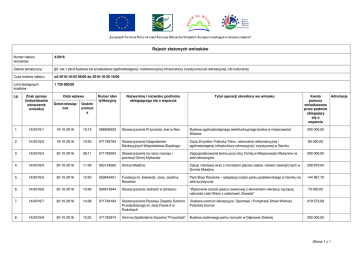 Rejestr złożonych wniosków Numer naboru wniosków: 4/2016 Zakres tematyczny: §2. ust.1 pkt.6 budowa lub przebudowa ogólnodostępnej i niekomercyjnej infrastruktury turystycznej lub rekreacyjnej, lub kulturalnej Czas trwania naboru: od 2016-10-03 08:00 do 2016-10-20 16:00 Limit dostępnych środków : 1 720 000,00 Lp. Znak sprawy (indywidualne oznaczenie wniosku) Data wpływu Numer iden tyfikacyjny Nazwa/imię i nazwisko podmiotu ubiegającego się o wsparcie Tytuł operacji określony we wniosku Kwota pomocy wnioskowana przez podmiot ubiegający się o wsparcie Dzień/miesiąc /rok Godzin a/minut a 1. I/4/2016/1 19-10-2016 15:15 068906933 Stowarzyszenie Przyszłość Jest w Nas Budowa ogólnodostępnego wielofunkcyjnego boiska w miejscowości Widzów 300 000,00 2. I/4/2016/2 19-10-2016 15:20 071793794 Stowarzyszenie Gospodarstw Edukacyjnych Województwa Śląskiego - Oaza Zmysłów i Fabryka Tlenu- utworzenie niekomercyjnej i ogólnodostępnej infrastruktury rekreacyjnej i turystycznej w Garnku. 85 000,00 3. I/4/2016/3 20-10-2016 08:11 071783054 Stowarzyszenie na rzecz rozwoju i promocji Gminy Mykanów Zagospodarowanie terenu przy ulicy Cichej w Miejscowości Mykanów na cele rekreacyjne. 300 000,00 4. I/4/2016/4 20-10-2016 11:00 063134562 Gmina Miedźno Zakup i dostawa wraz z montażem placów zabaw i siłowni zewnętrznych w Gminie Miedźno 299 970,00 5. I/4/2016/5 20-10-2016 12:50 063842401 Fundacja im. Edwarda, Jana, Józefiny Reszków Park Braci Reszków – adaptacja części parku poddworskiego w Garnku na cele turystyczne 144 987,70 6. I/4/2016/6 20-10-2016 13:46 064813944 Stowarzyszenie Jedność w działaniu "Wykonanie ścieżki pieszo-rowerowej z elementami rekreacji, łączącej nabrzeże rzeki Warty z sołectwem Zawada" 70 000,00 7. I/4/2016/7 20-10-2016 14:28 071764184 Stowarzyszenie Rozwoju Zespołu SzkolnoPrzedszkolnego im Jana Pawła II w Rudnikach Budowa centrum rekreacyjno- Sportowe / Pumptrack Street Workout Piramida linarna/ 219 572,69 8. I/4/2016/8 20-10-2016 15:23 071763974 Gminna Spółdzielnia Socjalna "Przyszłość" Budowa siatkowego parku rozrywki w Dąbrowie Zielonej 300 000,00 Strona 1 z 1 Powered by TCPDF (www.tcpdf.org) Adnotacje