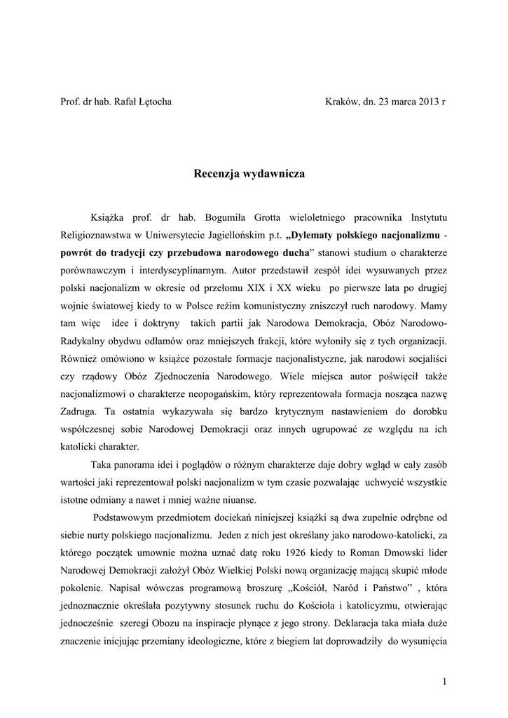 Prof. dr hab. Rafał Łętocha Kraków, dn. 23 marca 2013 r Recenzja wydawnicza Książka prof. dr hab. Bogumiła Grotta wieloletniego pracownika Instytutu Religioznawstwa w Uniwersytecie Jagiellońskim p.t. „Dylematy polskiego nacjonalizmu powrót do tradycji czy przebudowa narodowego ducha” stanowi studium o charakterze porównawczym i interdyscyplinarnym. Autor przedstawił zespół idei wysuwanych przez polski nacjonalizm w okresie od przełomu XIX i XX wieku po pierwsze lata po drugiej wojnie światowej kiedy to w Polsce reżim komunistyczny zniszczył ruch narodowy. Mamy tam więc idee i doktryny takich partii jak Narodowa Demokracja, Obóz Narodowo- Radykalny obydwu odłamów oraz mniejszych frakcji, które wyłoniły się z tych organizacji. Również omówiono w książce pozostałe formacje nacjonalistyczne, jak narodowi socjaliści czy rządowy Obóz Zjednoczenia Narodowego. Wiele miejsca autor poświęcił także nacjonalizmowi o charakterze neopogańskim, który reprezentowała formacja nosząca nazwę Zadruga. Ta ostatnia wykazywała się bardzo krytycznym nastawieniem do dorobku współczesnej sobie Narodowej Demokracji oraz innych ugrupować ze względu na ich katolicki charakter. Taka panorama idei i poglądów o różnym charakterze daje dobry wgląd w cały zasób wartości jaki reprezentował polski nacjonalizm w tym czasie pozwalając uchwycić wszystkie istotne odmiany a nawet i mniej ważne niuanse. Podstawowym przedmiotem dociekań niniejszej książki są dwa zupełnie odrębne od siebie nurty polskiego nacjonalizmu. Jeden z nich jest określany jako narodowo-katolicki, za którego początek umownie można uznać datę roku 1926 kiedy to Roman Dmowski lider Narodowej Demokracji założył Obóz Wielkiej Polski nową organizację mającą skupić młode pokolenie. Napisał wówczas programową broszurę „Kościół, Naród i Państwo” , która jednoznacznie określała pozytywny stosunek ruchu do Kościoła i katolicyzmu, otwierając jednocześnie szeregi Obozu na inspiracje płynące z jego strony. Deklaracja taka miała duże znaczenie inicjując przemiany ideologiczne, które z biegiem lat doprowadziły do wysunięcia 1 idei Katolickiego Państwa Narodu Polskiego, które było aktualne w całym obozie narodowym, we wszystkich jego odłamach, aż do końca ich działalności zakończonej po drugiej wojnie światowej wraz ze zniszczeniem całego ruchu przez reżim komunistyczny. Wymieniona tu broszura Dmowskiego do dzisiaj zachowała pewną aktualność o czym świadczą jej kolejne przedruki. Drugi nurt polskiego nacjonalizmu, co prawda nieliczny stanowił krytykę pierwszego i zarazem wysuwał własne, odrębne propozycje nie odwołujące się do nauki Kościoła, a wręcz z nią sprzeczne. Tu właśnie autor przekroczył datę roku 1926 ukazując wcześniejsze wątki ideowe o charakterze nacjonalistycznym, nie odwołujące się do nauki Kościoła, które grupa Zadrugi potraktowała jako inspiracje dogodne dla swoich celów. Wątkami tymi była myśl Stanisława Brzozowskiego (tzw. jego okres „nacjonalizmu proletariackiego”) oraz myśl wczesnej Narodowej Demokracji fragmentarycznie krytykowana przez duchowieństwo, jako przekraczająca granice dopuszczalne z katolickiego punktu widzenia. Myśl ta została zinterpretowana przez Zadrugę jako zbiór pozytywnych idei, które nie rozwinęły się w obrębie obozu narodowego a nawet zanikły, które warto jest podjąć na nowo dalej rozwijać. Nic więc dziwnego, że autor recenzowanej książki uznał za stosowne przedstawić te epizody i ukazać w ten sposób sytuację i korzenie myśli Zadrugi. Z tego też powodu w książce pojawiają się pewne wątki piśmiennictwa wczesnego Dmowskiego (np. „Myśli nowoczesnego Polaka”) czy Zygmunta Balickiego („Egoizm narodowy wobec etyki”) i inne z przełomu XIX i XX wieku. Uważam, że takie zestawienie i porównanie jest słuszne i daje ciekawy efekt poznawczy. W opracowania Grotta wyłaniają się więc dwa nurty o różnej filozofii i rożnych podstawach światopoglądowych oraz Książka ogranicza historiozoficznych. nie założeniach się tylko polityczno-społecznych do rekonstrukcji i spuścizny poszczególnych partii czy frakcji ale wprowadza czytelnika także w krąg głębszych kwestii ideologicznych i światopoglądowych tamtego czasu. W ten sposób nasz wgląd w spuściznę doktrynalną polskiego nacjonalizmu zyskuje daleko szerszy wymiar. Stanowi to istotną zaletę książki. Jej komparatystyczny charakter został rozszerzony jeszcze i na innej płaszczyźnie. Autor odwołał się również i do wielu innych ruchów nacjonalistycznych równolegle funkcjonujących w Europie, ukazując na pierwszym planie ich podstawowe cechy celem porównania z cechami partii i grup polskich. W ten sposób ukazał drogi przepływu idei z zachodu Europy do Polski oraz wskazał na te koncepcje, które u nas uzyskały pewne 2 powodzenie na prawej stronie sceny politycznej i te, które nie przyjmowały się w Polsce. Starał się też pokazać od czego była uzależniona recepcja obcych wzorców, a od czego ich odrzucanie. Również, co moim zdaniem jest także ciekawe, ujął rozmaite zjawiska z zagraniczne z zakresu ideologii, jako źródła i przyczyny nie tylko inspiracji całościowej lub tylko częściowej ale także i jako zagrożenia. Szczególnie dotyczy to rozwoju niemieckiego nacjonalizmu, któremu to problemowi poświęcił dwa rozdziały, ale także i sowieckiego komunizmu. W pierwszym wypadku przedstawił splot wydarzeń z zakresu historii, kultury, filozofii i polityki oraz innych przejawów myśli, które stworzyły groźny dla egzystencji narodu polskiego zespół przekonań inspirujących następnie konkretne akty polityki niemieckiej od końca XIX wieku po lata pierwszej a potem i drugiej wojny światowej. Takie ujecie uważam za ciekawe i potrzebne. Innym wątkiem poruszanym w książce jest wątek religijności. Został on ukazany z jednej 