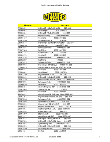 Części zamienne Meiller Polska Numer 39002652 39006462 39002624 39006413 39006437 39001820 39002573 39006410 39007825 39007986 39002224 39006475 39007826 39002589 39007823 39007962 39008055 39006431 39006461 39002210 39002642 39007579 39007875 39006436 39008151 39001848 39006477 20830422 39002257 39007818 39001956 39002832 39006398 39007984 39002834 39007750 20825917 39002673 39002703 39007985 39002655 39007970 39024124 Części zamienne Meiller Polska.xls Nazwa O-Ring iØ 29.2x3,0 NBR 70 610 045 Ventilkegel 0501 2307 015 O-Ring iØ 7,3x2,4 NBR 70 610 005 Kugelkopfring 1000 2254 006 Ventilsitz 0000 2303 102 Sich.Ring 75x2,5 516 240 Dichtring A 36x42x2mm/Kupfer 600 193 Ventilschutz 2000 2253 001 Schraubenfeder 0000 9301 037 Profilring 0000 9407 011 Nadelrolle 3X33,8 567 492 Ventilstift 0000 2309 075 Schraubenfeder 0000 9301 040 Profilring 604 006 Schraubenfeder 0000 9301 023 Dichtring A 24X30X2,5 0000 9401 003 Nutring-Manschette Bis 1015 9420 004 Ventilsitz 0000 2303 085 Ventilkegel 0501 2307 014 Kugel D 6mm Kl. III 567 012 O-Ring iØ 21,0x2,5 NBR 70 610 028 Stellschraube M 12X1,5X55 0000 9005 000 Schraubenfeder 0000 9301 255 Ventilsitz 0000 2303 101 Abstreifring bis -45° 2102 9430 004 Sprengring Sw 22 516 919 Ventilstift 0000 2309 084 Abstellbuegel Ø 215 verz 2000 2222 002 Kegel-Schmiernippel Bm 8x1 569 004 Schraubenfeder 0000 9301 001 Spannstift Ø 20x75 - L2 524 255 Lippenring P 41 8/16X5,5 612 408 Kugelpfanne Ø 215 2000 2220 008 Profilring Ptfe Gesch. 0000 9407 005 K-Ring Typ Ka 50 612 412 Stellschraube 0000 9215 001 Kugelflansch Ø 215 2000 2086 067 O-Ring iØ 49,0x3,0 NBR 70 610 085 O-Ring iØ 92,0x5,0 70 Shore 610 155 Zylinderring Ptfe 0000 9407 010 O-Ring iØ 32,0x4,5 NBR 70 610 056 Dichtring 30x34x2 0000 9401 048 Buchse 0000 1118 018 Grudzień 2012 1 Części zamienne Meiller Polska 29003175 39001874 39002225 39005748 39006395 39007929 39008331 39001697 39001866 39002562 39002826 39002828 59000243 39001664 39001876 39001946 39006446 39008054 39008056 39008150 39008152 59000240 39002054 39002116 39003813 70030439 20825302 29027129 39001794 39002721 39005652 39008127 39001814 39002565 39006493 39006508 39007305 39007712 29027287 39002816 39002853 39005808 29014376 39001970 39002023 39002025 39002675 39002707 39005330 39005331 Części zamienne Meiller Polska.xls Sperrklinke 0000 5254 047 Zyl.-Kerbstift 5X32 Verz. 522 077 Nadelrolle 4X49,8 567 496 Beilage 0000 1152 008 Kugelpfanne 60 1000 2220 018 Schenkelfeder 0000 9303 002 Distanzbuchse 0000 9525 022 Scheibe Ø 30mm verz. 510 815 Sicherungsring 30x1,2 517 413 Dichtring A 30x36x2mm/Kupfer 600 127 Compact-Stangendichtung 612 368 K-Ring Ka 35 612 383 Verschlußstopfen GPN 900 A 12,5 573 526 Seal-Lock-6-Kt-Bundm. M 8 Verz. 506 903 Zyl.-Kerbstift 6X20 Verz. 522 087 Spannstift Ø 10x75 - L2 524 209 Federteller 0000 2305 060 Nutring-Manschette Bis 1015 9420 003 Nutring-Manschette Bis 1015 9420 005 Abstreifring Bis -45 Gr 2102 9430 003 Abstreifring bis -45° 2102 9430 005 Verschlußstopfen GPN 300 F 17 573 521 Splint Ø 6,3x45-ST / A2-70 525 077 Bolzen 30h11x125x109-ST50K / L2 543 430 Nippel 705 799 Kugel obere Ø 60 1000 2206 044 Deckel Kompl. 0000 2047 011 Kippgabel Hinten Typ16 0000 1115 039 Sich.Ring 26x1,2 516 022 O-Ring iØ 153,0x6,0 NBR 70 610 217 Auflage 0000 1119 031 Stangen-Dichtung 93,1 7 4000 9424 004 Sich.Ring 36x1,5 516 222 Dichtring A 10x16x1,5mm/Kupfer 600 164 Steuerkolben 0000 2316 048 Deckel 0000 2353 025 Haken 0000 5440 132 Führungsschraube 0000 9202 117 Abdeckblech Typ 16 0000 1313 005 Blockdichtung 16 612 336 Back-Ring P 36 8X16X1 612 521 Dia-1-Auslegerlager Typ16 0000 1220 030 Welle 0000 2313 293 Spannstift Ø 25x95 - L2 524 348 Einsp.Buchse 72/80X80 C 524 607 Einsp.Buchse 80/95X90 C 524 609 O-Ring iØ 50,2x3,0 NBR 70 610 089 O-Ring iØ 108,0x3,0 NBR 70 610 169 Hakenverschluß li. vollst. 0000 1026 272 Hakenverschluß re. vollst. 0000 1026 273 Grudzień 2012 2 Części zamienne Meiller Polska 39006371 39006447 39008069 39008163 39008189 39008269 20830958 20831134 20839394 39001270 39002684 39002698 39002759 39002770 39002771 39002814 39002818 39006097 39007634 39007766 39008021 39008070 39008164 70034032 20831105 39001750 39001817 39002572 39002749 39002901 39004789 39005810 39007989 39008057 39008116 39008153 20831067 29001031 29003323 29019699 29027130 29027956 29029457 39000885 39001172 39001891 39002830 39005745 39006412 39006480 Części zamienne Meiller Polska.xls Kugel Obere Ø 60 1000 2206 002 Federteller 0000 2305 061 Nutring-Dichtsatz 110 1020 9420 006 Abstreifring 110 2120 9430 006 Balg 0000 9440 092 Stangen-Fuehrungsring 5203 9505 004 Kolben Ø 78 2500 2264 008 Kolben Ø151 1501 2268 000 Ringverschraubung 0000 9006 077 Zyl.Schr. M 8x25 verz. 440 046 O-Ring iØ 60,0x3,0 NBR 70 610 108 O-Ring iØ 80,0x5,0 70 Shore 610 142 O-Ring iØ 15,6x1,78 NBR 70 610 509 O-Ring iØ 10,82x1,78 NBR 70 610 556 O-Ring iØ 14,0x1,78 NBR 70 610 559 Blockdichtung 612 331 Blockdichtung 24 612 341 Hebelstueck Verz. 0000 1243 252 Gummi-Metall-Auflage 0000 9055 068 Augenschraube 0000 9224 007 Stuetzring Endlos 0000 9408 007 Nutring-Dichtsatz 129 1020 9420 007 Abstreifring 129 2120 9430 007 Kolben 78Ø 1500 2023 004 Kolben Ø143 2501 2267 008 Federring B 16 / Z5 513 914 Sich.Ring 58x2 516 232 Dichtring A 33x39x2mm/Kupfer 600 192 O-Ring iØ 102,0x5,0 70 Shore 610 345 Uniflex-Schlauch DN 40 615 543 Siebeinsatz 796 560 Dia-2-Auslegerlager Typ16 0000 1220 032 Profilring Ø59x5 f.M 56x2 0000 9407 024 Nutring-Manschette Bis 1015 9420 006 Nutring-Dichtsatz 5307 9421 010 Abstreifring bis -45° 2102 9430 006 Kolben Ø118 2501 2266 008 Ventilkörper 0501 2301 025 Verschluß-Schraube 0000 9201 252 Buchse 0000 1118 026 Buchse 0000 1118 009 Bolzen Vollst. 0000 9044 150 Auflage 0000 1119 105 Verschlusszapfen 381 467 6Kt-Schr. M 16x1,5x55 / 8.8 A3 430 591 Spannstift Ø 8x60 - L2 523 879 Manschette Una 25/17X5. 612 401 Beilage 0000 1152 001 Kugelkopfring 1000 2254 000 Ventilstift 0503 2309 012 Grudzień 2012 3 Części zamienne Meiller Polska