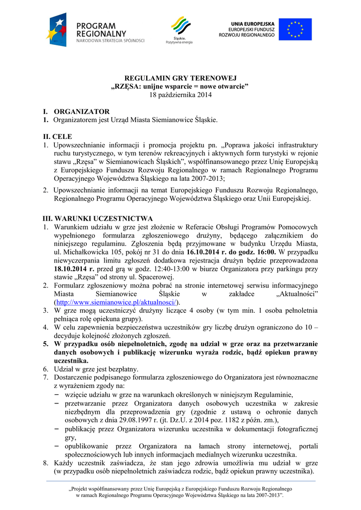 REGULAMIN GRY TERENOWEJ „RZĘSA: unijne wsparcie = nowe otwarcie” 18 października 2014 I. ORGANIZATOR 1. Organizatorem jest Urząd Miasta Siemianowice Śląskie. II. CELE 1. Upowszechnianie informacji i promocja projektu pn. „Poprawa jakości infrastruktury ruchu turystycznego, w tym terenów rekreacyjnych i aktywnych form turystyki w rejonie stawu „Rzęsa” w Siemianowicach Śląskich”, współfinansowanego przez Unię Europejską z Europejskiego Funduszu Rozwoju Regionalnego w ramach Regionalnego Programu Operacyjnego Województwa Śląskiego na lata 2007-2013; 2. Upowszechnianie informacji na temat Europejskiego Funduszu Rozwoju Regionalnego, Regionalnego Programu Operacyjnego Województwa Śląskiego oraz Unii Europejskiej. III. WARUNKI UCZESTNICTWA 1. Warunkiem udziału w grze jest złożenie w Referacie Obsługi Programów Pomocowych wypełnionego formularza zgłoszeniowego drużyny, będącego załącznikiem do niniejszego regulaminu. Zgłoszenia będą przyjmowane w budynku Urzędu Miasta, ul. Michałkowicka 105, pokój nr 31 do dnia 16.10.2014 r. do godz. 16:00. W przypadku niewyczerpania limitu zgłoszeń dodatkowa rejestracja drużyn będzie przeprowadzona 18.10.2014 r. przed grą w godz. 12:40-13:00 w biurze Organizatora przy parkingu przy stawie „Rzęsa” od strony ul. Spacerowej. 2. Formularz zgłoszeniowy można pobrać na stronie internetowej serwisu informacyjnego Miasta Siemianowice Śląskie w zakładce „Aktualności” (http://www.siemianowice.pl/aktualnosci/). 3. W grze mogą uczestniczyć drużyny liczące 4 osoby (w tym min. 1 osoba pełnoletnia pełniąca rolę opiekuna grupy). 4. W celu zapewnienia bezpieczeństwa uczestników gry liczbę drużyn ograniczono do 10 – decyduje kolejność złożonych zgłoszeń. 5. W przypadku osób niepełnoletnich, zgodę na udział w grze oraz na przetwarzanie danych osobowych i publikację wizerunku wyraża rodzic, bądź opiekun prawny uczestnika. 6. Udział w grze jest bezpłatny. 7. Dostarczenie podpisanego formularza zgłoszeniowego do Organizatora jest równoznaczne z wyrażeniem zgody na: − wzięcie udziału w grze na warunkach określonych w niniejszym Regulaminie, − przetwarzanie przez Organizatora danych osobowych uczestnika w zakresie niezbędnym dla przeprowadzenia gry (zgodnie z ustawą o ochronie danych osobowych z dnia 29.08.1997 r. (jt. Dz.U. z 2014 poz. 1182 z późn. zm.), − publikację przez Organizatora wizerunku uczestnika w dokumentacji fotograficznej gry, − opublikowanie przez Organizatora na łamach strony internetowej, portali społecznościowych lub innych informacjach medialnych wizerunku uczestnika. 8. Każdy uczestnik zaświadcza, że stan jego zdrowia umożliwia mu udział w grze (w przypadku osób niepełnoletnich zaświadcza rodzic, bądź opiekun prawny uczestnika). „Projekt współfinansowany przez Unię Europejską z Europejskiego Funduszu Rozwoju Regionalnego w ramach Regionalnego Programu Operacyjnego Województwa Śląskiego na lata 2007-2013”. 9. Uczestnicy zobowiązują się, iż nie będą rościć żadnych praw z tytułu publikacji ich nazwisk, wizerunku oraz fragmentów zawodów i występów w środkach masowego przekazu oraz zezwalają na wykorzystywanie i przetwarzanie w bazach danych informacji osobowych zawartych w formularzu zgłoszeniowym. 10. Formularz zgłoszeniowy musi być kompletnie wypełniony i podpisany przez wszystkich członków drużyny. 11. W przypadku rezygnacji z udziału w grze po dokonaniu zgłoszenia lub w trakcie jej trwania, uczestnicy są zobowiązani niezwłocznie powiadomić o tym fakcie organizatora gry telefonicznie pod numerem telefonu 7605422 lub osobiście. Numery telefonów są także wskazane na Karcie Drużyny. IV. TERMIN I MIEJSCE Gra odbywa się 18 października 2014 r. (sobota) w godzinach 12.40 – 14.00. Miejsce: teren stawu „Rzęsa” i jego okolice. Start: biuro Organizatora – parking przy Stawie Rzęsa od strony ul. Spacerowej. • godz. 12.40-13:00 rejestracja drużyn, • godz. 13:00 start drużyn (start wspólny), • godz. 14.00 zakończenie gry i podliczenie wyników, • godz. 14.30 ogłoszenie wyników i wręczenie nagród. V. ZASADY GRY 1. Przez organizację gry rozumie się przygotowanie Punktów Kontrolnych na terenie stawu „Rzęsa” i jego okolicy w Siemianowicach Śląskich oraz inne czynności zmierzające do prawidłowego jej przebiegu. Charakter imprezy powoduje, że drużyny poruszają się po terenie na własną odpowiedzialność. 2. Wyznaczony teren gry został zaznaczony na mapie pomocniczej, którą drużyna otrzymuje na starcie w biurze Organizatora. 3. Wszystkie Punkty Kontrolne ustawione są w widocznych miejscach. 4. Zadaniem drużyn jest odnalezienie 10 Punktów Kontrolnych, rozmieszczonych na wyznaczonym terenie, prawidłowe rozwiązanie zagadek/zadań. Przy każdym Punkcie Kontrolnym do wykonania jest tylko jedna zagadka/zadanie. 5. Dla niektórych zadań w Punkcie Kontrolnym będą podane 3 odpowiedzi. Należy ocenić oraz wybrać tylko jedną, prawidłową odpowiedź, a następnie wpisać ją do „Karty drużyny” w odpowiednim miejscu dla danego zadania. 6. Wszystkie zadania wypełniają cele zabawy (patrz pkt. II.1-2). Materiałem pomocniczym będzie artykuł opublikowany na stronie internetowej serwisu informacyjnego Miasta Siemianowice Śląskie w zakładce „Aktualności” w ciągu tygodnia poprzedzającego dzień gry terenowej (13-17.10.2014 r., http://www.siemianowice.pl/aktualnosci/) 7. Numery pytań przyporządkowane są poszczególnym Punktom Kontrolnym. 8. Kolejność zaliczania poszczególnych Punktów Kontrolnych gry jest dowolna. 9. Lokalizacja każdego Punktu Kontrolnego zostanie oznakowana planszą z hasłem gry: GRA TERENOWA „RZĘSA: unijne wsparcie = nowe otwarcie” oraz logotypem miasta. 10. W każdym Punkcie Kontrolnym liczba uczestników w drużynie musi być kompletna. W razie niezgodności liczby uczestników w drużynie w danym Punkcie Kontrolnym