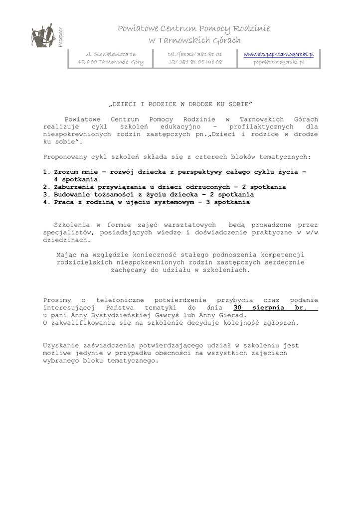 „DZIECI I RODZICE W DRODZE KU SOBIE” Powiatowe Centrum Pomocy Rodzinie w Tarnowskich Górach realizuje cykl szkoleń edukacyjno – profilaktycznych dla niespokrewnionych rodzin zastępczych pn.„Dzieci i rodzice w drodze ku sobie”. Proponowany cykl szkoleń składa się z czterech bloków tematycznych: 1. Zrozum mnie – rozwój dziecka z perspektywy całego cyklu życia – 4 spotkania 2. Zaburzenia przywiązania u dzieci odrzuconych – 2 spotkania 3. Budowanie tożsamości z życiu dziecka – 2 spotkania 4. Praca z rodziną w ujęciu systemowym – 3 spotkania Szkolenia w formie zajęć warsztatowych będą prowadzone przez specjalistów, posiadających wiedzę i doświadczenie praktyczne w w/w dziedzinach. Mając na względzie konieczność stałego podnoszenia kompetencji rodzicielskich niespokrewnionych rodzin zastępczych serdecznie zachęcamy do udziału w szkoleniach. Prosimy o telefoniczne potwierdzenie przybycia oraz podanie interesującej Państwa tematyki do dnia 30 sierpnia br. u pani Anny Bystydzieńskiej Gawryś lub Anny Gierad. O zakwalifikowaniu się na szkolenie decyduje kolejność zgłoszeń. Uzyskanie zaświadczenia potwierdzającego udział w szkoleniu jest możliwe jedynie w przypadku obecności na wszystkich zajęciach wybranego bloku tematycznego. HARMONOGRAM SZKOLEŃ Nazwa cyklu Zrozum mnie – rozwój dziecka z perspektywy całego cyklu życia. Zaburzenia przywiązania u dzieci odrzuconych. Budowanie tożsamości z życiu dziecka. Praca z rodziną w ujęciu systemowym. Data cz.I: 14.09.2009 cz.II: 19.10.2009 cz.III:09.11.2009 cz.IV: 23.11.2009 cz I: 08.10.2009 cz.II: 09.10.2009 cz.I: 29.10.2009 cz.II: 30.10.2009 cz.I: 04.09.2009 cz.II: 01.10.2009 cz.III: 12.11.2009 Czas trwania 15.30 15.30 15.30 15.30 – - 18.00 18.00 18.00 18.00 10.00 – 14.00 10.00 – 14.00 10.00-14.00 10.00-14.00 15.30–18.00 15.30-18.00 15.30-18.00 Prowadzący Elżbieta Kanas – Kiczka, psycholog, dyrektor Powiatowej Poradni Psychologiczno – Pedagogicznej w Tarnowskich Górach Magdalena Pietrzyk – psycholog, pracownik Powiatowej Poradni Psychologiczno – Pedagogicznej oddział w Radzionkowie Teresa Jadczak – Szumiło Magister psychologii i pedagogiki. Jest trenerem Polskiego Towarzystwa Psychologicznego - nr licencji 195, edukatorem MENiS. Specjalizuje się w szkoleniach z zakresu stymulacji rozwoju, zaburzeń więzi i FAS. Teresa Jadczak – Szumiło Magister psychologii i pedagogiki. Jest trenerem Polskiego Towarzystwa Psychologicznego - nr licencji 195, edukatorem MENiS. Specjalizuje się w szkoleniach z zakresu stymulacji rozwoju, zaburzeń więzi i FAS. Maria Marquardt psycholog, psychoterapeutka Sekcji Psychoterapii Polskiego Towarzystwa Psychologicznego (certyfikat nr 128), licencjonowany trener Polskiego Towarzystwa Psychologicznego. Kieruje filią Polskiego Instytutu Ericksonowskiego w Katowicach.