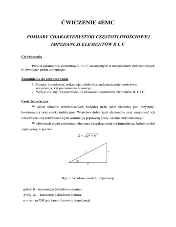 ĆWICZENIE 4EMC POMIARY CHARAKTERYSTYKI CZĘSTOTLIWOŚCIOWEJ IMPEDANCJI ELEMENTÓW R L C Cel ćwiczenia Pomiar parametrów elementów R, L i C stosowanych w urządzeniach elektronicznych w obwodach prądu zmiennego. Zagadnienia do przygotowania 1. Pojęcia: impedancja, reaktancja indukcyjna, reaktancja pojemnościowa, rezystancja, kąt przesunięcia fazowego. 2. Wpływ zmiany częstotliwości na własności parametrów elementów R, L i C. Część teoretyczna W skład układów elektronicznych wchodzą m.in. takie elementy jak: rezystory, kondensatory oraz cewki indukcyjne. Właściwy dobór tych elementów oraz znajomość ich właściwości częstotliwościowych warunkują poprawną pracę układu elektronicznego. W obwodach prądu zmiennego elementy charakteryzują się impedancją, której moduł zapisujemy w postaci: Z = R2 + X 2 Rys.1. Składowe modułu impedancji gdzie: R - rezystancja (składowa czynna), X=XL–XC - reaktancja (składowa bierna), φ = arc tg X/R jest kątem fazowym impedancji. Idealny rezystor R nie wprowadza przesunięcia fazowego, a jego impedancja jest równa rezystancji: Z = R, idealny kondensator C powoduje opóźnienie napięcia względem przepływającego przez niego prądu o π/2, a jego impedancja równa się reaktancji pojemnościowej: ZC = XC, w idealnej cewce natomiast napięcie wyprzedza prąd o π/2, a impedancja jest równa reaktancji indukcyjnej: ZL= XL. W rzeczywistych elementach R, L, C przesunięcie fazowe φ między napięciem i prądem różni się od wartości teoretycznych. Wynika to z istnienia pasożytniczych indukcyjności i pojemności doprowadzeń w rezystorach, indukcyjności i rezystancji doprowadzeń w kondensatorach , rezystancji i pojemności uzwojeń w cewkach. Wartości niepożądanych parametrów są zależne od technologii wykonania elementów. Niewielki wpływ parametrów pasożytniczych przy małych częstotliwościach staje się istotny w zakresie wielkich częstotliwości. Właściwości podzespołów rzeczywistych, na podstawie analizy właściwości fizycznych danego elementu, przedstawia się w postaci schematów zastępczych. Jeden z elementów schematu stanowi parametr podstawowy, inne natomiast reprezentują istnienie elementów pasożytniczych. W zależności od tego, który z parametrów przedstawionego układu zastępczego jest dominujący, wypadkowy charakter elementu może być: rezystancyjny, indukcyjny lub pojemnościowy. Rezystorowi włączonemu w obwód prądu zmiennego można przyporządkować schemat zastępczy uwzględniający indukcyjność L końcówek rezystora (oraz uzwojeń rezystorów drutowych) i pojemność C między zaciskami wejściowymi. W takim przypadku rezystor może posiadać dwojaki charakter: rezystory o małych wartościach oporności, a także rezystory drutowe, mogą mieć charakter indukcyjny. Rezystory o dużych wartościach oporności mogą mieć charakter pojemnościowy, wtedy schemat zastępczy upraszcza się do równoległego połączenia rezystancji R i pojemności C. Rys.2 Schematy zastępcze rezystora Kondensator rzeczywisty należy traktować jako dwójnik o elementach rezystancyjnym i pojemnościowym połączonych szeregowo lub równolegle (rys. 3). Rezystory R reprezentują wypadkowe straty energii w dielektryku, doprowadzeniach i okładzinach kondensatora. Rys.3 Schematy zastępcze kondensatora Schemat zastępczy szeregowy jest stosowany częściej dla kondensatorów o małych stratach, a schemat równoległy dla kondensatorów o dużych stratach. Wartość strat kondensatora charakteryzuje współczynnik stratności, opisywany jako tangens kąta stratności - tg δ. Jest to wartość kąta dopełniającego do 90° kąt przesunięcia fazowego φ między prądem i napięciem kondensatora. Dla szeregowego schematu zastępczego współczynnik stratności : tg δ =ωRsCs dla równoległego schematu zastępczego tgδ = 1 ωRr C r Współczynnik ten określa stopień, w jakim kondensator rzeczywisty odbiega od idealnego. Zmiana częstotliwości wywołuje zmianę współczynników stratności obu modeli. Z analizy zjawisk zachodzących w kondensatorach rzeczywistych wynika, że dla częstotliwości mniejszych ich właściwości lepiej odwzorowuje układ zastępczy równoległy, zaś dla większych - układ zastępczy szeregowy. Cewce indukcyjnej w zakresie małych częstotliwości i przy małej wartości indukcji pola magnetycznego można przyporządkować jeden z poniższych układów zastępczych (rys.4). Rys.4. Schematy zastępcze cewki Rezystancje w tych schematach reprezentują straty w przewodzie cewki, straty na prądy wirowe, straty dielektryczne pojemności rozproszonych oraz, jeśli cewka posiada rdzeń ferromagnetyczny, straty w rdzeniu wynikające głównie z prądów wirowych oraz strat histerezowych. W układzie szeregowym dobroć cewki Q jest parametrem jakości cewki: Q= ωL R Pomiar impedancji, sprowadza się do określenia wartości jej składowych: rezystancji R oraz reaktancji X lub modułu Z i kąta fazowego φ. Do podstawowych metod pomiaru impedancji zaliczamy : metodę techniczną, metodę mostkową, metodę rezonansową. Metoda techniczna pomiaru impedancji Z polega na: - pomiarze: napięcia U i prądu I za pomocą woltomierza i amperomierza, - pomiarze mocy czynnej P za pomocą watomierza, - obliczeniu: o modułu, na podstawie prawa Ohma Z = U/I, o argumentu φ =arc cos(P/(UI)) gdzie UI=S – moc pozorna, o składowej czynnej R=P/I2, o składowej biernej X = Z2 − R 2 . W ćwiczeniu zastosowano metodę mostkową. Część praktyczna 1. Badanie rezystora Połączyć układ pomiarowy tak jak przedstawiono na rys. 5. GENERATOR Rys. 5. Schemat układu pomiarowego do badania właściwości elementów Właściwości elementów badane będą za pomocą laboratoryjnego mostka R, L, C. Przy napięciu z generatora U=… V zdjąć charakterystykę częstotliwościową rezystorów wskazanych przez prowadzącego w zakresie częstotliwości 50 Hz-1 MHz. Wyniki zapis